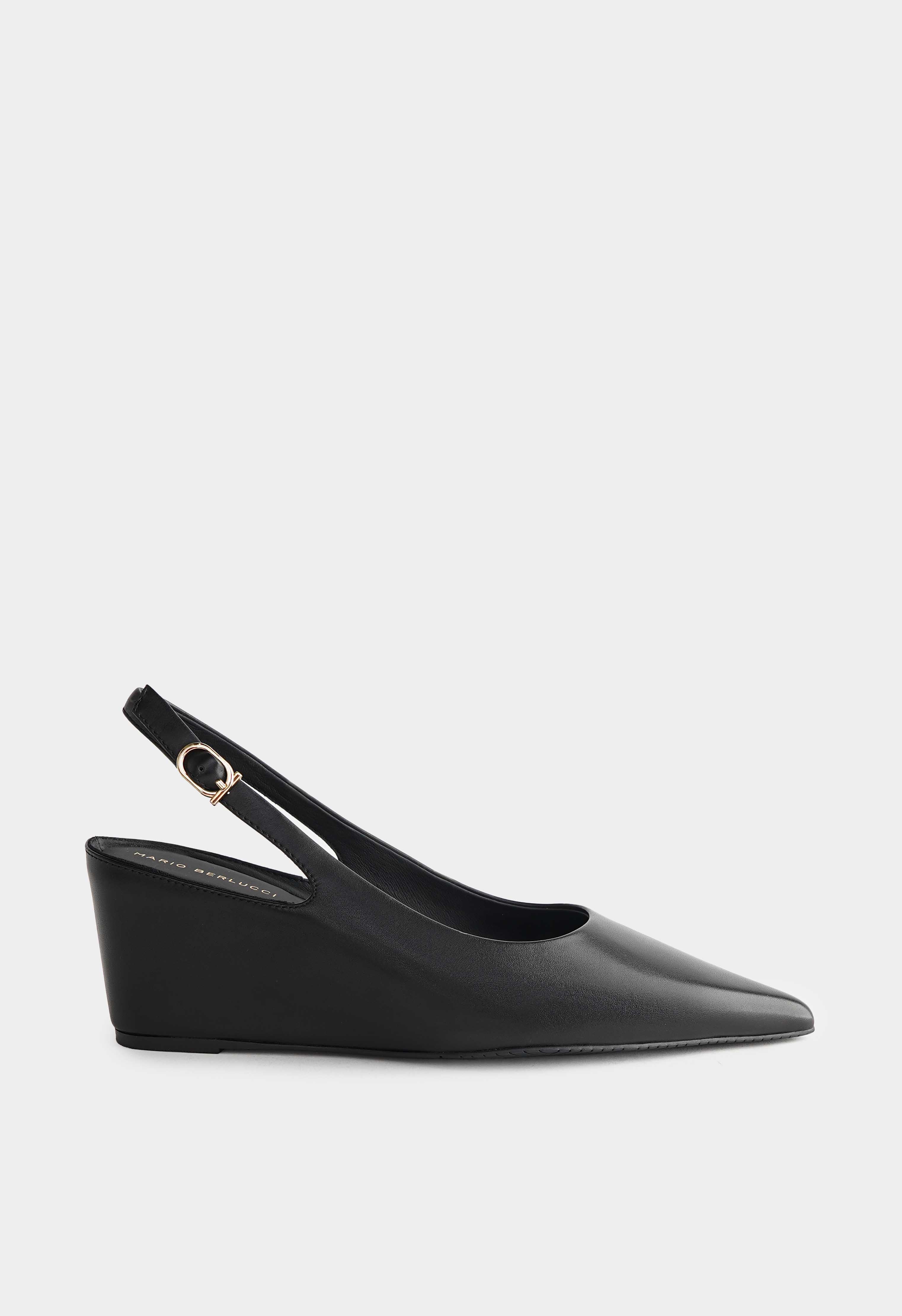 Элегантные черные туфли из натуральной кожи – идеальный баланс комфорта и утонченного стиля. Заостренный мысок визуально вытягивает силуэт, добавляя образу изюминки, а аккуратная золотая пряжка становится стильным акцентом. Удобная танкетка обеспечивает устойчивость и легкость шага в течение всего дня, в то время как гибкая подошва дарит максимальный комфорт. Универсальная модель, которая гармонично дополнит как деловые, так и вечерние образы.