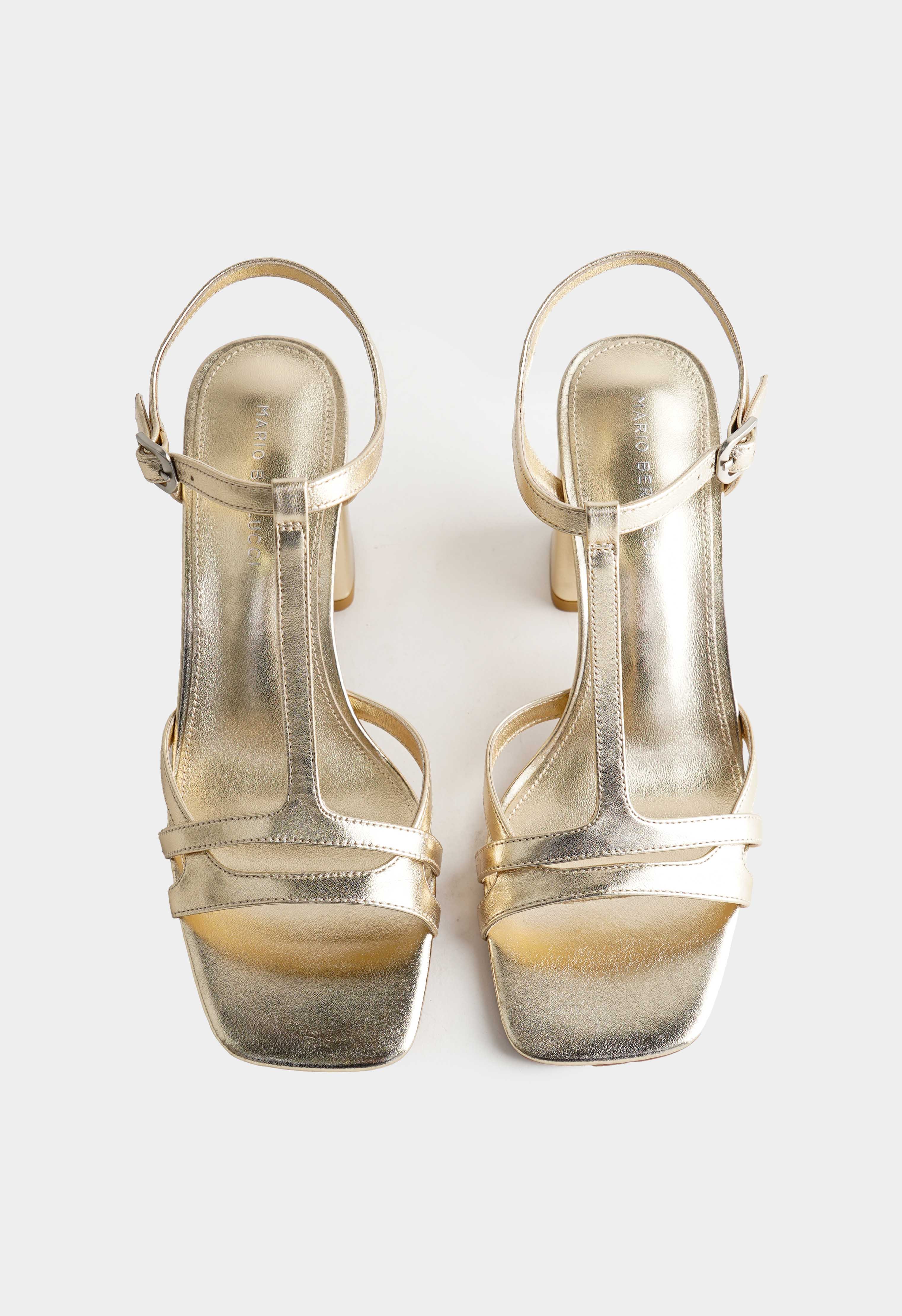 Золотые босоножки из натуральной кожи – элегантная пара, которая добавляет образу мягкое сияние и сразу делает его более праздничным. Тонкие ремешки красиво обрамляют стопу, открытый мысок подчеркивает легкость силуэта и аккуратный педикюр. Трапециевидный каблук выглядит современно и дает устойчивую высоту, сохраняя уверенный шаг. Серебряная пряжка добавляет аккуратный контрастный акцент и помогает точно отрегулировать посадку. Жесткая подошва держит форму и обеспечивает стабильную опору.