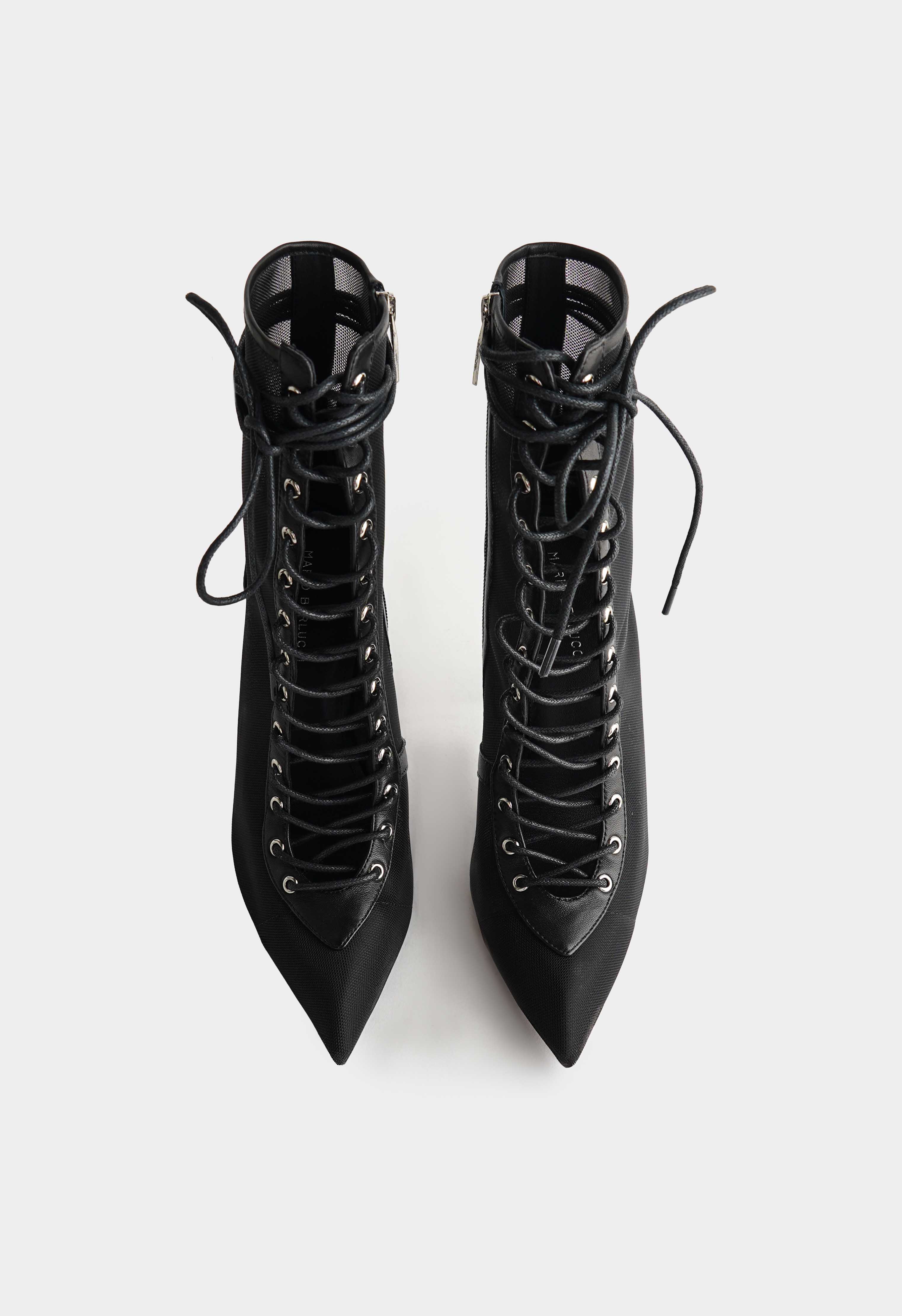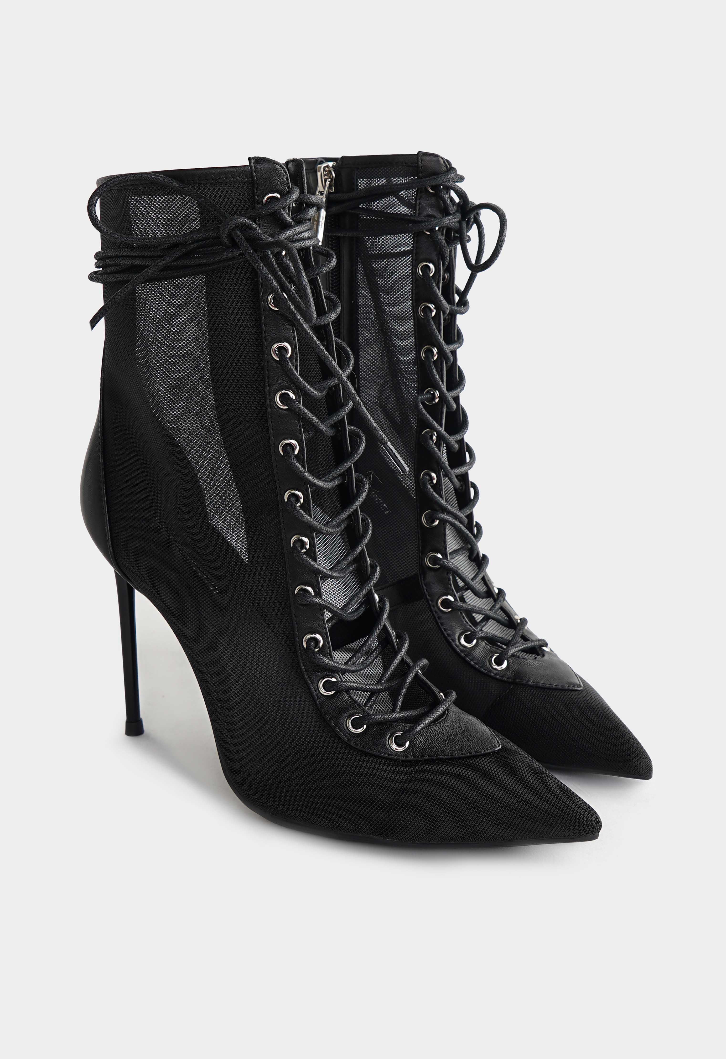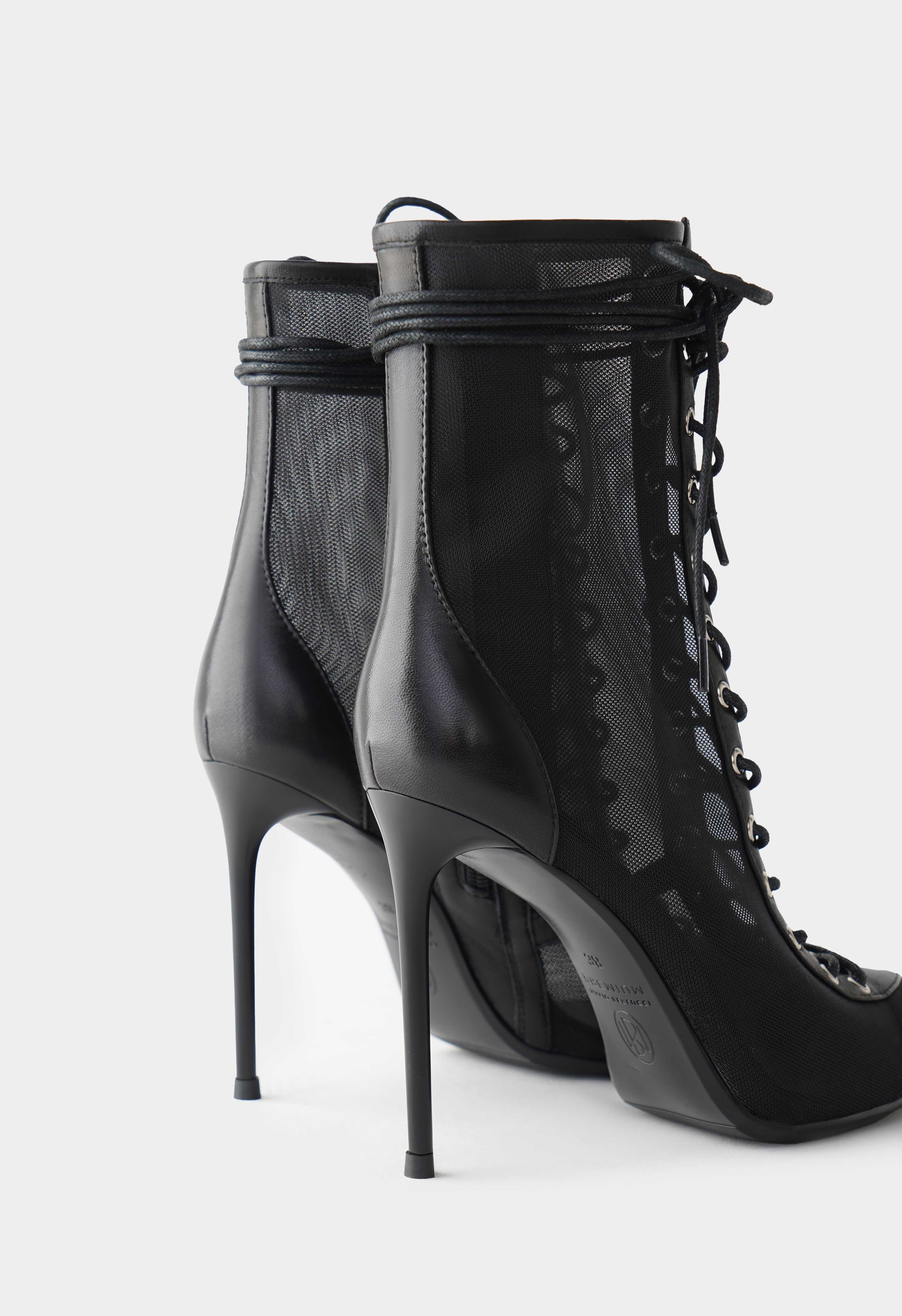 Эффектные черные ботильоны с серебряной фурнитурой – выбор для тех, кто любит смелые и безупречно стильные образы. Сочетание натуральной кожи и текстиля создает выразительный силуэт с легким акцентом на дерзкую элегантность, заостренный мысок визуально вытягивает ногу, а высокая шпилька делает походку особенно грациозной. Молния и шнуровка обеспечивают удобную посадку и добавляют модели характер, в то время как гибкая подошва дарит комфорт в движении. Идеальная пара для ярких выходов, когда хочется выглядеть эффектно и уверенно.