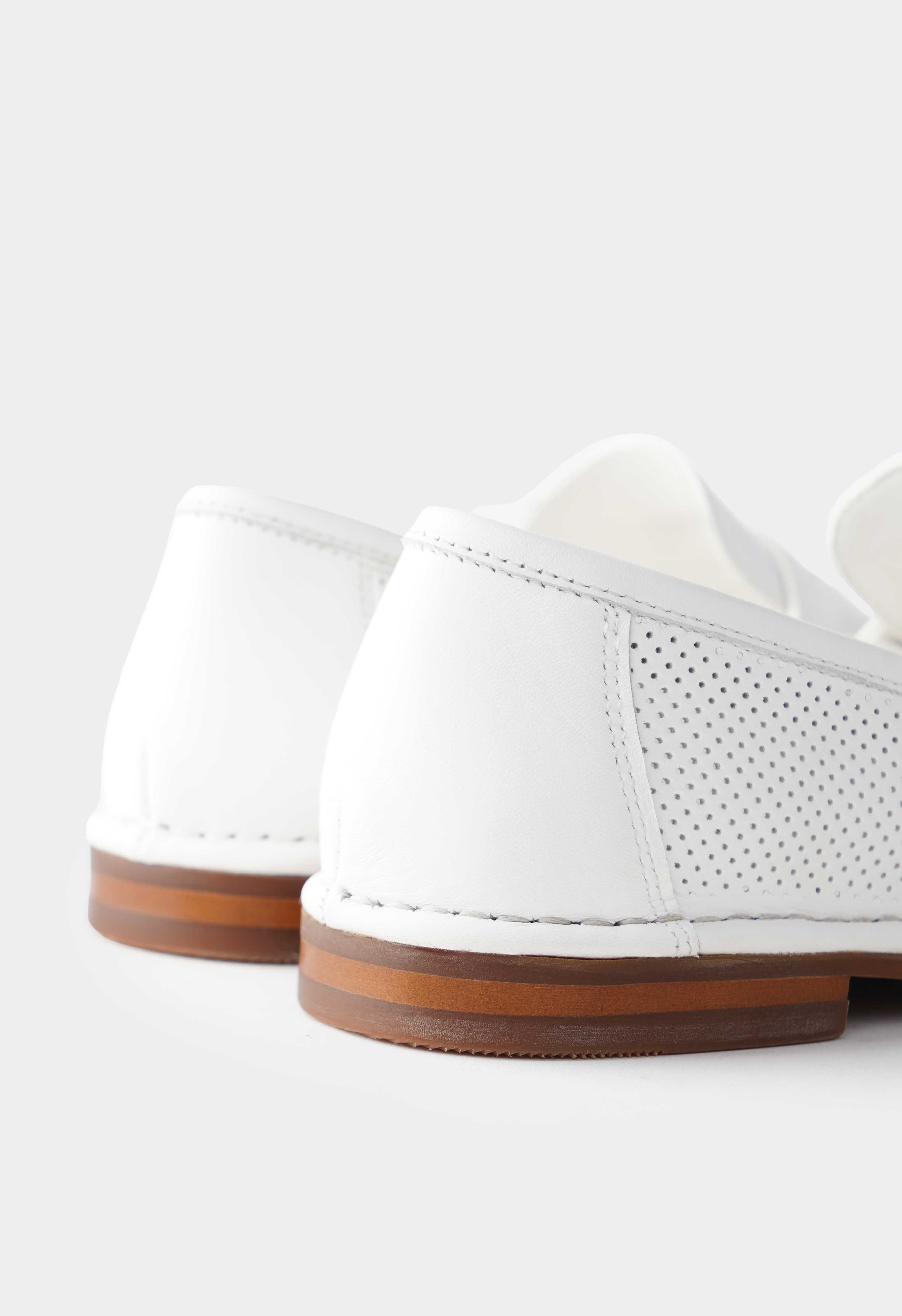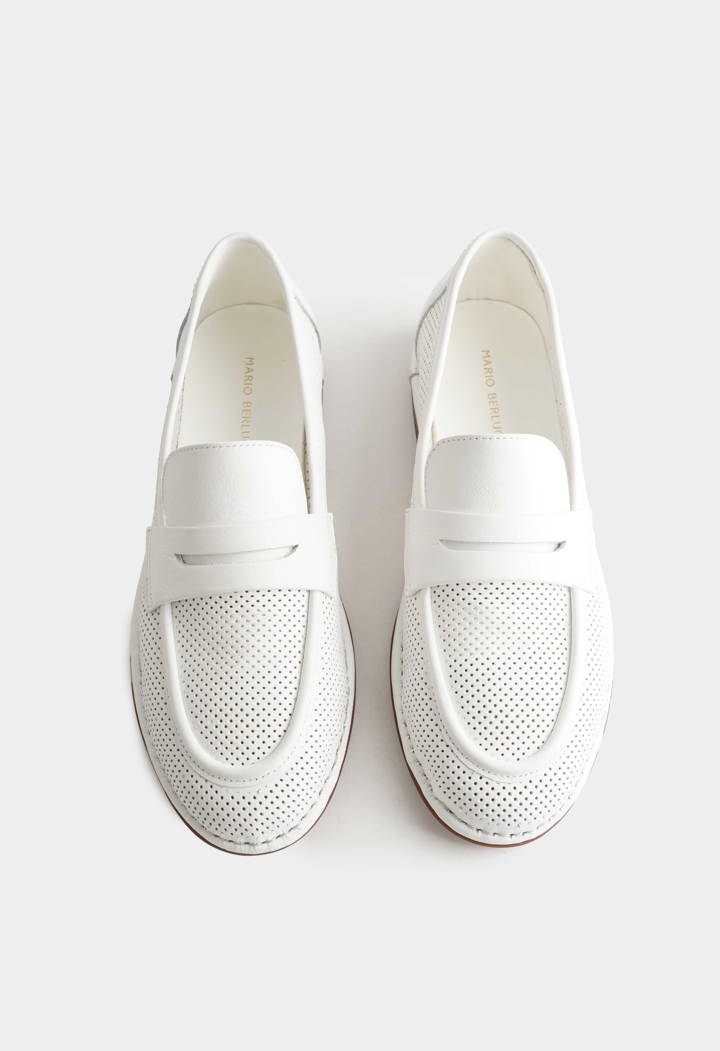 Белые лоферы из натуральной кожи – легкая, аккуратная пара, которая смотрится свежо в любом гардеробе. Мелкая перфорация добавляет воздушности и помогает сохранять комфорт в теплые дни, а округлый мысок обеспечивает удобную посадку и мягкий силуэт. Едва заметный венский каблук обеспечивает деликатную посадку и подходит для активного дня. Гибкая подошва приятно сгибается при ходьбе и поддерживает легкий шаг.
