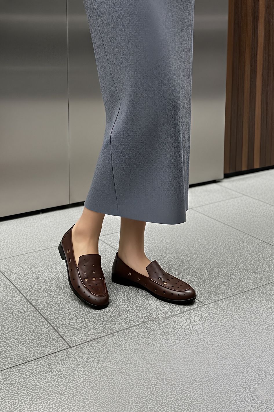 Женские лоферы из натуральной кожи с перфорацией обеспечивают стиль и комфорт в любое время года. Большие вырезы делают обувь максимально дышащей, а мягкая внутренняя отделка из натуральной кожи заботится о стопе. Коричневый цвет и квадратный мысок создают современный и элегантный образ, а гибкая подошва и устойчивый венский каблук обеспечивают удобство при ходьбе весь день. Эти лоферы идеально подходят для повседневной носки, офиса и прогулок, сочетая качество натуральных материалов с модным дизайном.