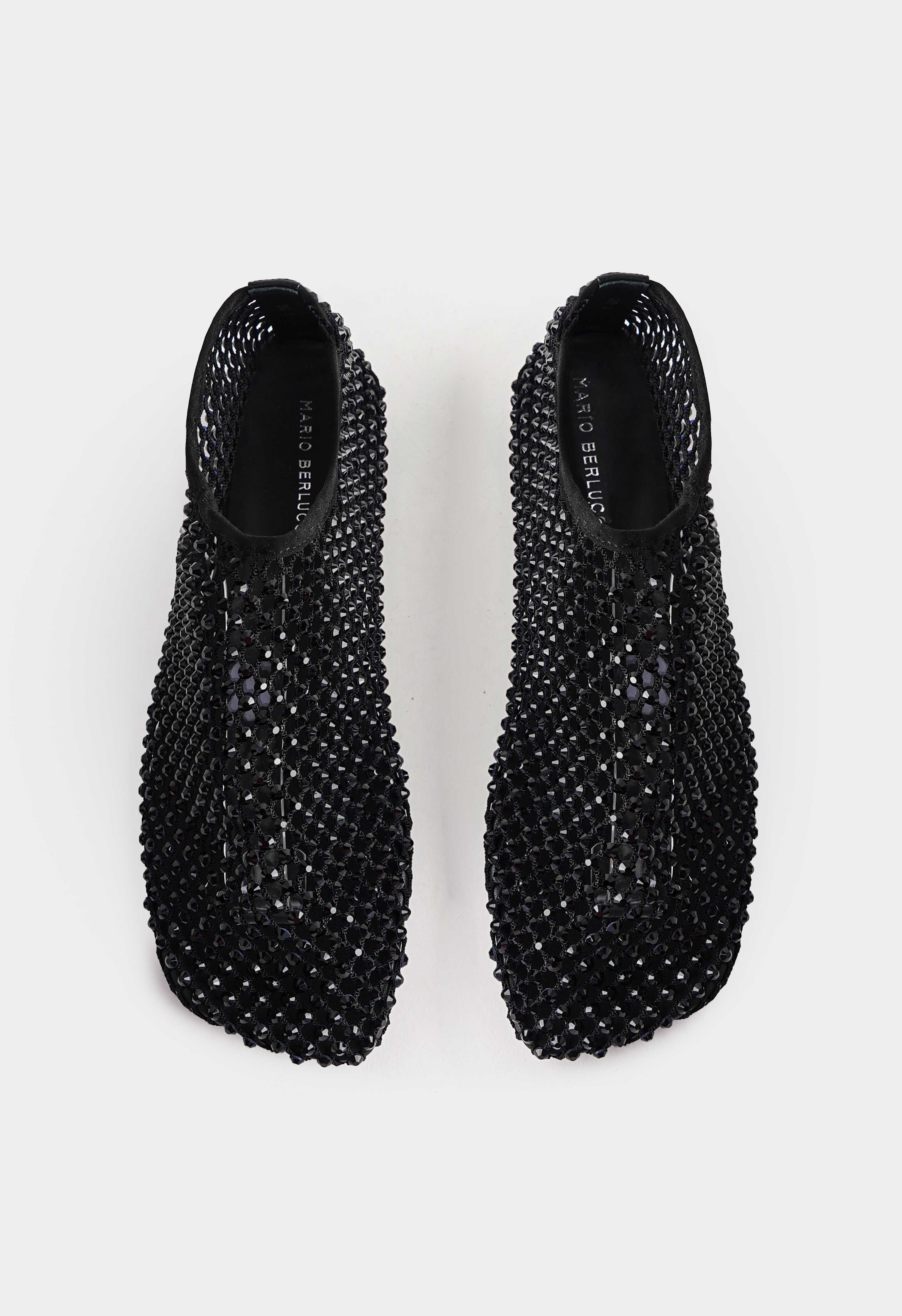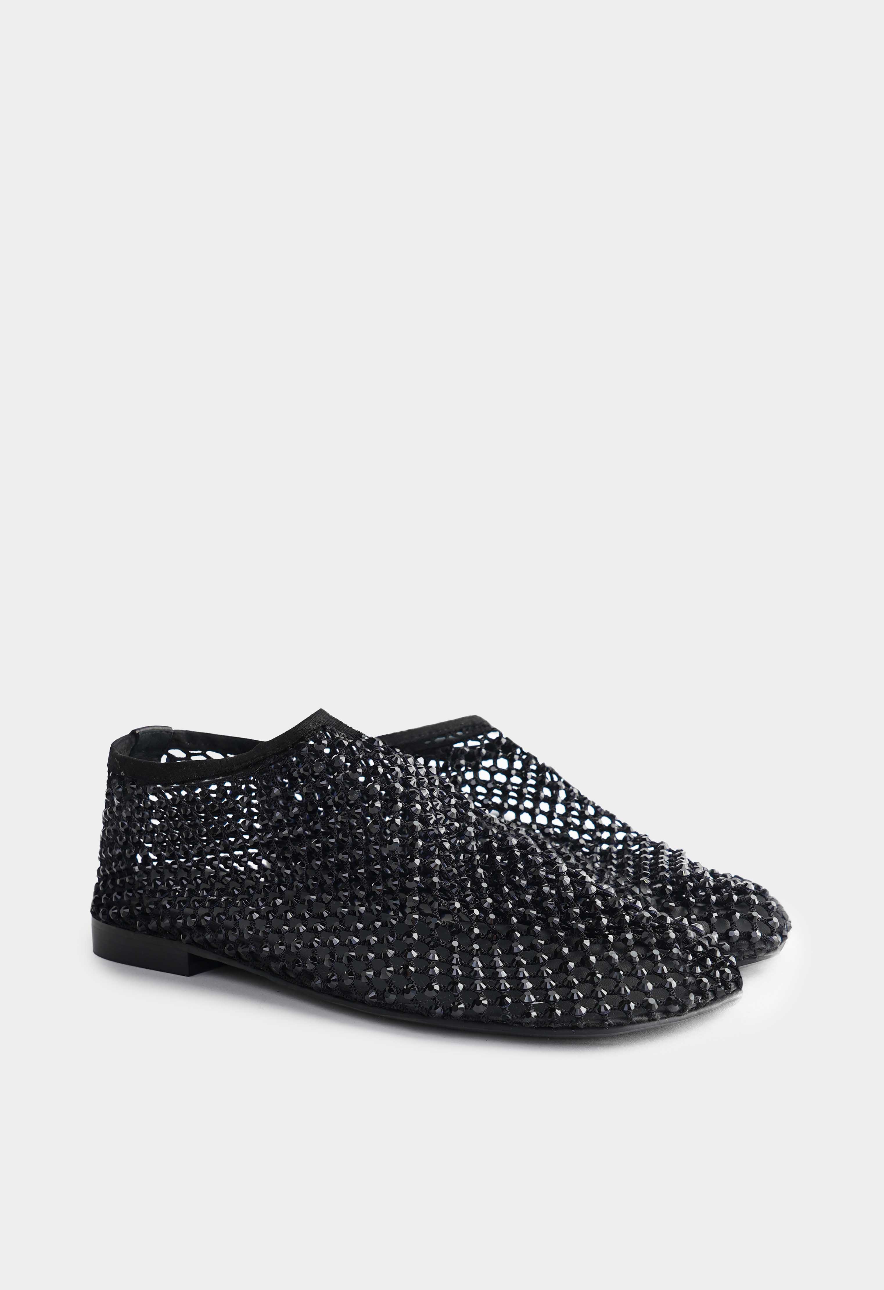 Черные балетки с эффектной сетчатой фактурой – пара, которая выглядит легкой, но сразу притягивает взгляд благодаря сиянию черных страз. Текстильный верх создаёт воздушный силуэт, квадратный мысок добавляет современную геометрию и делает образ более собранным. Стразы красиво мерцают при движении и превращают балетки в заметный акцент даже в простом комплекте. Жесткая подошва держит форму и обеспечивает стабильную опору.