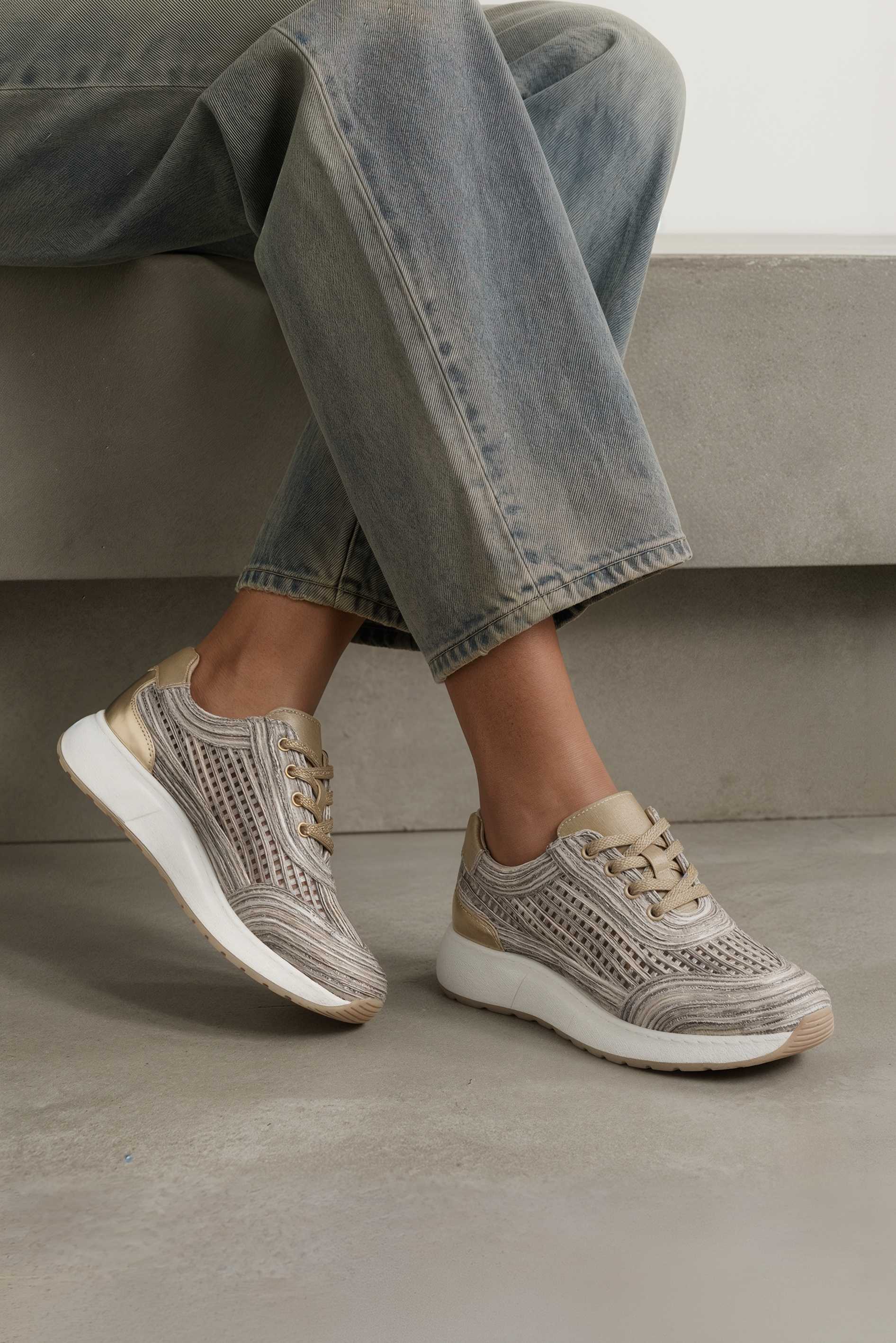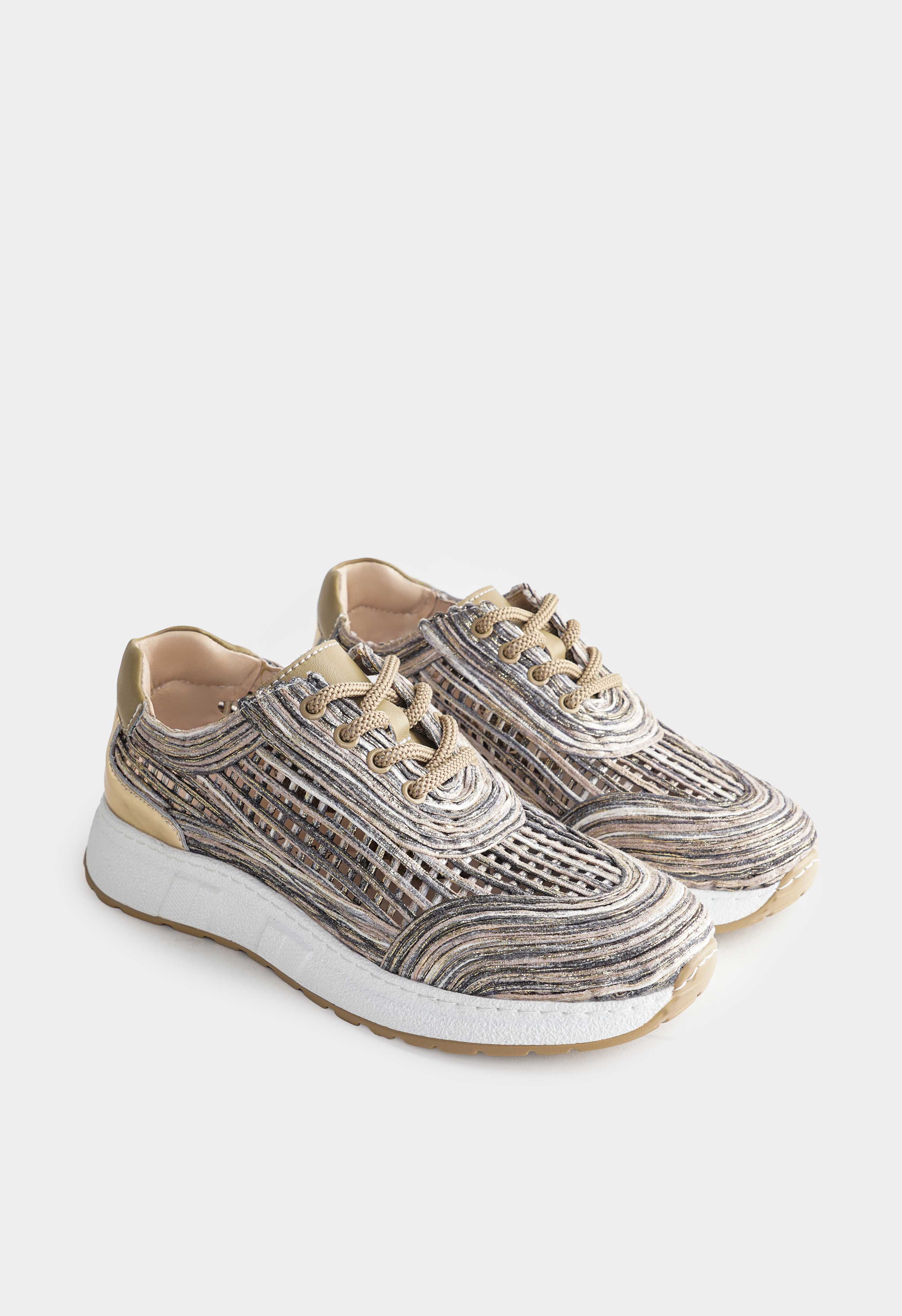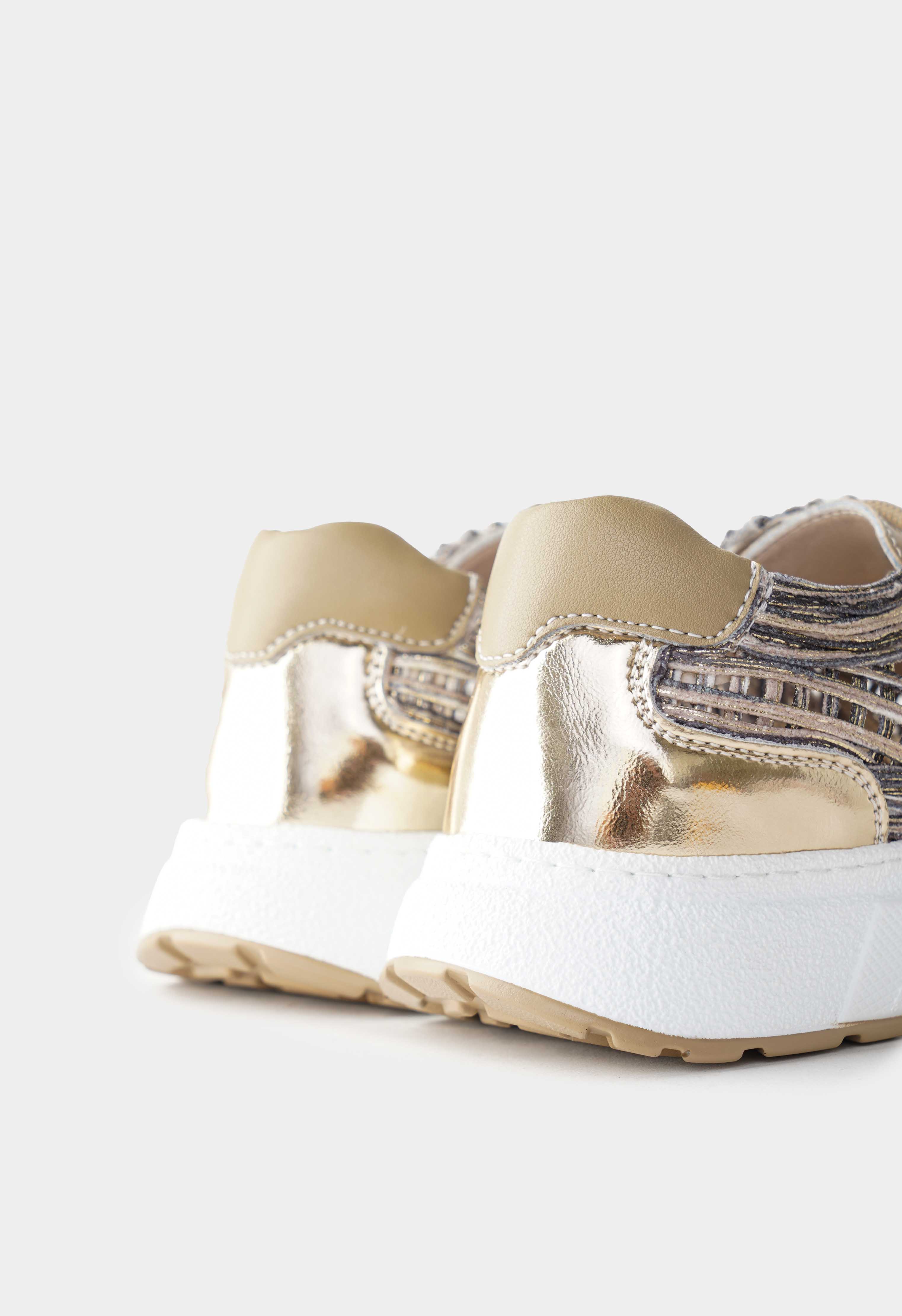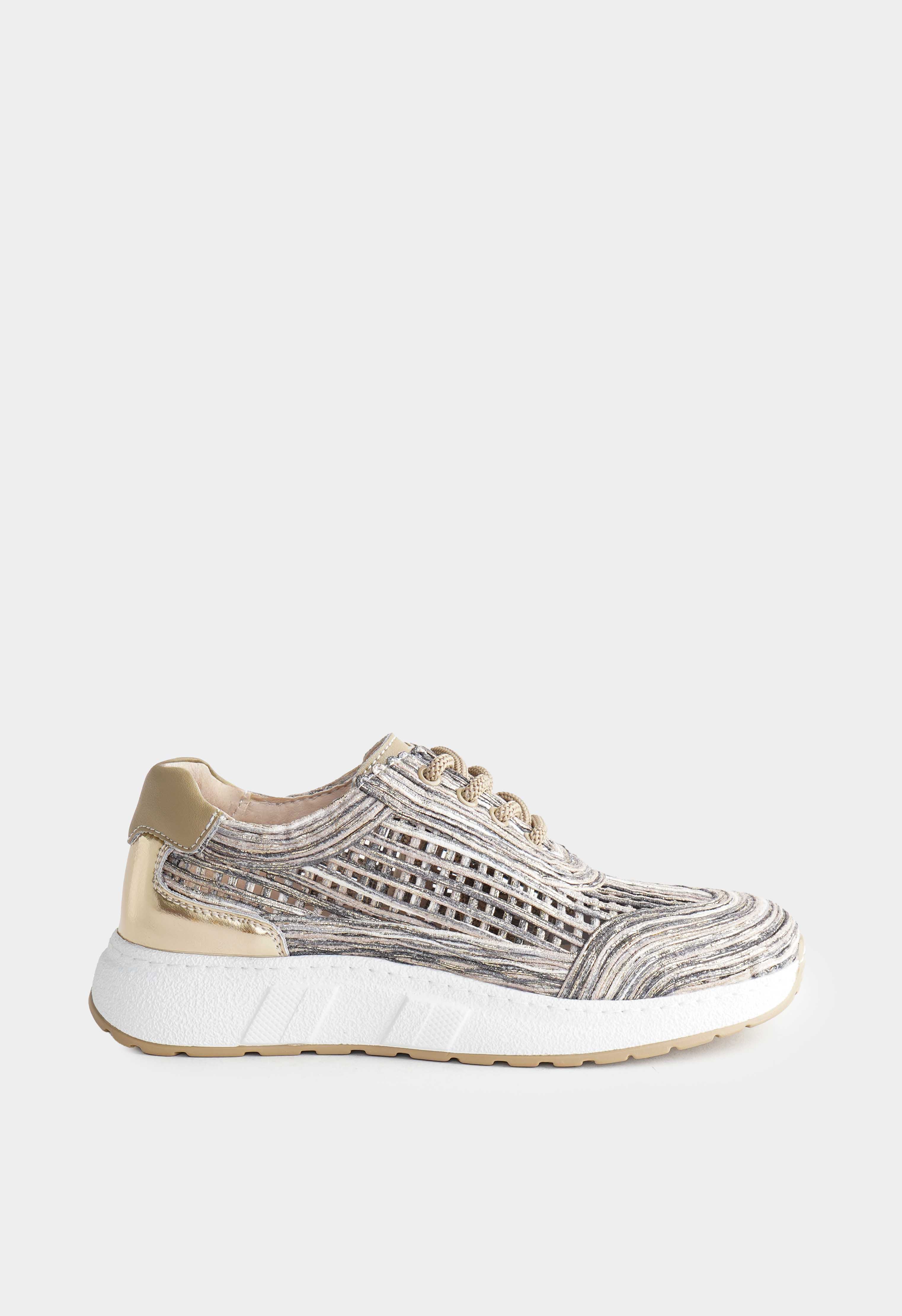 Эти текстильные кроссовки в благородном золотом оттенке представляют собой воплощение элегантности и комфорта. Округлый мысок обеспечивает мягкую посадку, платформа придает уверенности в походке, а бежевая фурнитура добавляет утонченный акцент. Гибкая подошва гарантирует отличную амортизацию и свободу движений на протяжении всего дня.