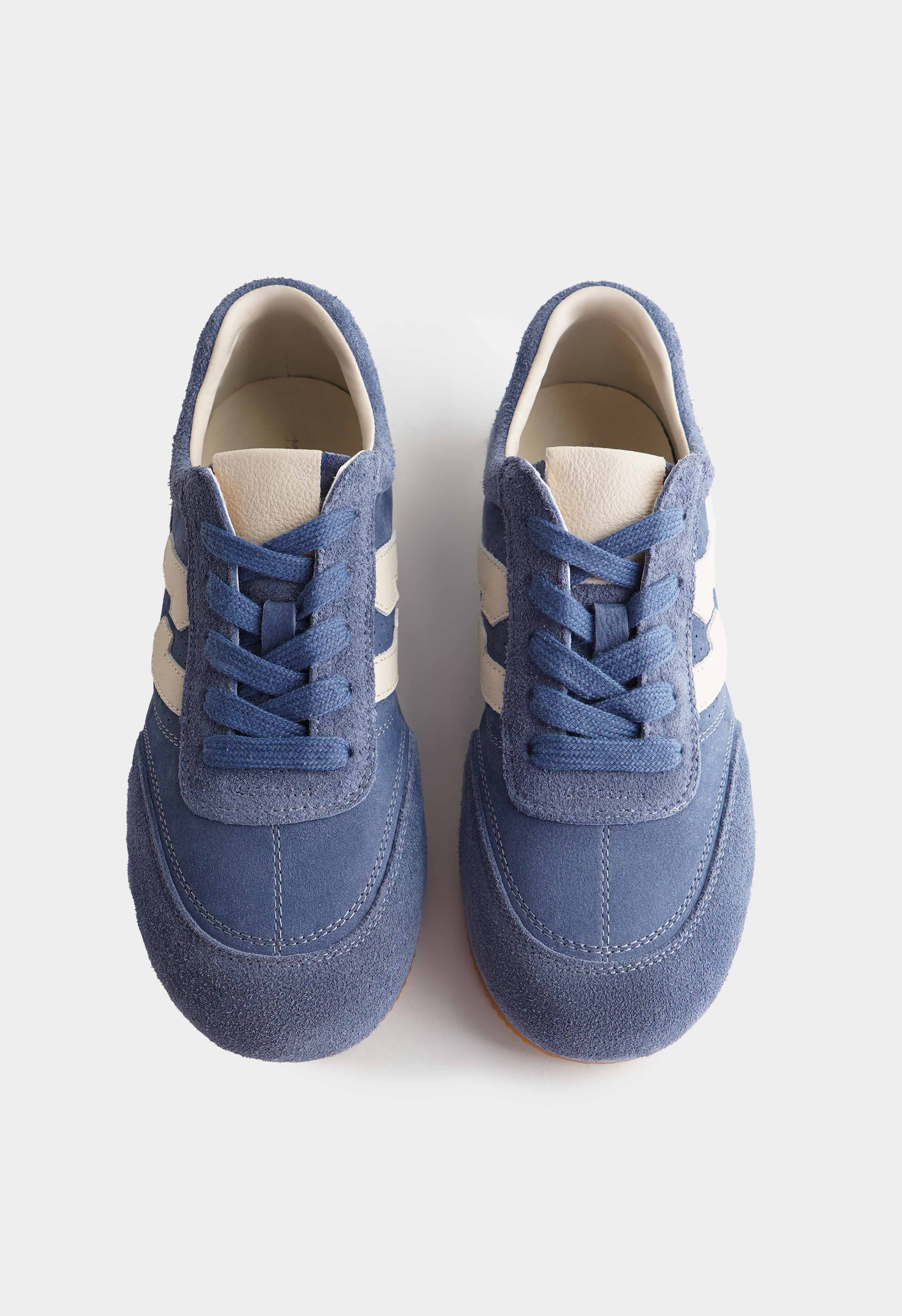 Синие кроссовки из натуральной замши – стильная пара с мягкой бархатистой фактурой и свежим контрастом светлых деталей. Округлый мысок обеспечивает комфортную посадку на каждый день, а аккуратная шнуровка помогает точно отрегулировать фиксацию по стопе. Платформа добавляет рост и делает силуэт более собранным, при этом не утяжеляет образ. Гибкая подошва приятно амортизирует и легко сгибается при ходьбе.
