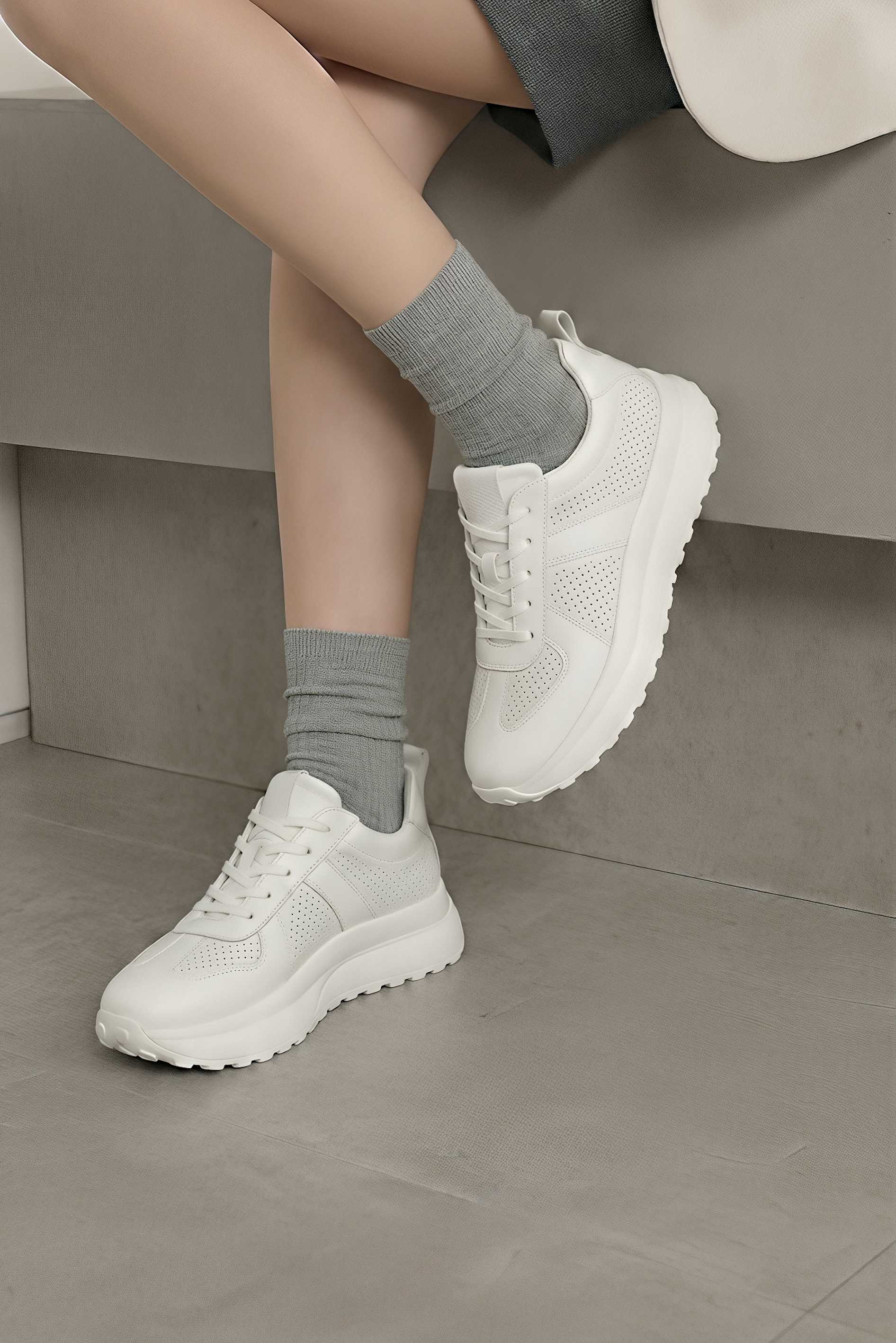 Белые кроссовки из натуральной кожи – практичная и стильная пара на каждый день с легким спортивным характером. Гладкий кожаный верх с аккуратной перфорацией смотрится современно и помогает поддерживать комфортный микроклимат, а округлый мысок обеспечивает удобную посадку без давления. Классическая шнуровка надежно фиксирует стопу и позволяет точно настроить посадку. Удобная платформа добавляет рост, визуально вытягивает силуэт и смягчает шаг, в то время как гибкая подошва хорошо амортизирует и легко сгибается при ходьбе.
