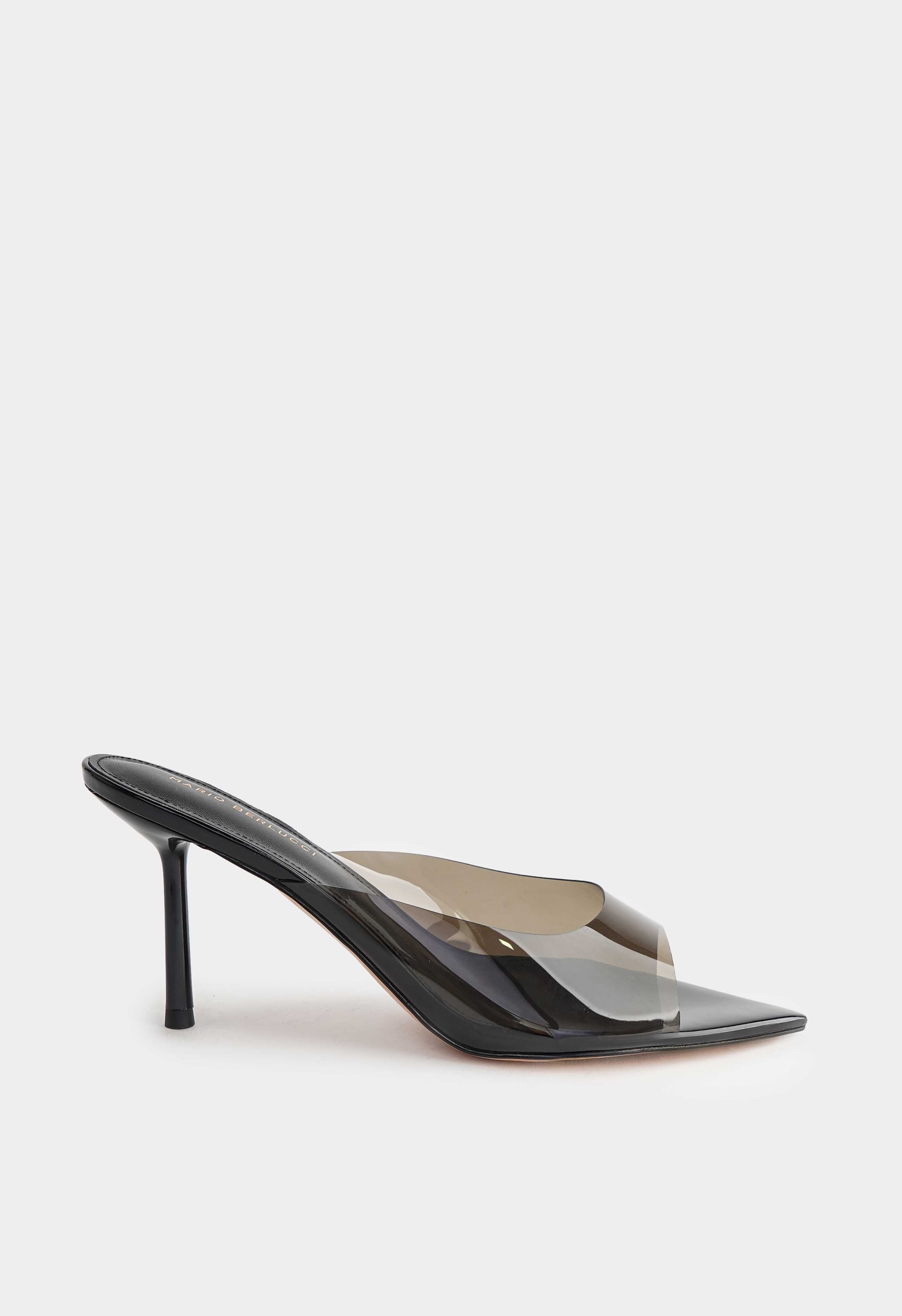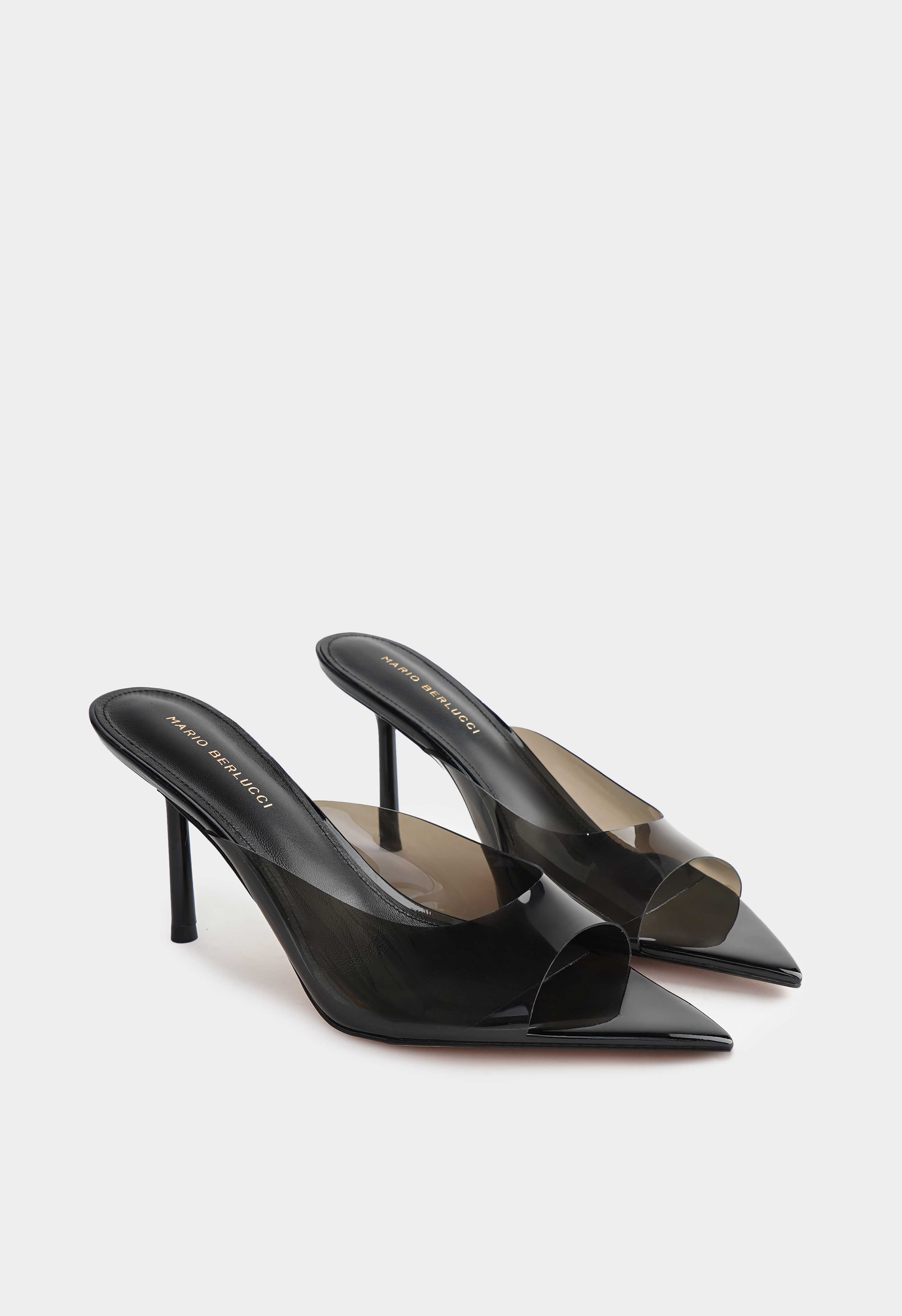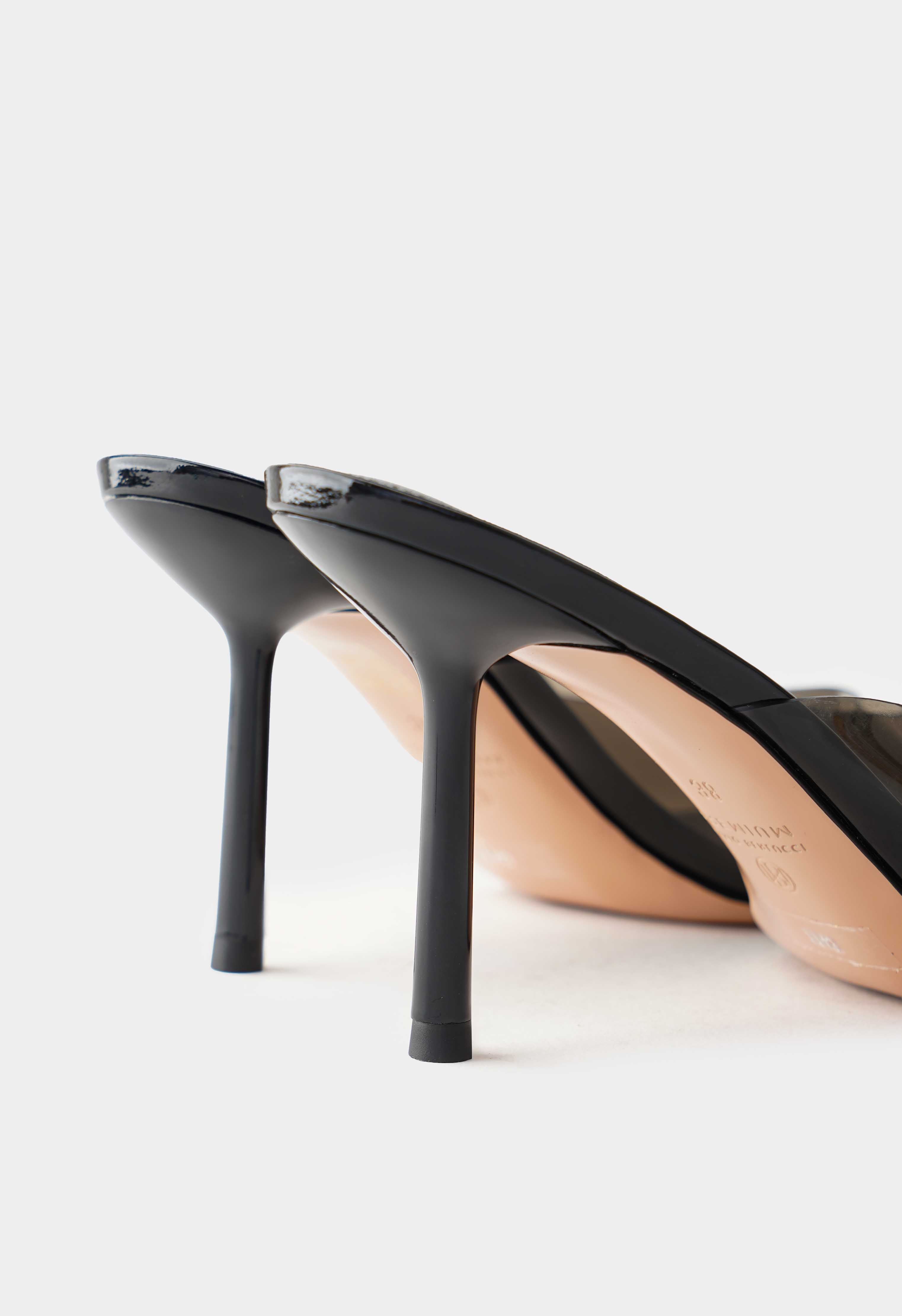 Черные мюли из плексигласа и натуральной кожи выглядят легко и очень эффектно за счет полупрозрачного верха и чистого оттенка. Открытый мысок добавляет летнего настроения и красиво подчеркивает педикюр, а гладкая кожаная отделка делает силуэт аккуратным. Тонкая шпилька придает изящную высоту и визуально вытягивает ноги, сохраняя легкость образа. Жесткая подошва держит форму и обеспечивает стабильную опору – идеальная пара для мероприятий, вечера и стильных выходов.