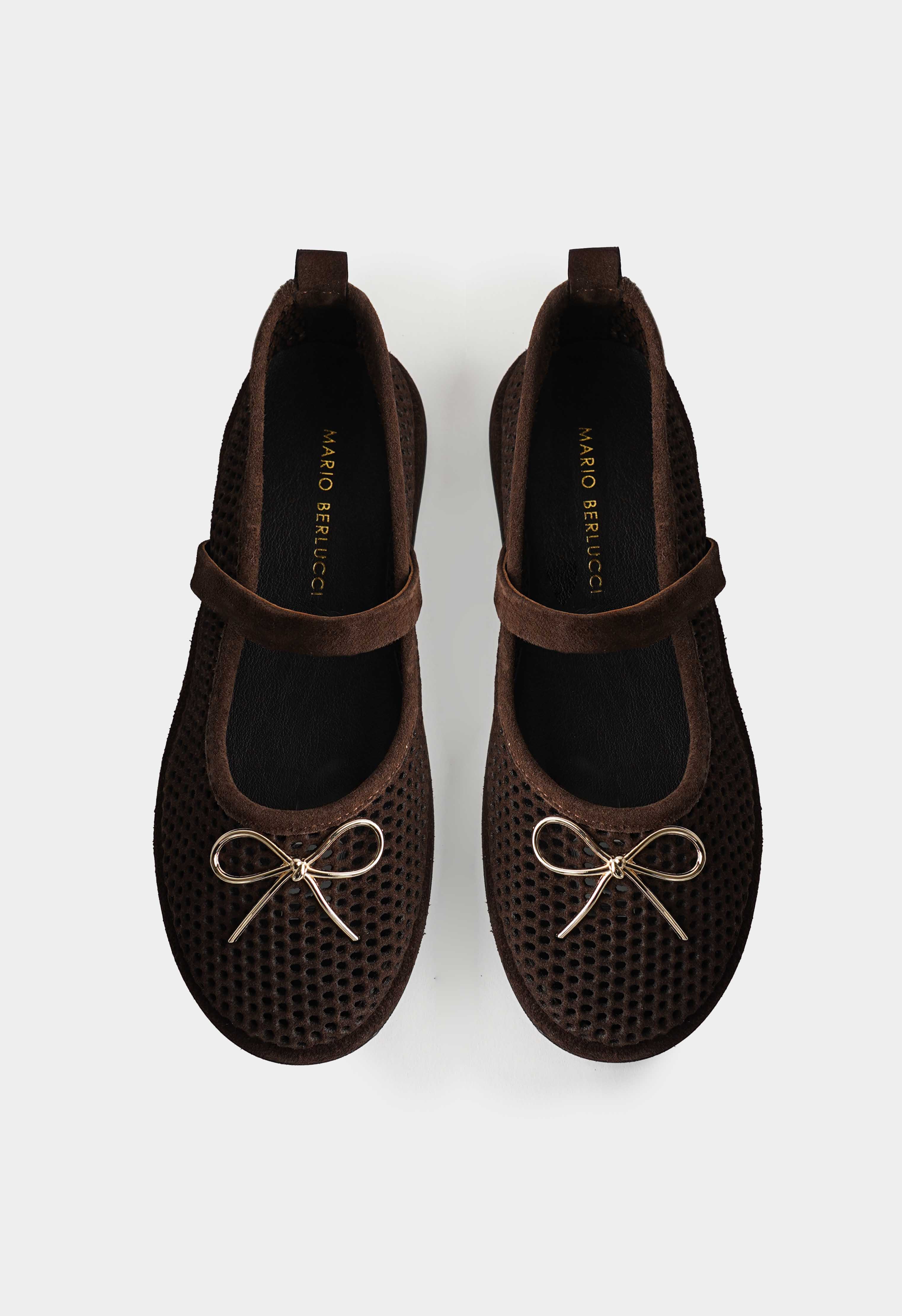 Коричневые балетки из натуральной замши – идеальное сочетание уюта и изящности: перфорированная фактура придает модели легкость и оригинальность, а округлый мысок обеспечивает комфорт и мягкость в каждом шаге. Золотая фурнитура в виде аккуратного банта добавляет нежный акцент, втачная резинка гарантирует удобную посадку, в то время как венский каблук и гибкая подошва дарят устойчивость и свободу движений.