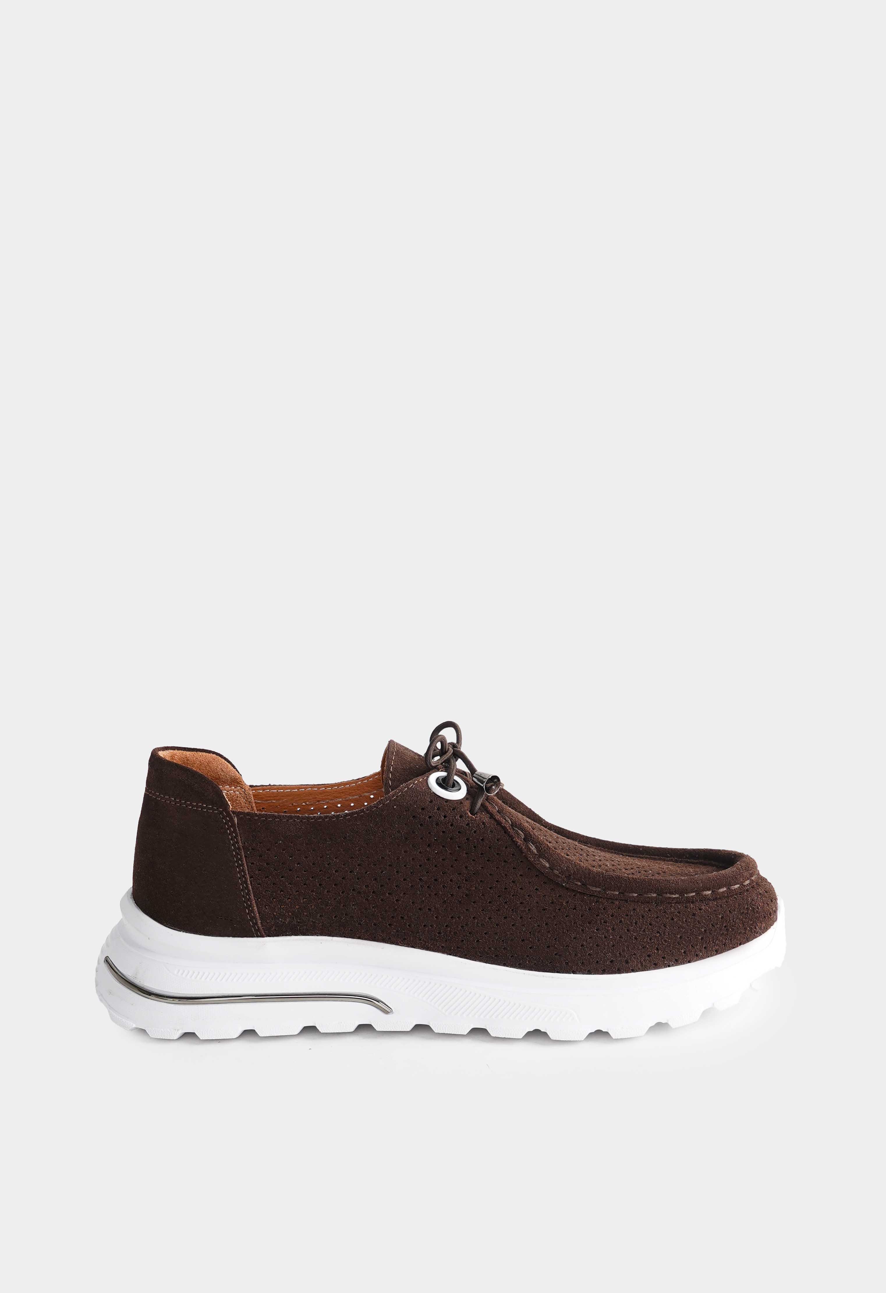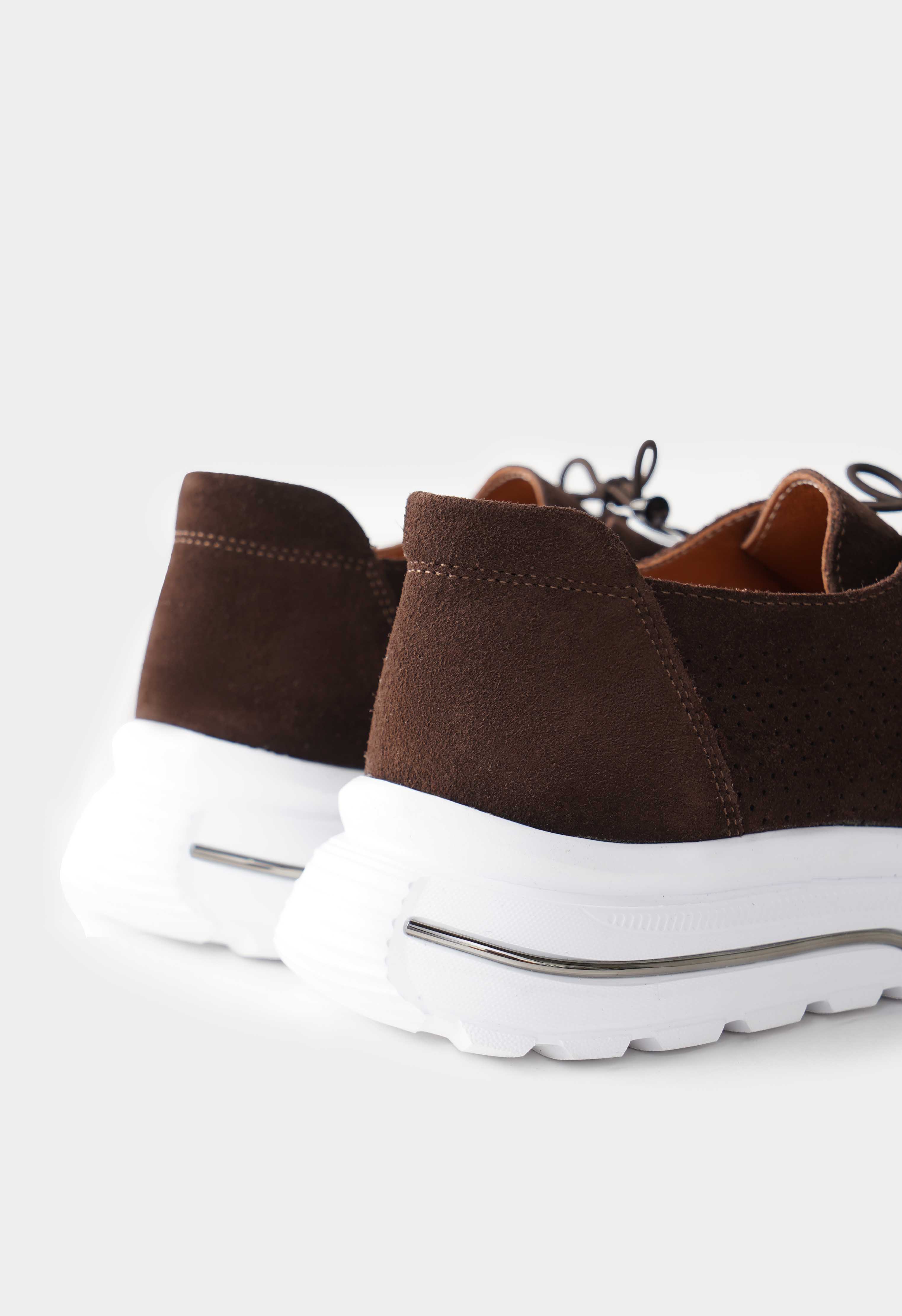 Коричневые кроссовки из натуральной замши – идеальное сочетание комфорта и современного стиля: мягкий оттенок делает модель универсальной, а перфорированная фактура добавляет легкости и обеспечивает дополнительную воздухопроницаемость. Округлый мысок дарит комфорт при носке, шнуровка с аккуратной металлической фурнитурой позволяет легко регулировать посадку, в то время как платформа визуально вытягивает силуэт. Гибкая подошва обеспечивает мягкость и свободу движений.