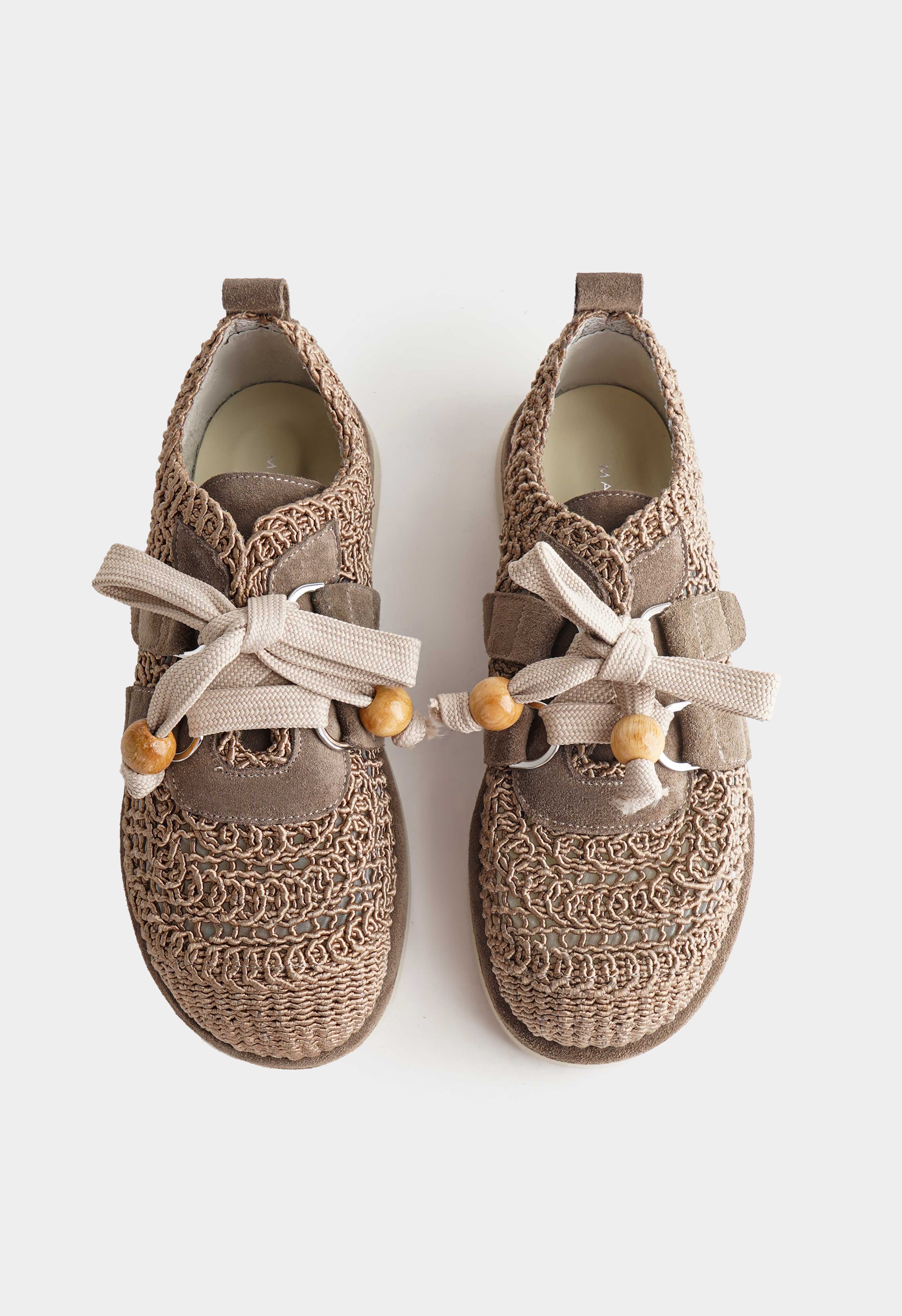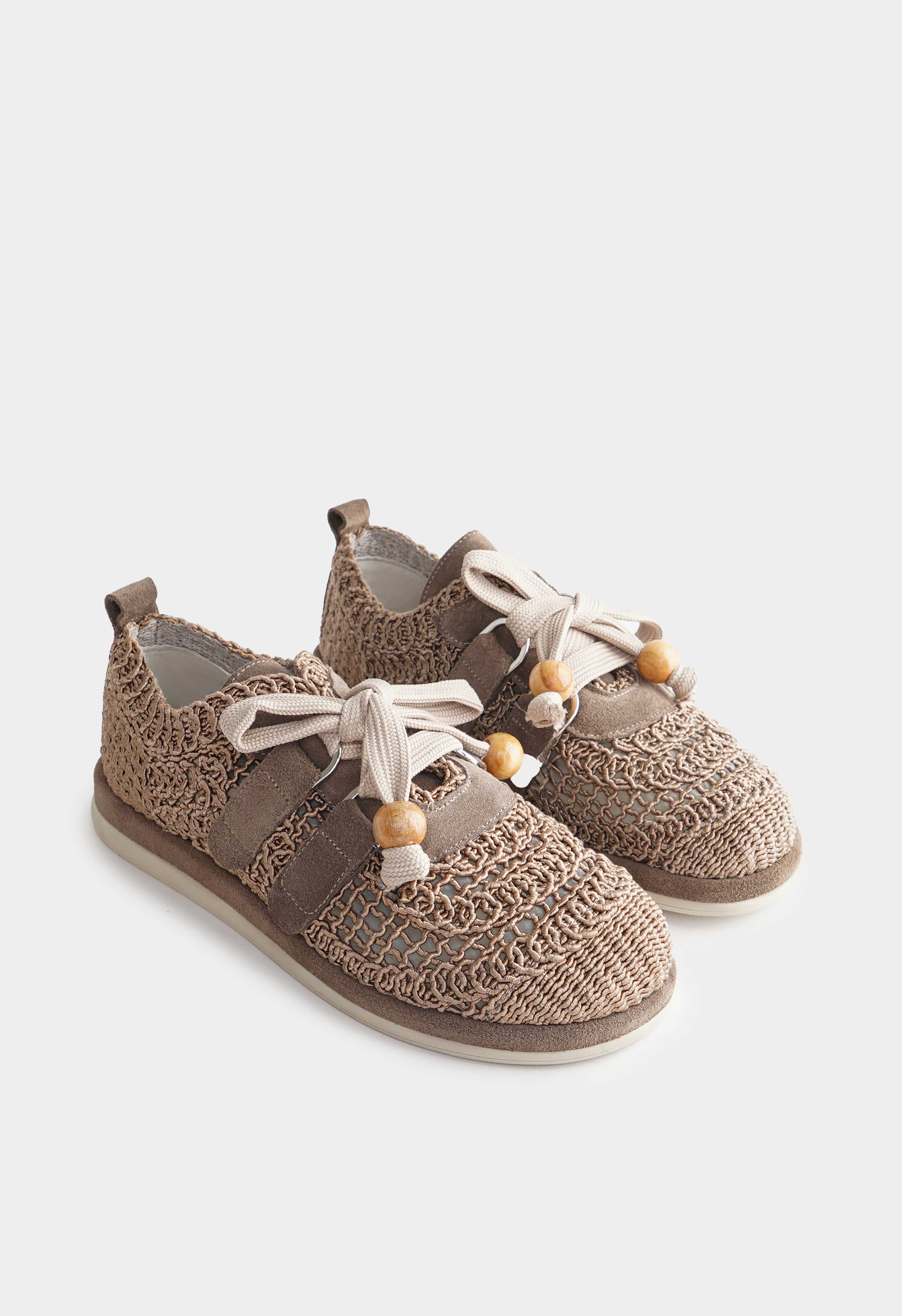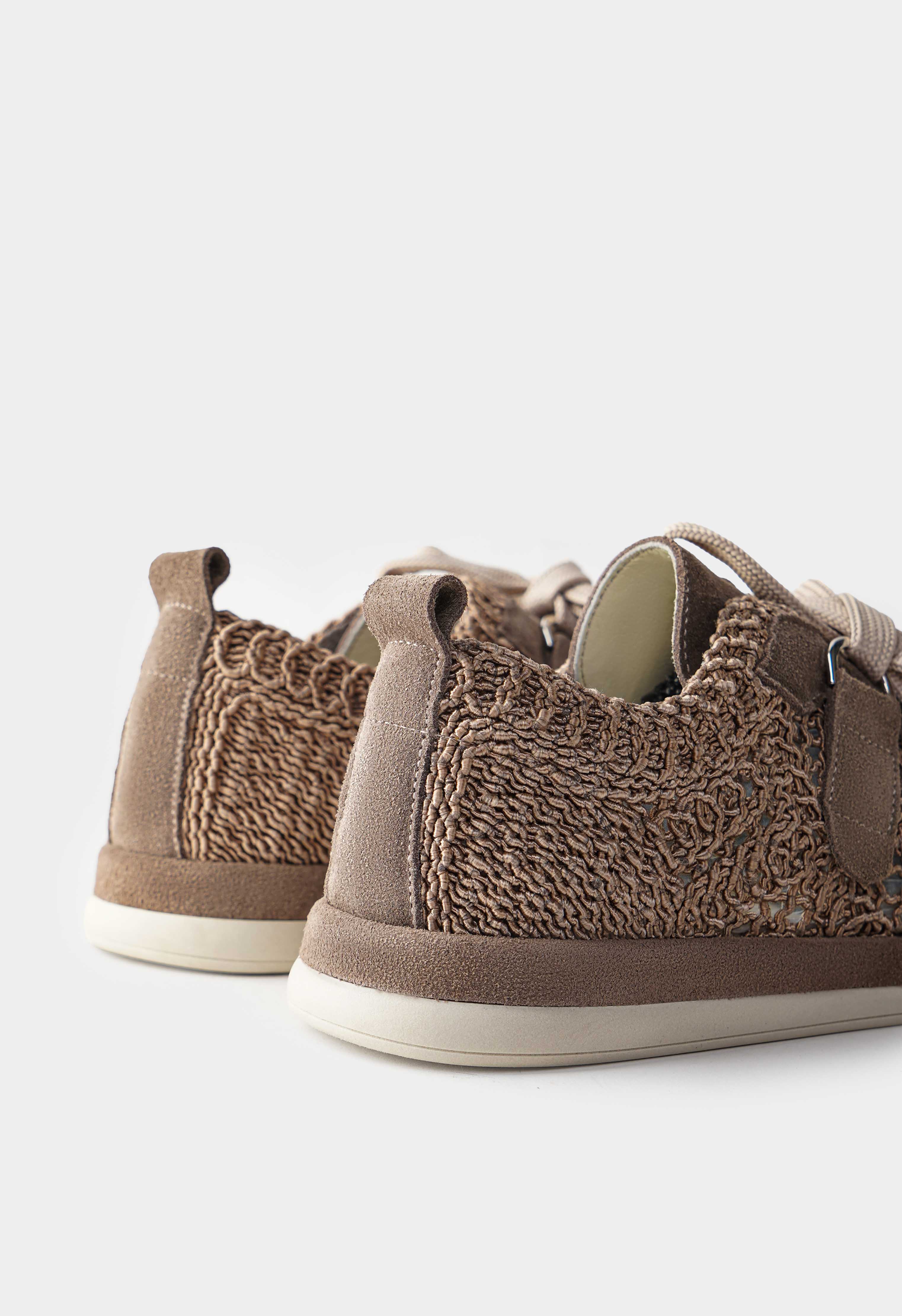 Оригинальные бежевые кроссовки из текстиля – стильное сочетание легкости и комфорта: фактурное плетение придает модели оригинальность и делает образ более выразительным, а округлый мысок обеспечивает удобную посадку. Шнуровка с декоративными элементами добавляет индивидуальности и позволяет отрегулировать посадку, в то время как платформа придает силуэту современный акцент. Гибкая подошва дарит мягкость и свободу движений.