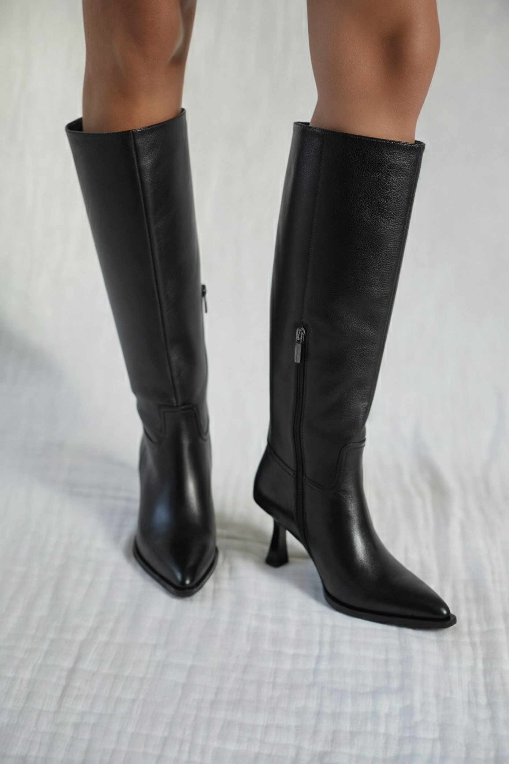 Сапоги из натуральной кожи чёрного цвета. Внутренний материал представлен байкой. Модель подчёркивают заострённый тип мыска и молния в цвете металлик. Комфорт при ходьбе обеспечивают гибкая подошва и устойчивый каблук. Чтобы выбрать наиболее комфортную модель, соответствующую вашим анатомическим особенностям, следует учесть полноту модели и характеристики стопы. Более подробную информацию по выбору размера и об особенностях модели предоставит наш менеджер.