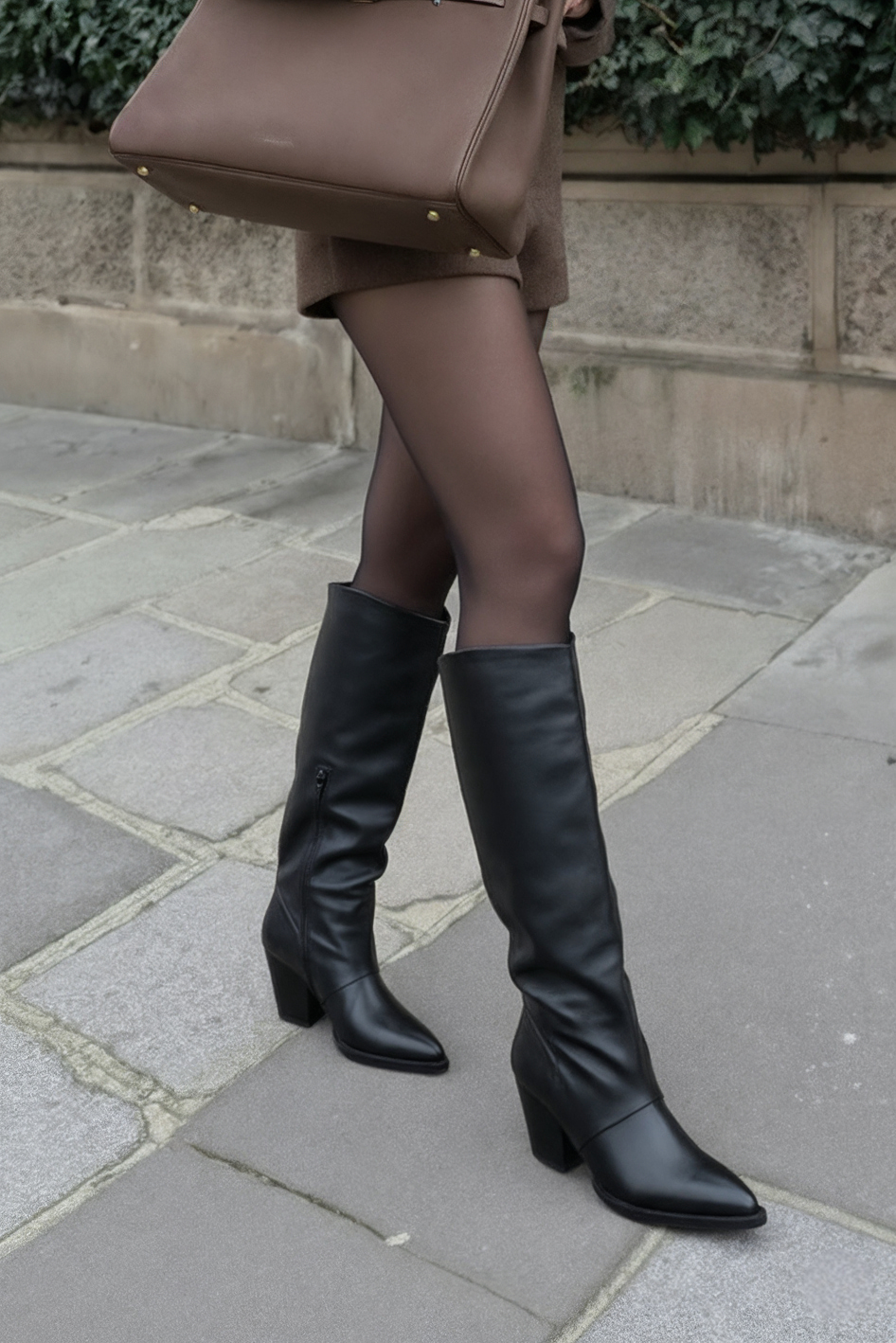 Черные сапоги из натуральной кожи с подкладкой из байки – это идеальное сочетание современного стиля и практичности. Заостренный мысок придает образу элегантность, а скошенный каблук делает силуэт изящным и женственным. Жесткая подошва обеспечивает надежную устойчивость и комфорт при ходьбе, делая обувь удобной для долгих прогулок и активного дня. Эта модель легко вписывается в повседневные образы и станет стильным акцентом как в деловом, так и в вечернем луке, подчеркивая уверенность и вкус своей обладательницы.