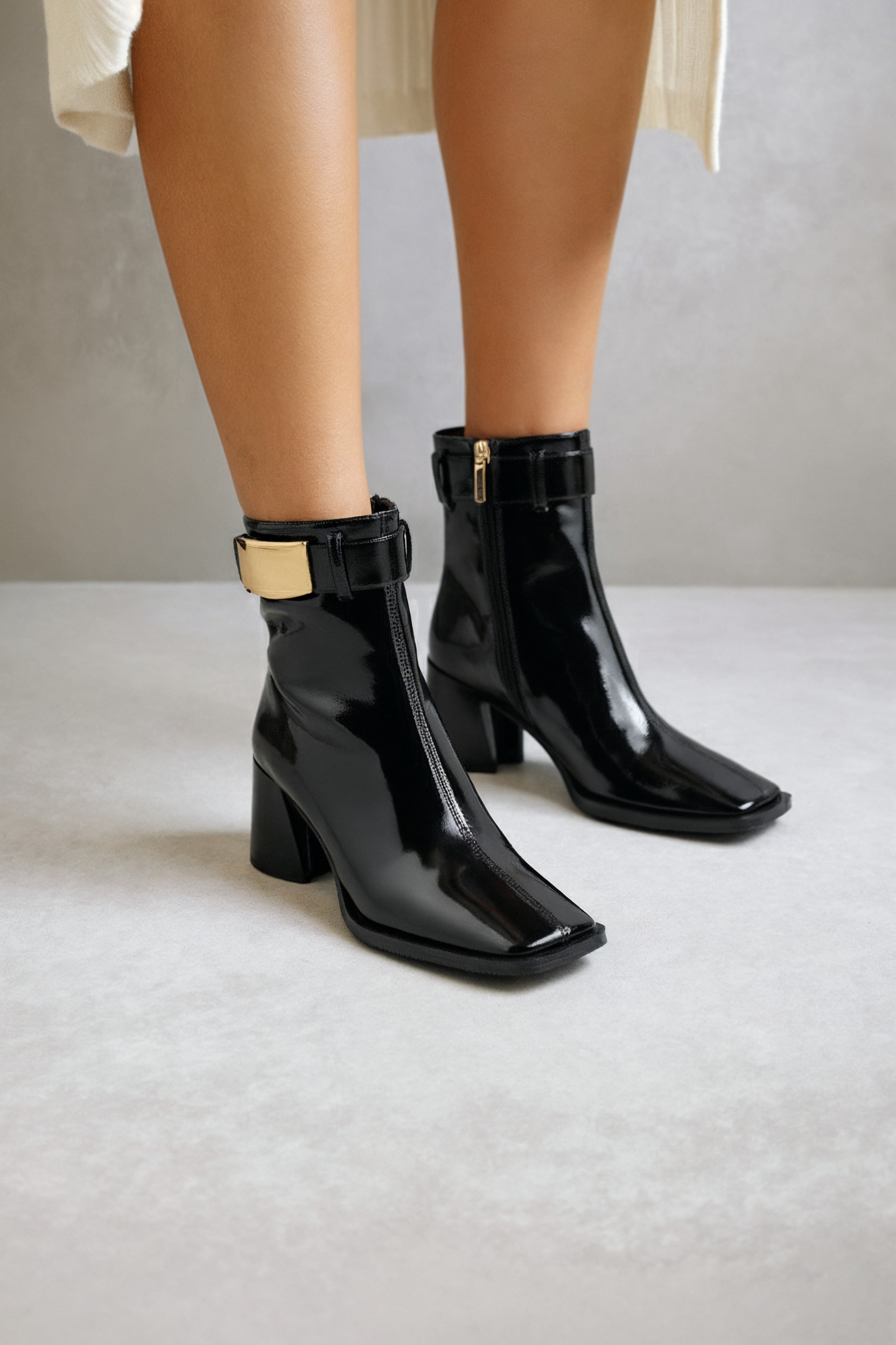 Ботильоны из чёрной лаковой кожи — модель, которая выгодно подчеркнёт утончённые образы. Для создания пары использовалась лаковая кожа, способная своим блеском привлечь внимание всех окружающих. Лаконичный дизайн, золотая фурнитура и удобная молния показывает на универсальность ботильонов. Модель поставлена на устойчивый широкий каблук и имеет удобную гибкую подошву для уверенной походки. Чтобы выбрать наиболее комфортную модель, соответствующую вашим анатомическим особенностям, следует учесть полноту модели и характеристики стопы. Более подробную информацию по выбору размера и об особенностях модели предоставит наш менеджер.