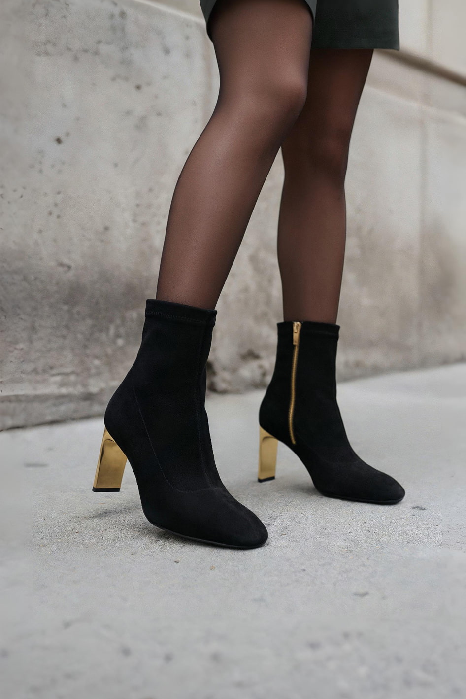 Актуальные ботильоны из чёрной натуральной замши – идеальный баланс между стилем и комфортом. Квадратный мысок и геометричный каблук создают модный силуэт, а гибкая подошва и молния обеспечивают лёгкость в носке. Золотая фурнитура придаёт завершённость образу, делая обувь идеальной для смелых и уверенных.