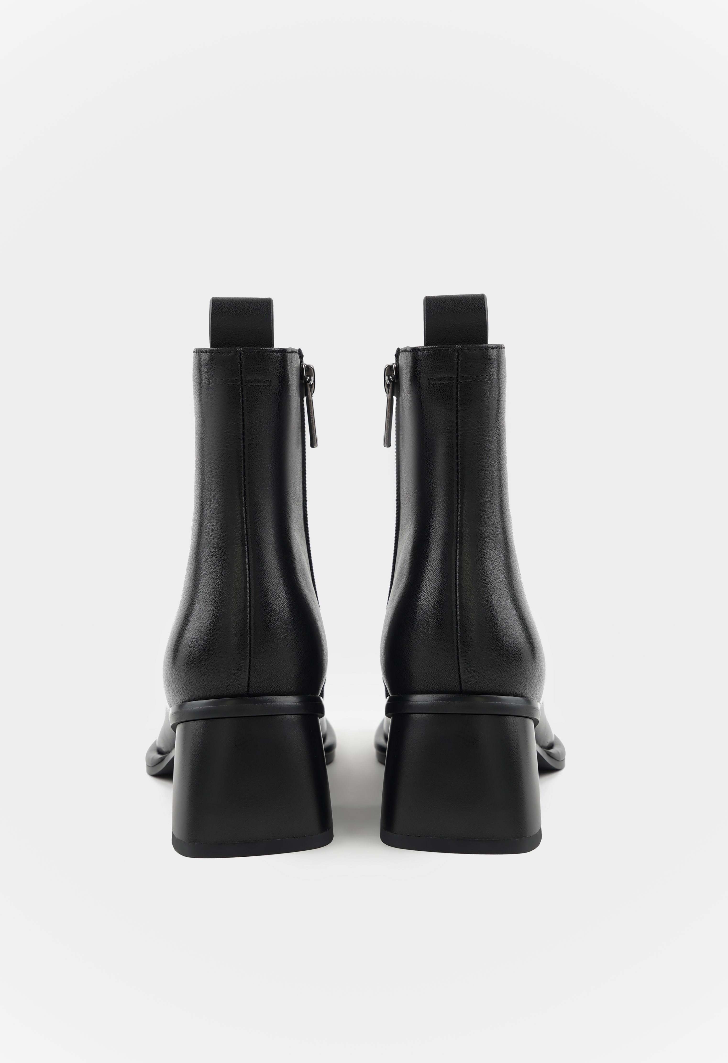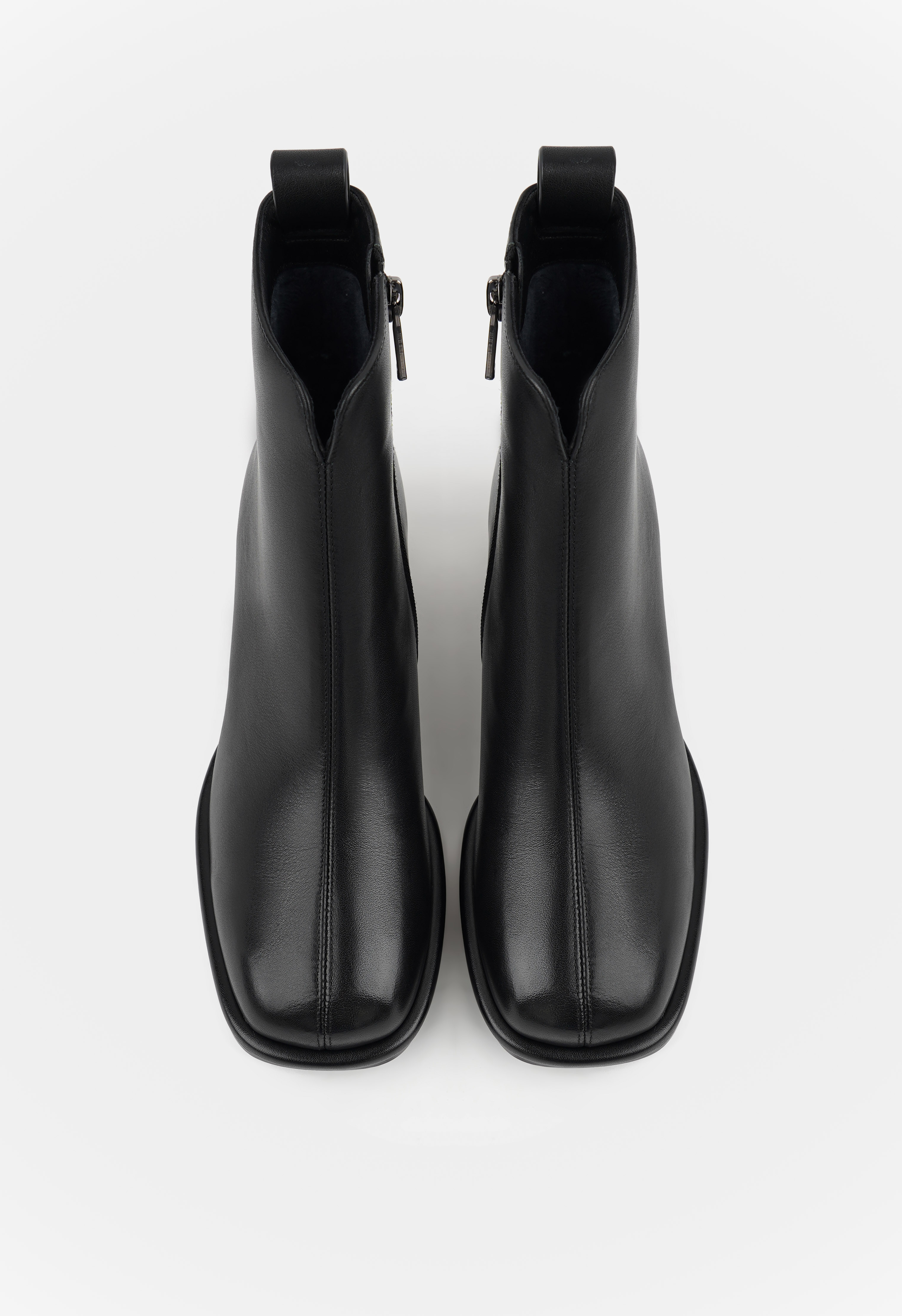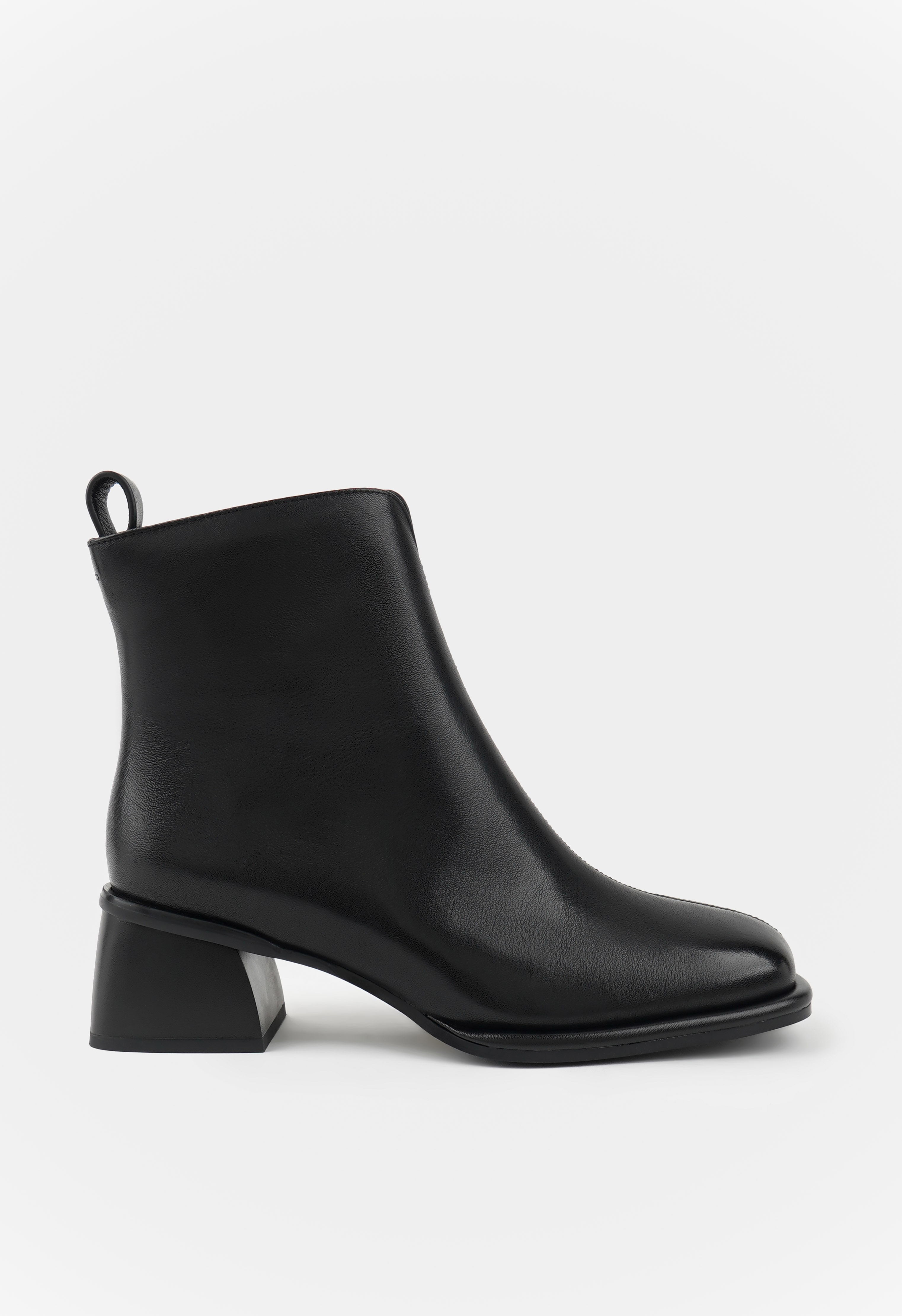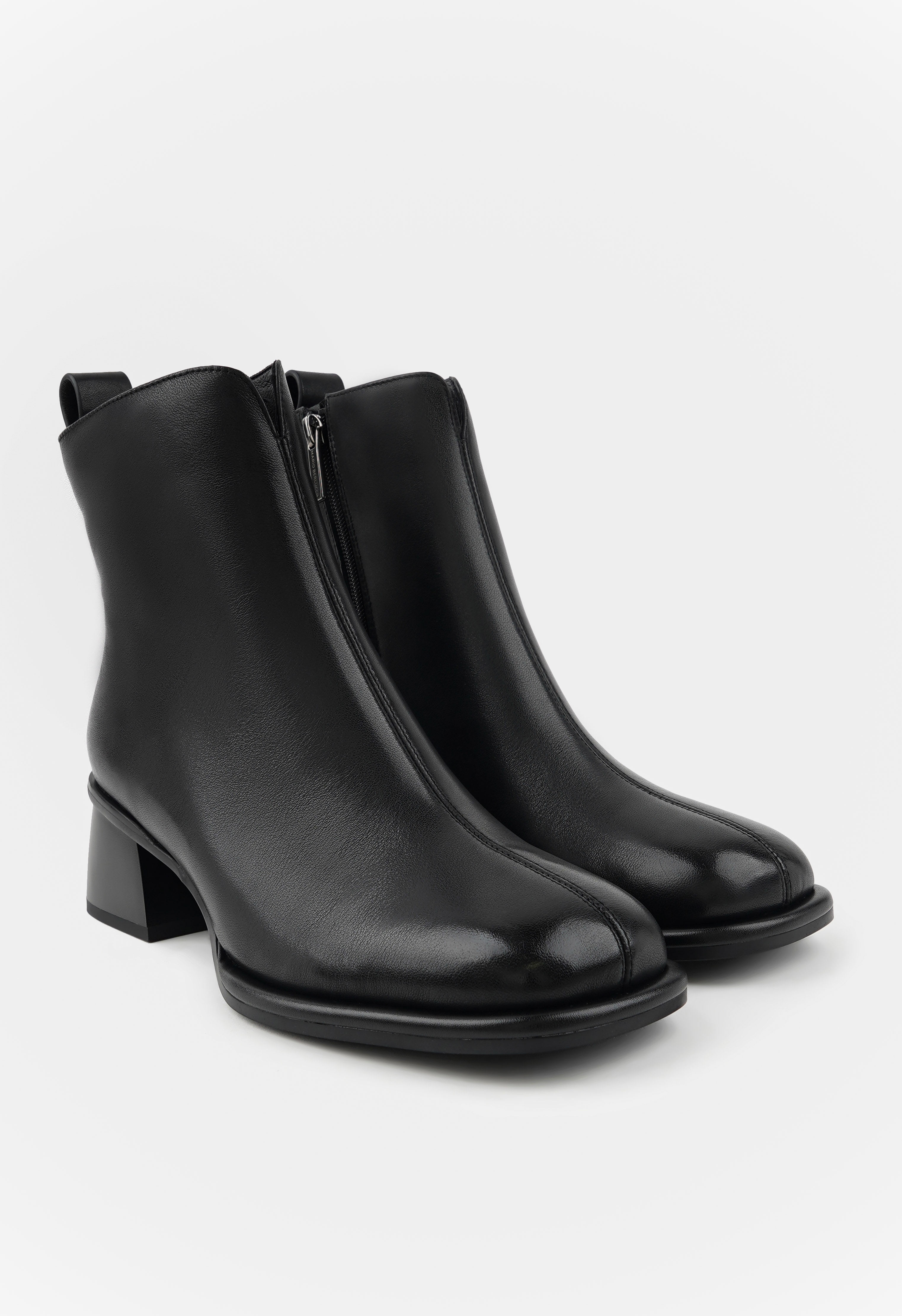 Стильные ботильоны из натуральной кожи в классическом черном цвете станут вашим надежным спутником в прохладное время года. Внутренняя байка дарит тепло и уют, а гибкая подошва делает каждый шаг легким и комфортным. Квадратный мысок и металлическая фурнитура придают образу современный характер, в то время как скошенный каблук добавляет динамики и уверенности в походке. Удобная молния облегчает надевание, универсальный дизайн идеально вписывается как в деловой стиль, так и в повседневные образы.