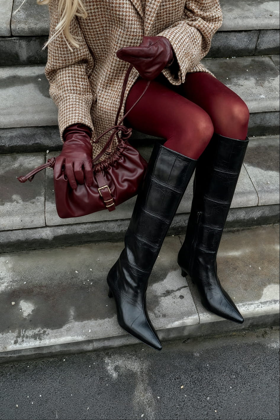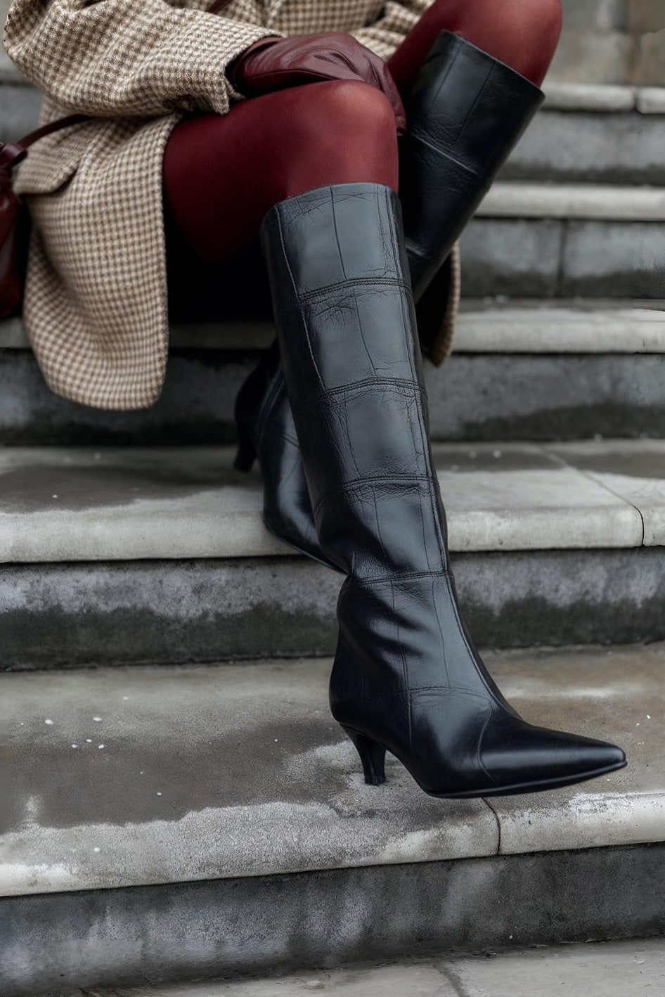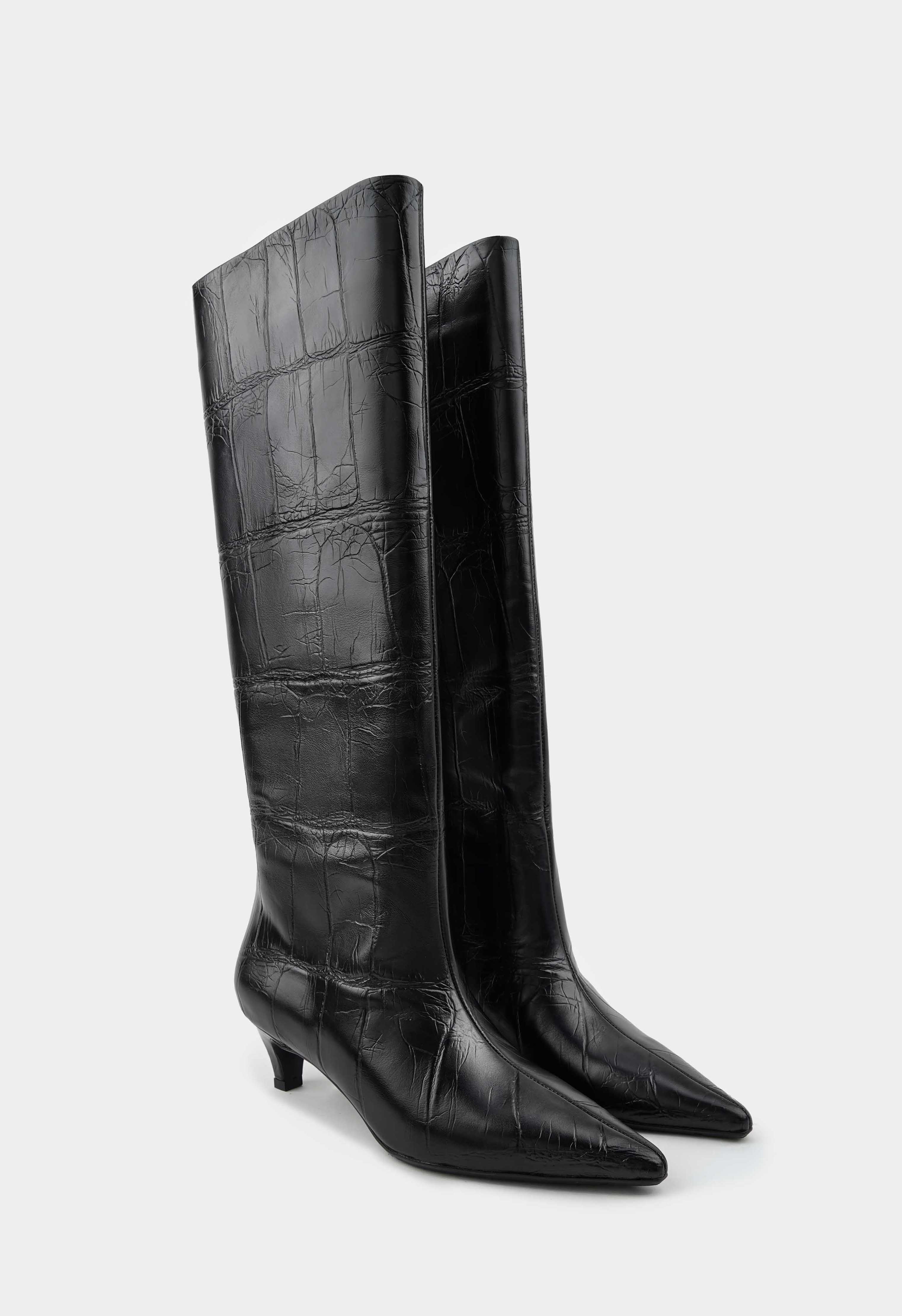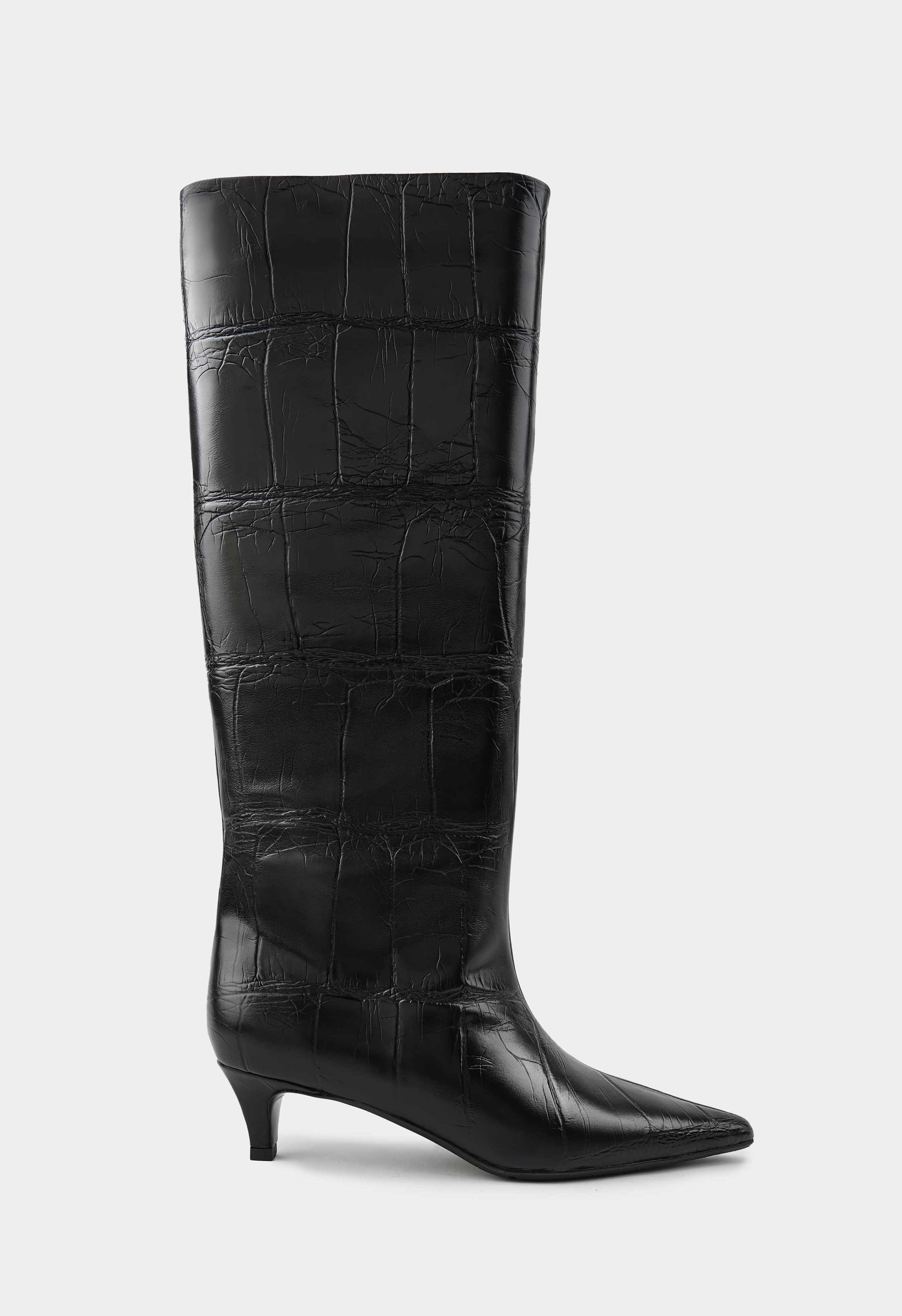 Изысканные черные сапоги из натуральной тисненной кожи с элегантным заостренным мысом и утонченным каблуком kitten heel создают образ безупречного стиля. Гибкая подошва обеспечивает удивительную легкость при ходьбе, а мягкая байковая подкладка дарит комфорт в прохладную погоду. Стильная молния с фурнитурой металлик добавляет модели современный акцент, подчеркивая строгий вид этих сапог. Универсальная пара станет идеальным выбором для деловых встреч и вечерних выходов.
