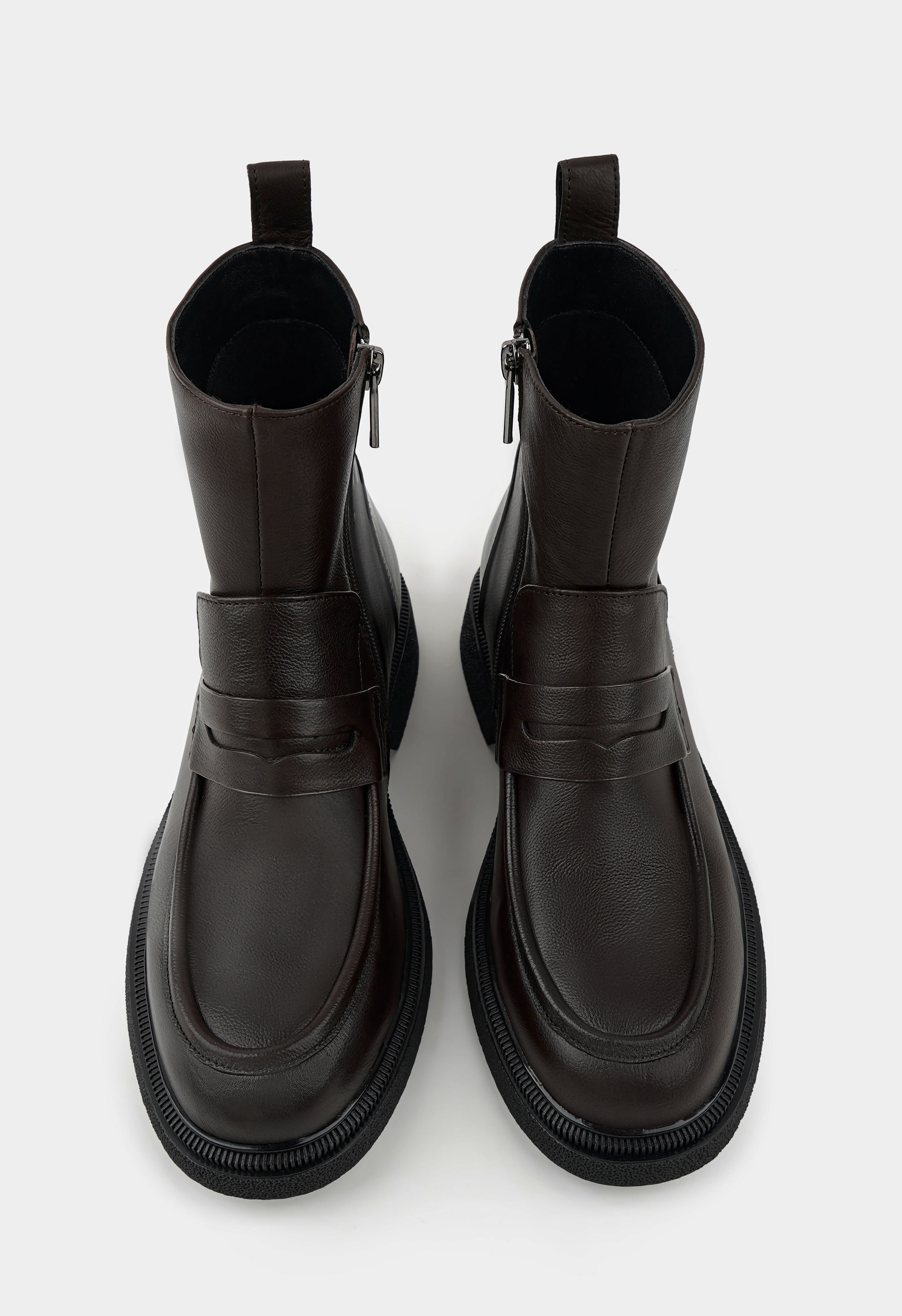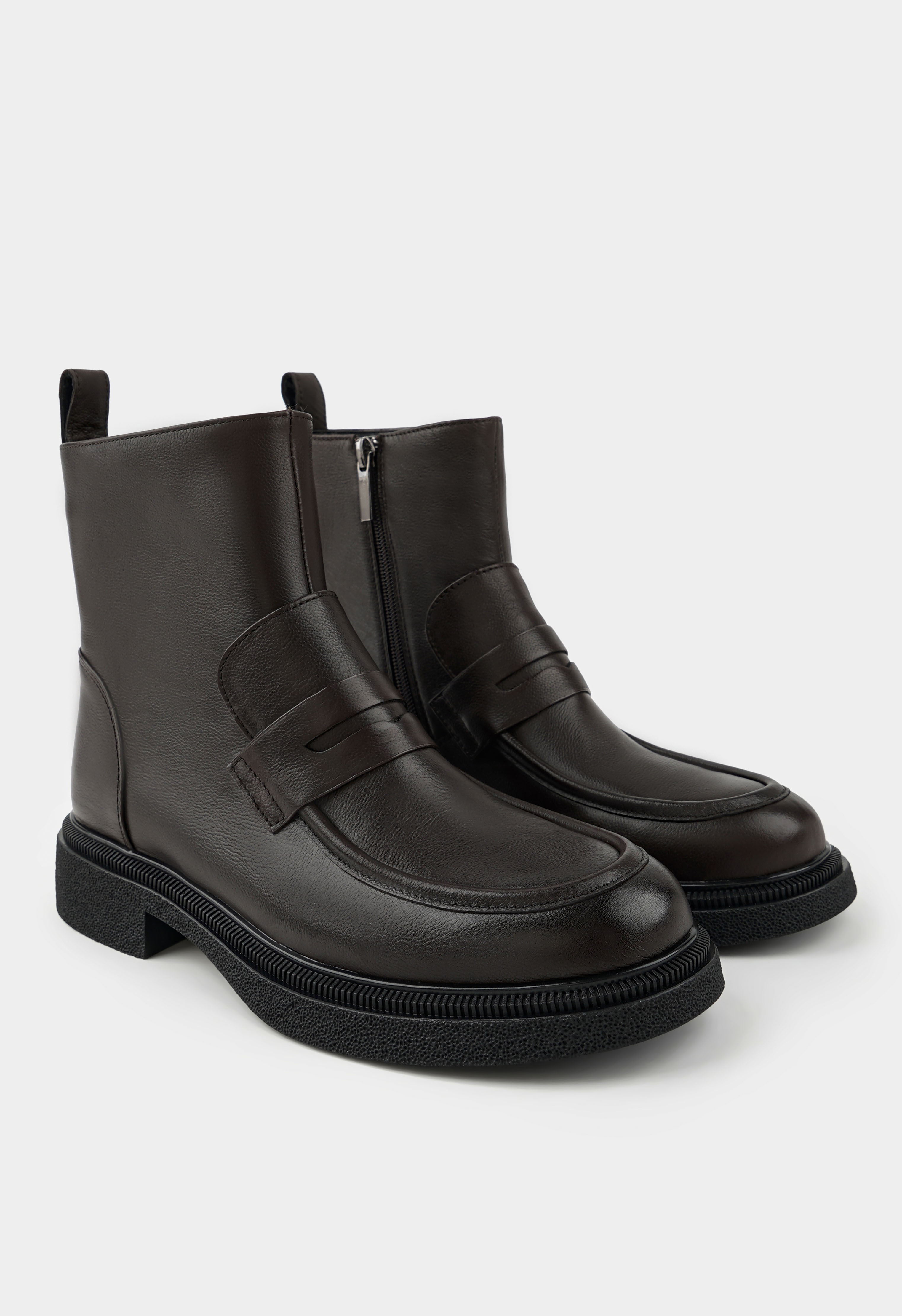 Ботинки из натуральной кожи глубокого коричневого цвета – это прочность, стиль и комфорт в одном. Внутренняя байка сохраняет тепло и уют, а жесткая подошва с широким каблуком гарантирует уверенность в каждом шаге. Округлый мысок делает посадку ноги комфортной, а металлическая фурнитура и удобная молния добавляют практичности и современного акцента. В комплекте предусмотрена дополнительная стелька из натурального меха, чтобы вы могли выбрать идеальный вариант носки. Эти ботинки станут надежной основой повседневного гардероба, легко вписываясь как в классические, так и в более расслабленные образы.