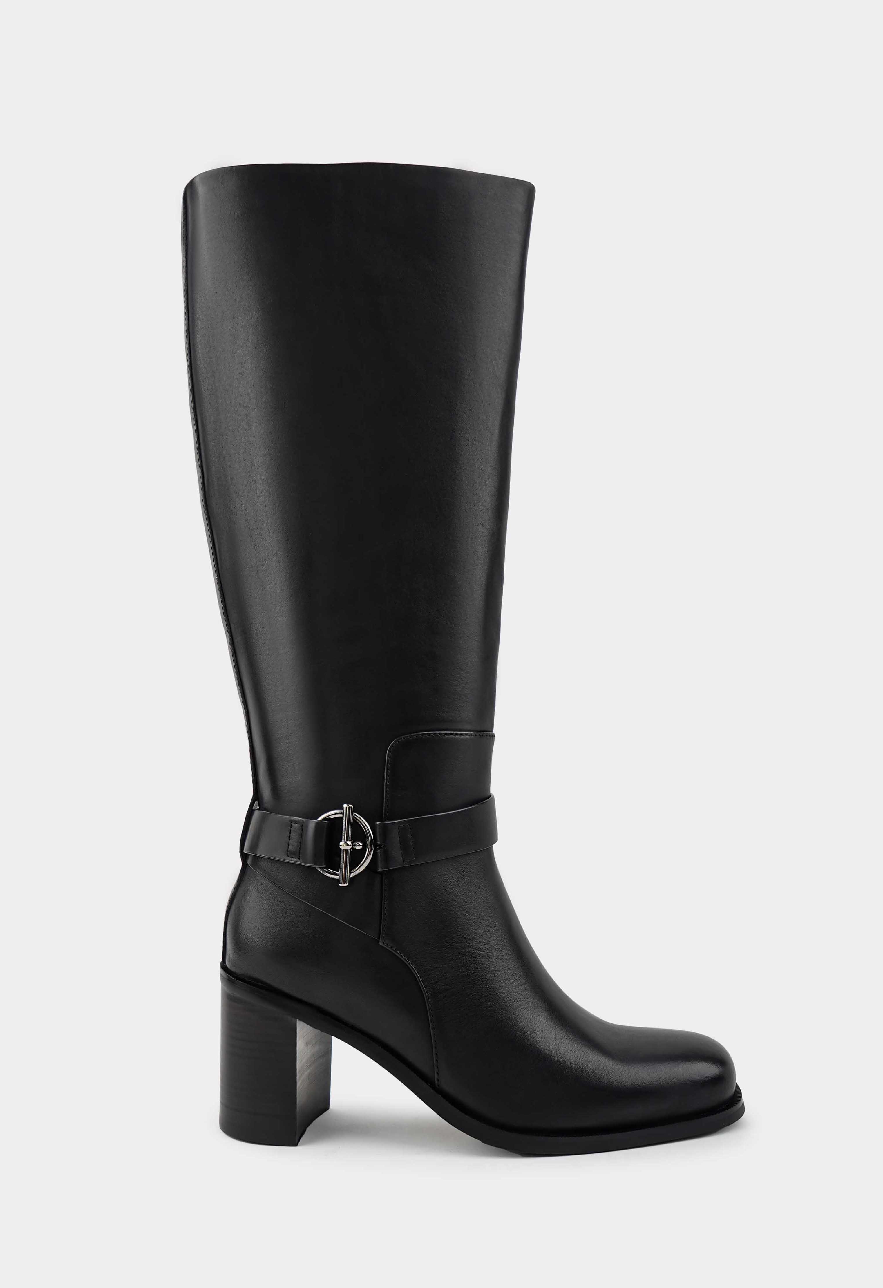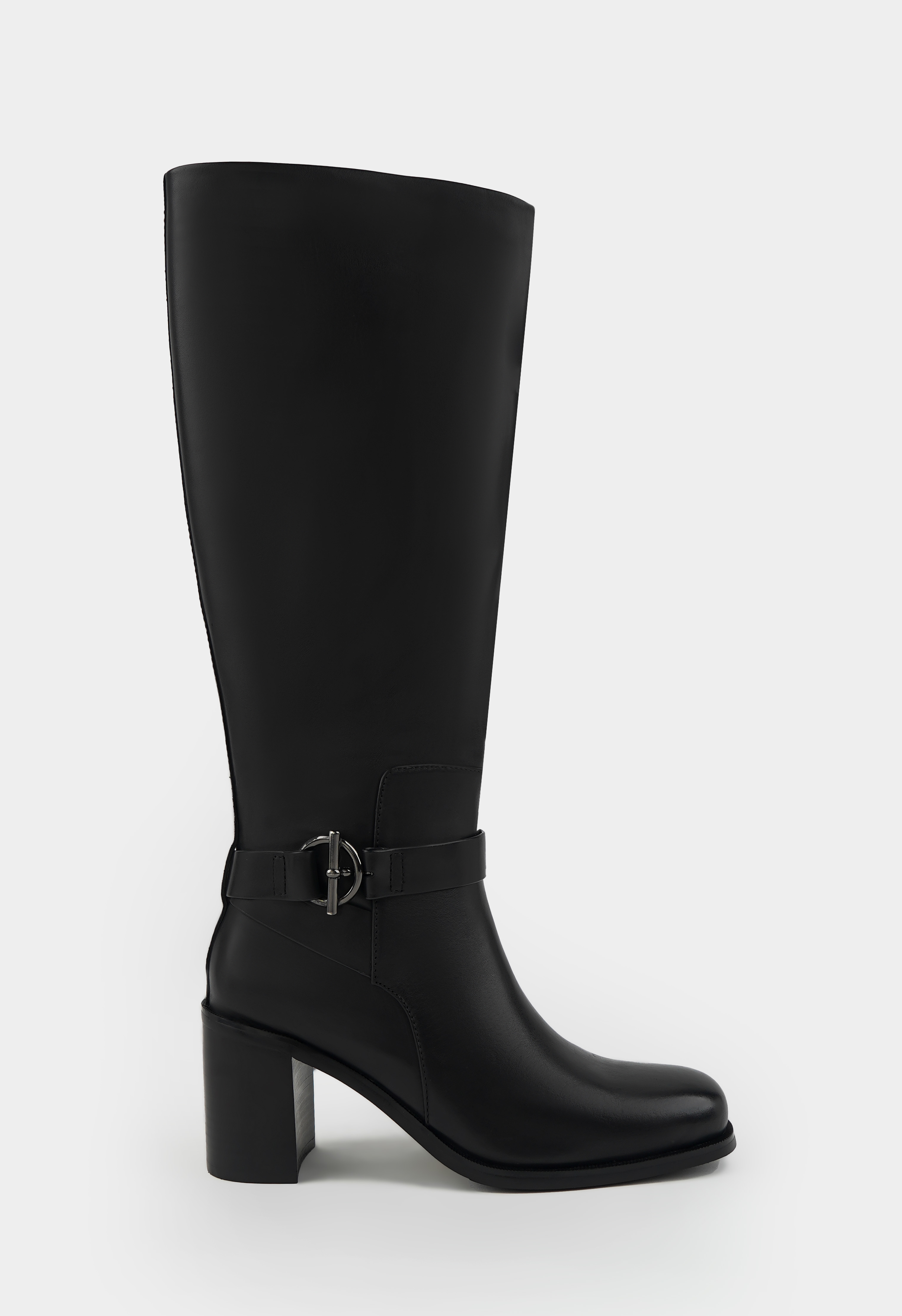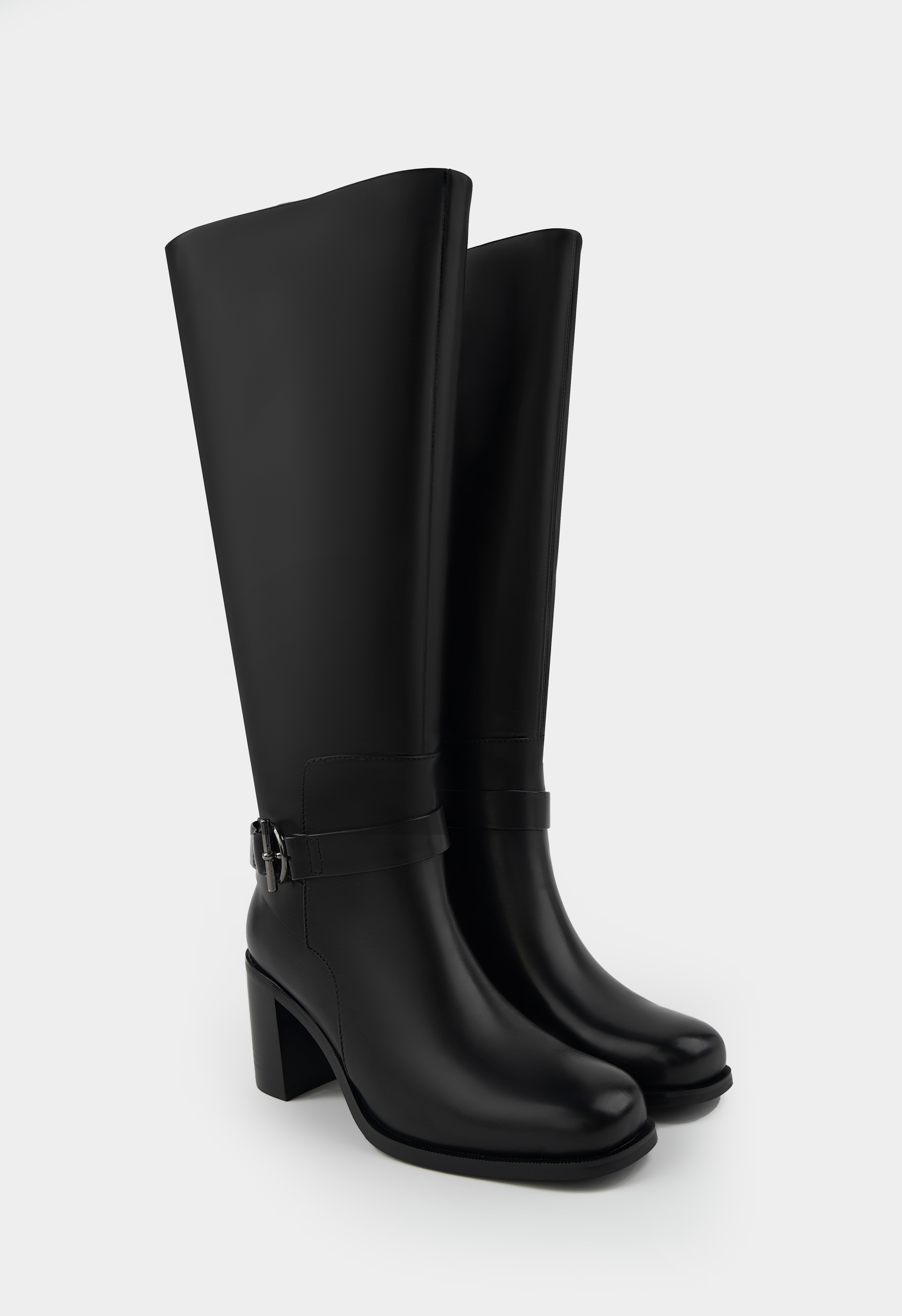 Современные черные сапоги из натуральной кожи с округлым мыском и стильной фурнитурой металлик создают утонченный образ. Гибкая подошва и устойчивый широкий каблук обеспечивают комфорт при ходьбе по городским улицам, а удобная боковая молния и мягкая байковая подкладка делают каждую носку приятной. Универсальная модель легко сочетается с разными стилями – от делового костюма до повседневных образов.
