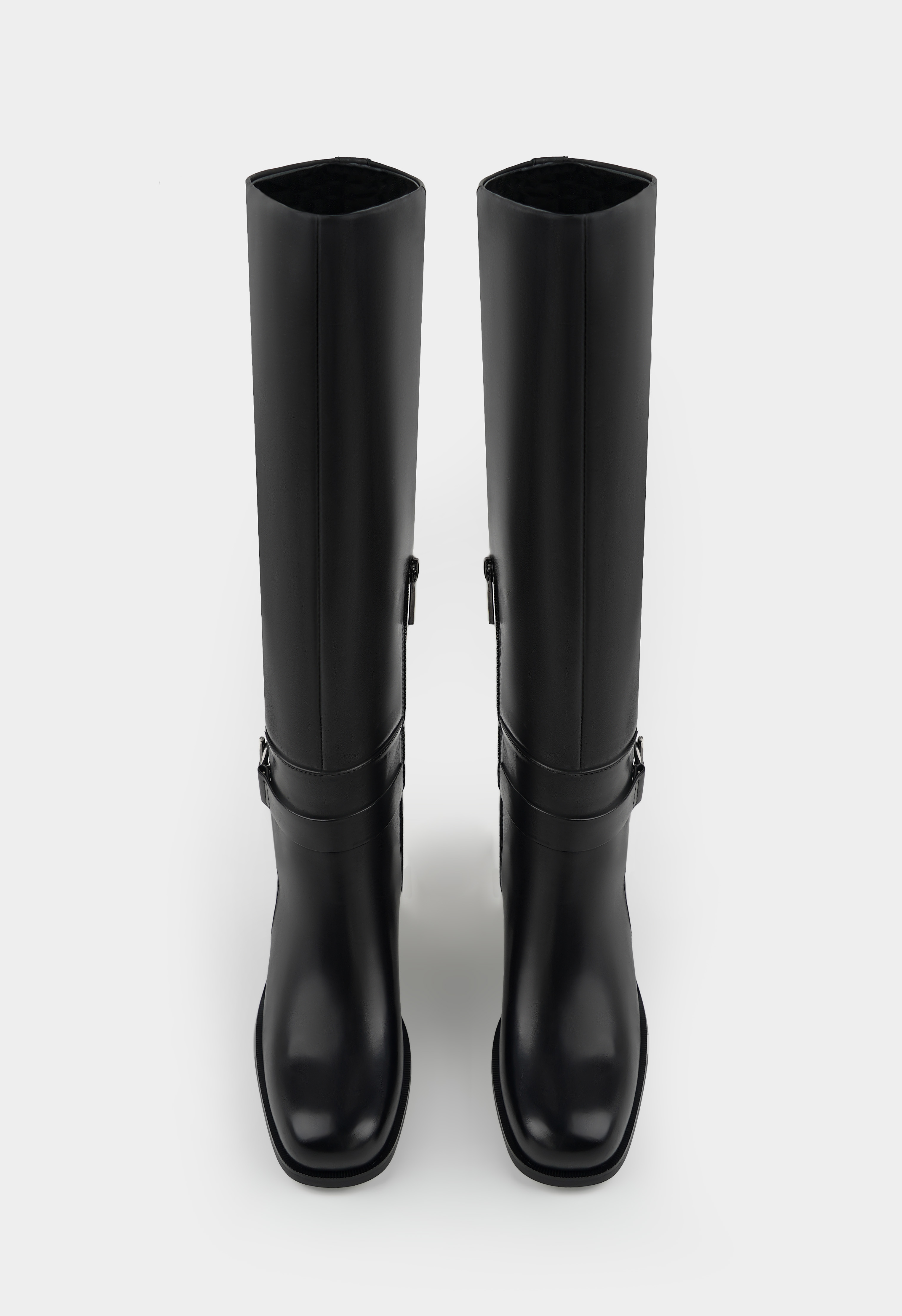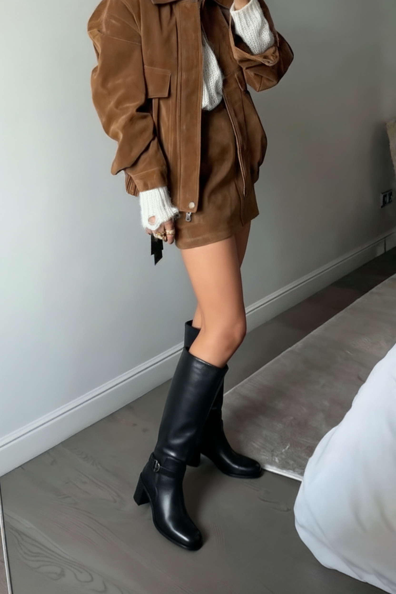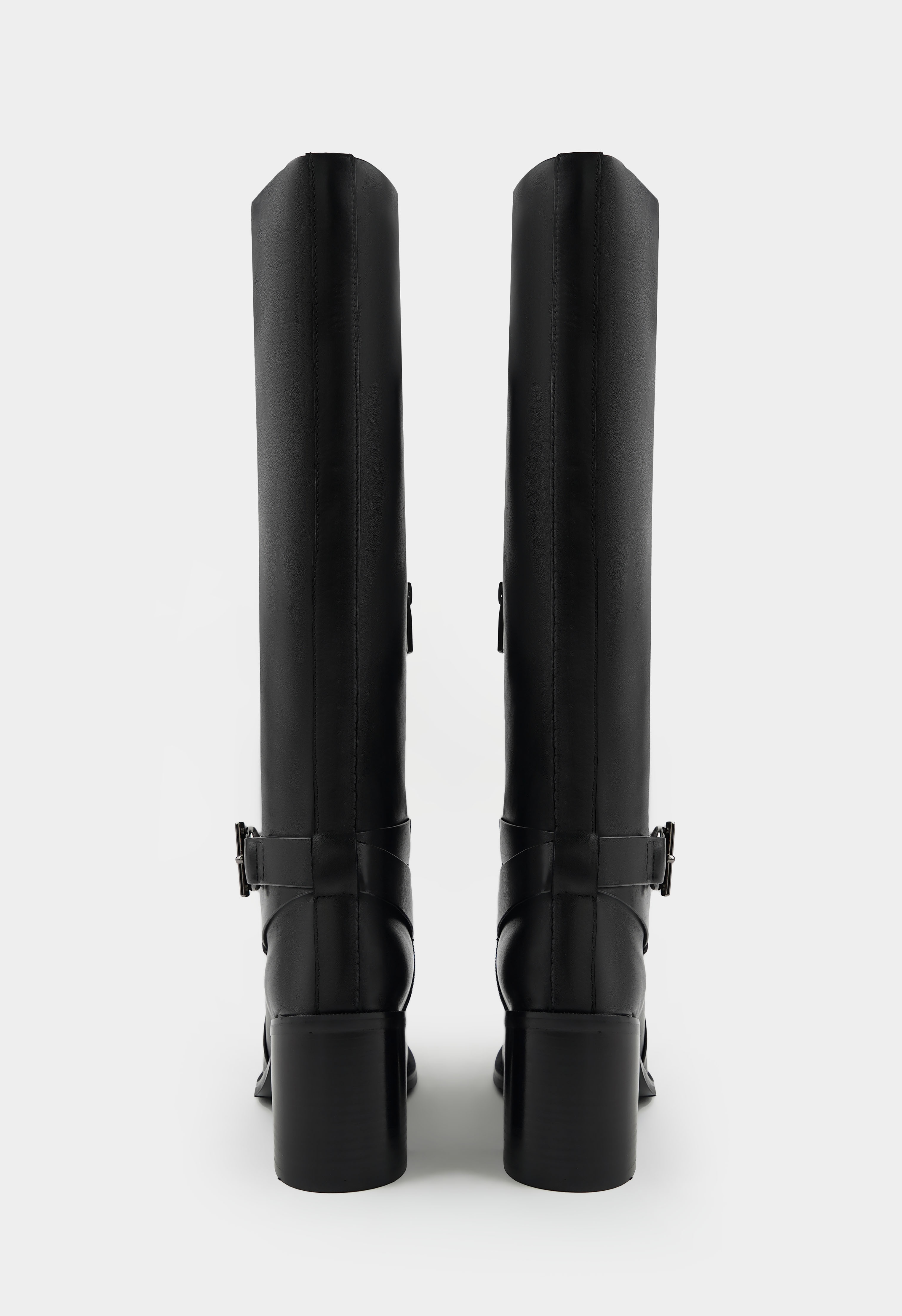 Современные черные сапоги из натуральной кожи с округлым мыском и стильной фурнитурой металлик создают утонченный образ. Гибкая подошва и устойчивый широкий каблук обеспечивают комфорт при ходьбе по городским улицам, а удобная боковая молния и мягкая байковая подкладка делают каждую носку приятной. Универсальная модель легко сочетается с разными стилями – от делового костюма до повседневных образов.
