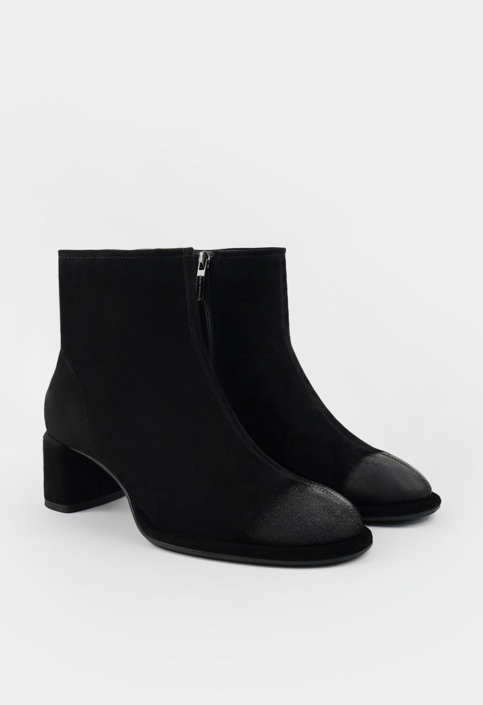 Эти стильные черные ботильоны из мягкой натуральной замши созданы как для повседневной носки, так и для особых случаев. Модель с удобным округлым мысом, внутренней отделкой из байки и устойчивым геометричным каблуком отлично смотрится в городском образе. Гибкая подошва обеспечивает комфорт при ходьбе, а практичная молния с металлической фурнитурой позволяет легко обуваться. Универсальная пара легко сочетается с джинсами, платьями и классическими брюками, завершая образ элегантной ноткой.
