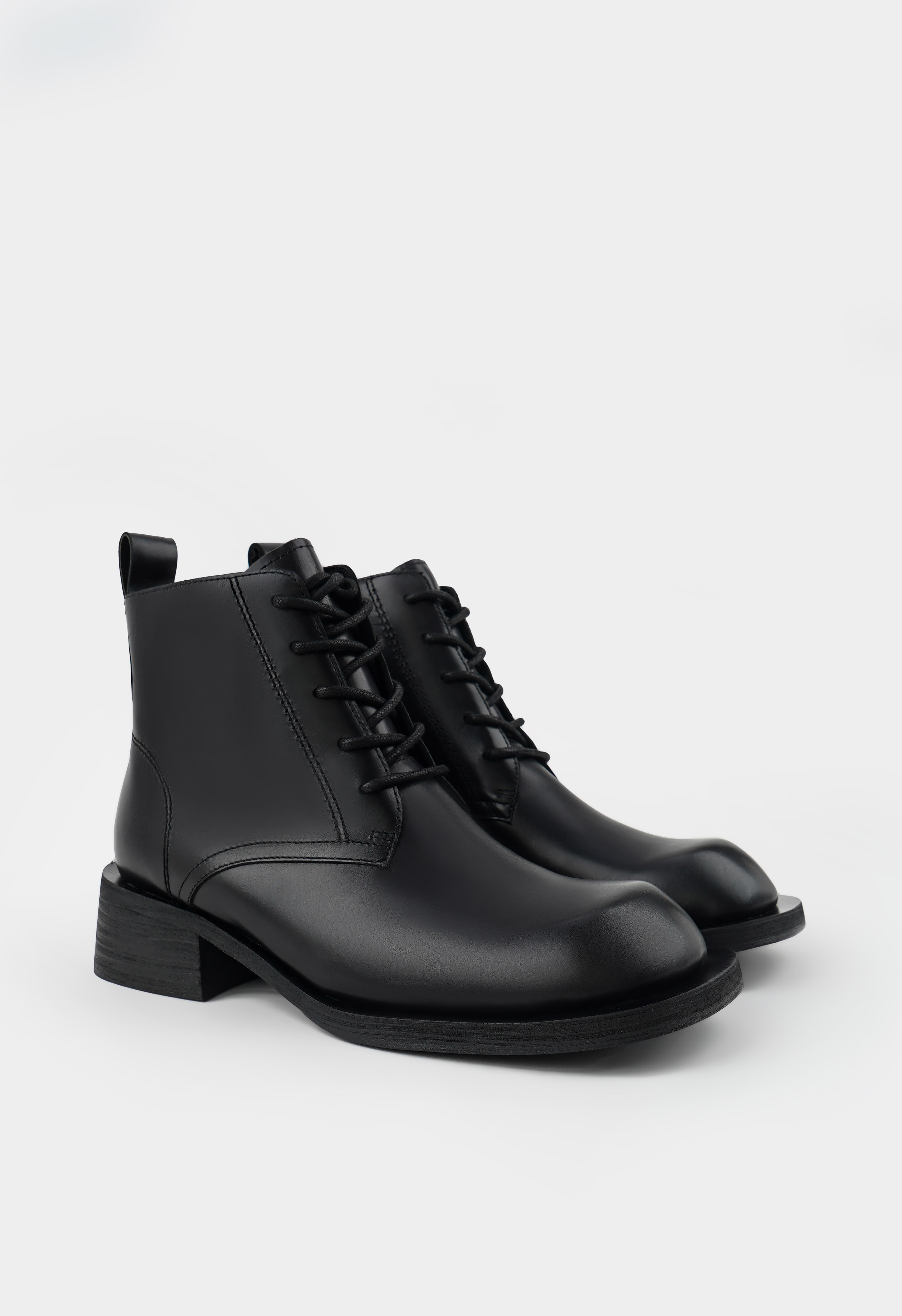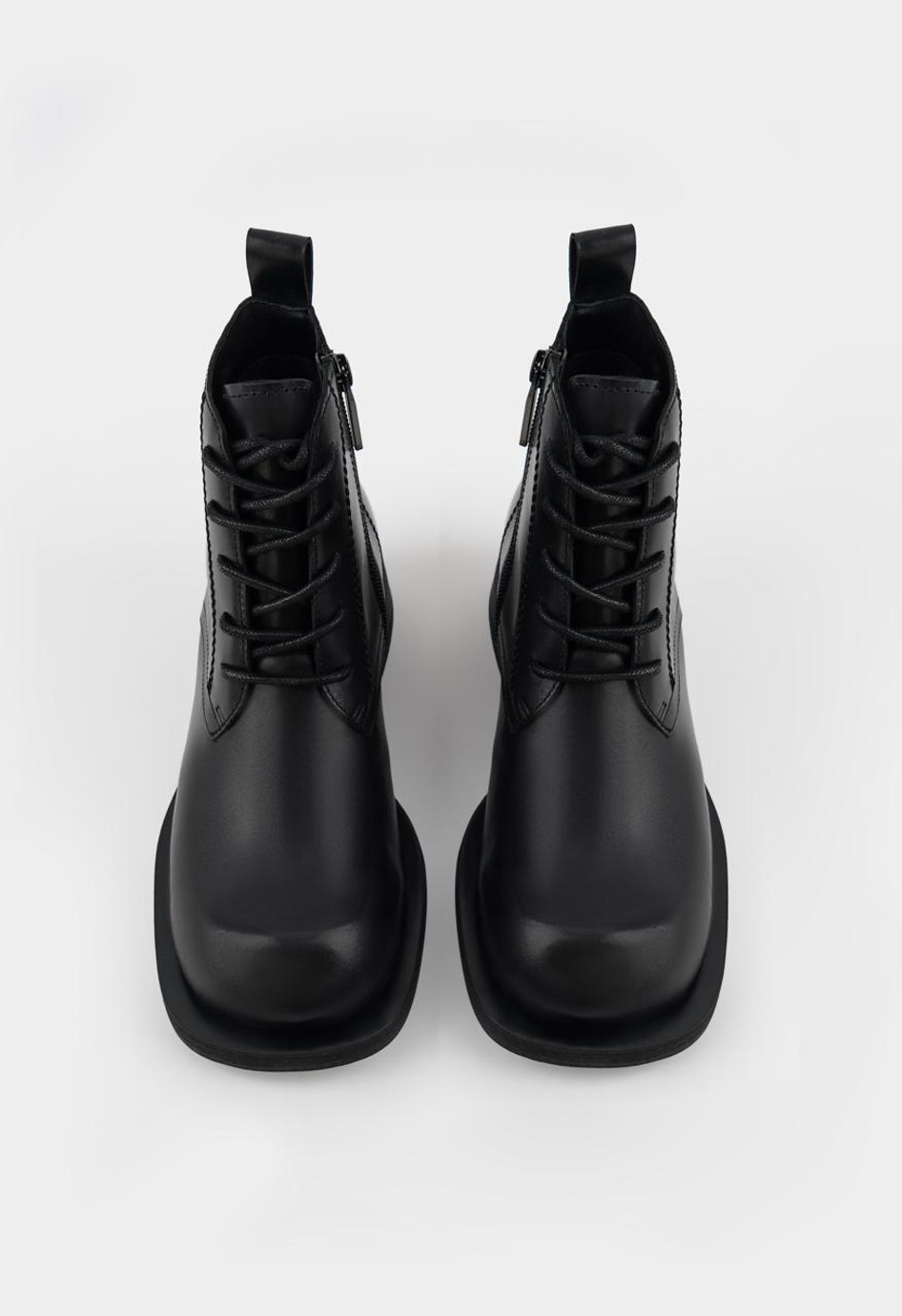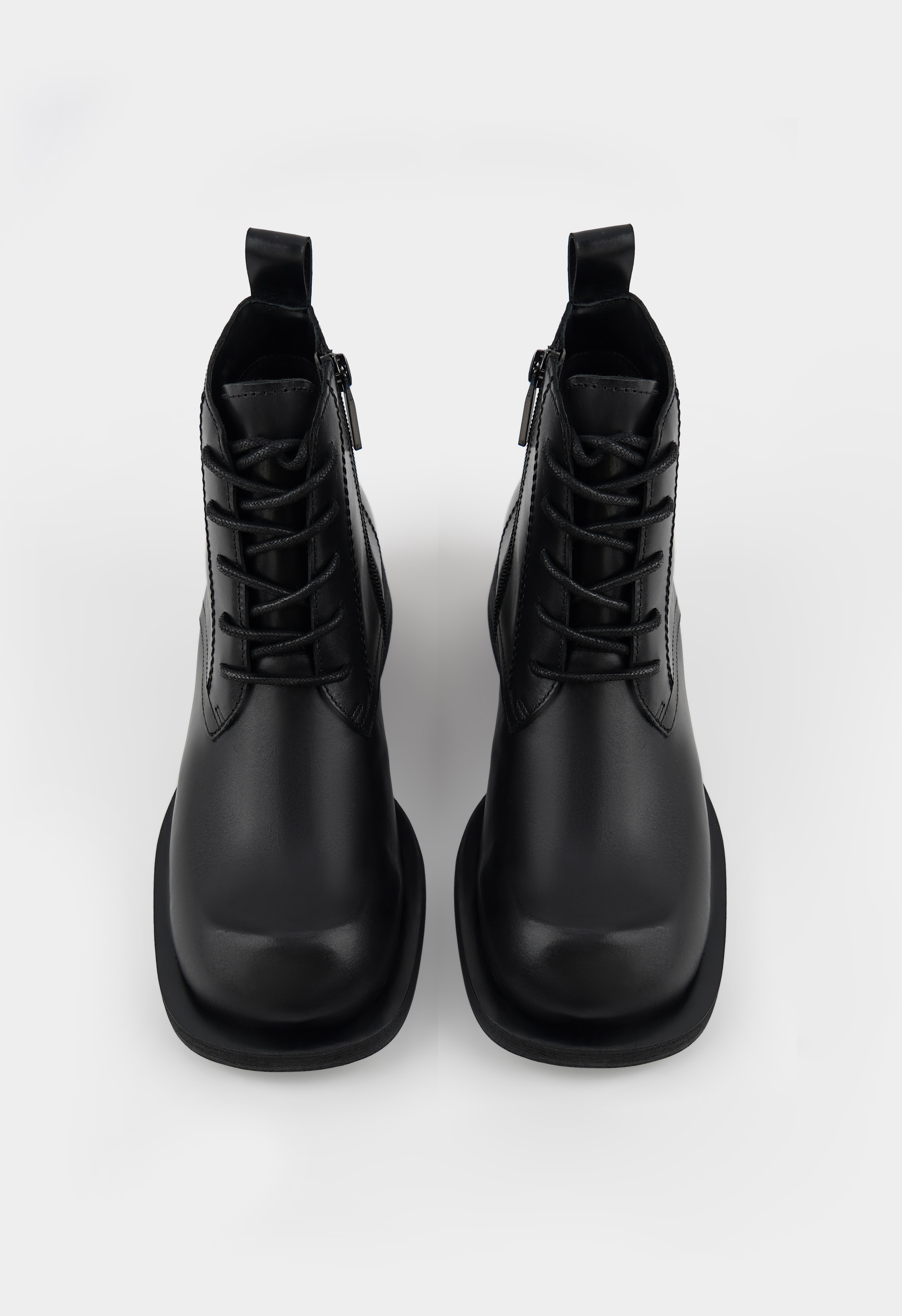 Черные ботинки из натуральной кожи сочетают в себе брутальный характер и городской стиль. Модель с выразительным квадратным мыском и массивным широким каблуком демонстрирует уверенный, современный силуэт. Жесткая, надежная подошва гарантирует устойчивость на любой поверхности, а практичный дуэт из классической шнуровки и удобной боковой молнии со стильной фурнитурой металлик позволяет идеально подогнать посадку по ноге. Благодаря невероятно уютной байковой подкладке, в этих ботинках будет комфортно даже в прохладную погоду.