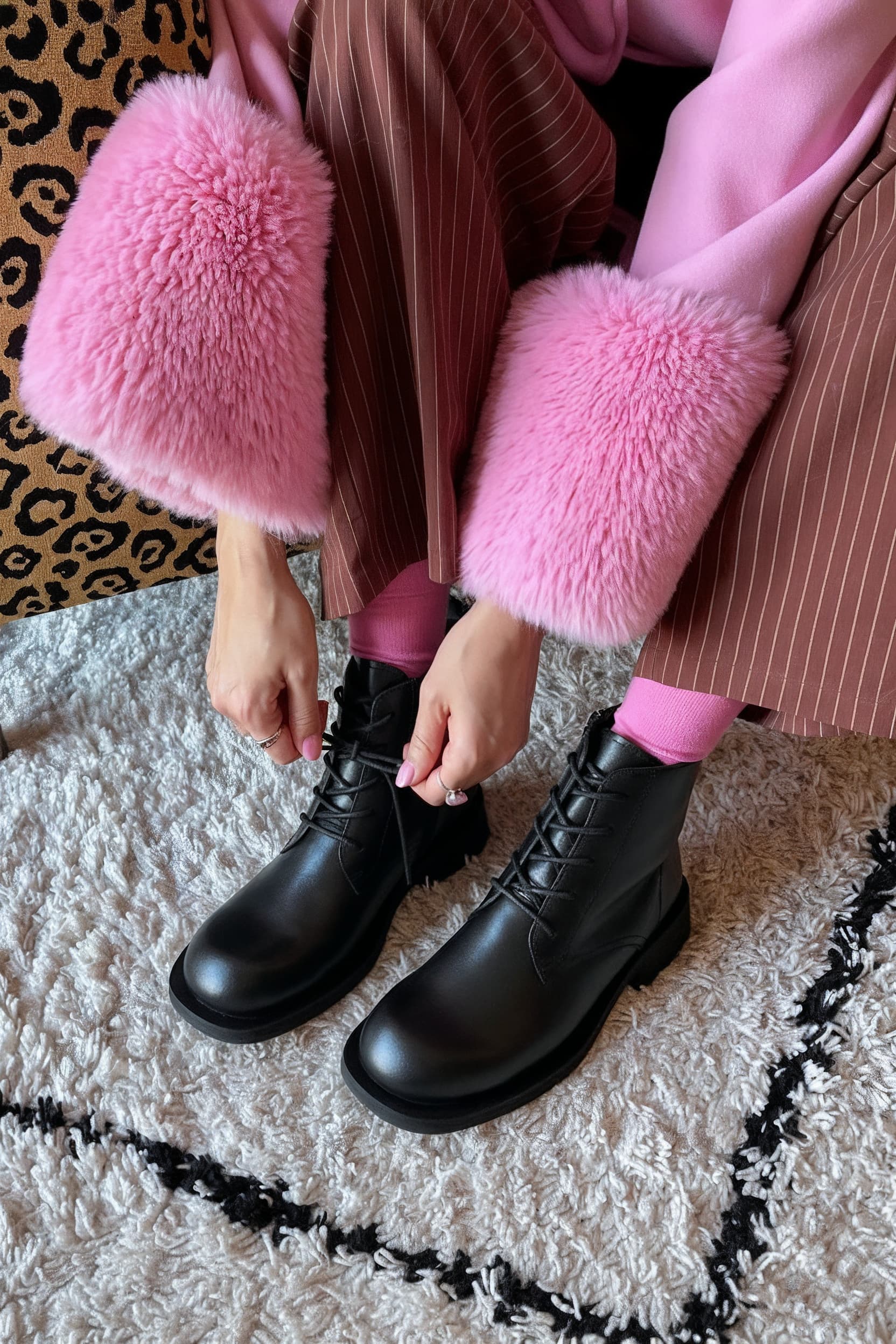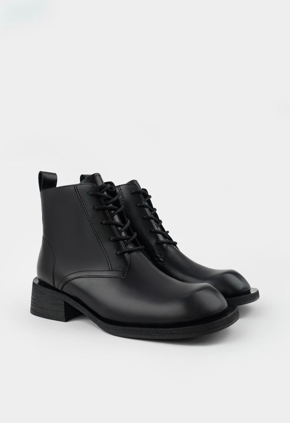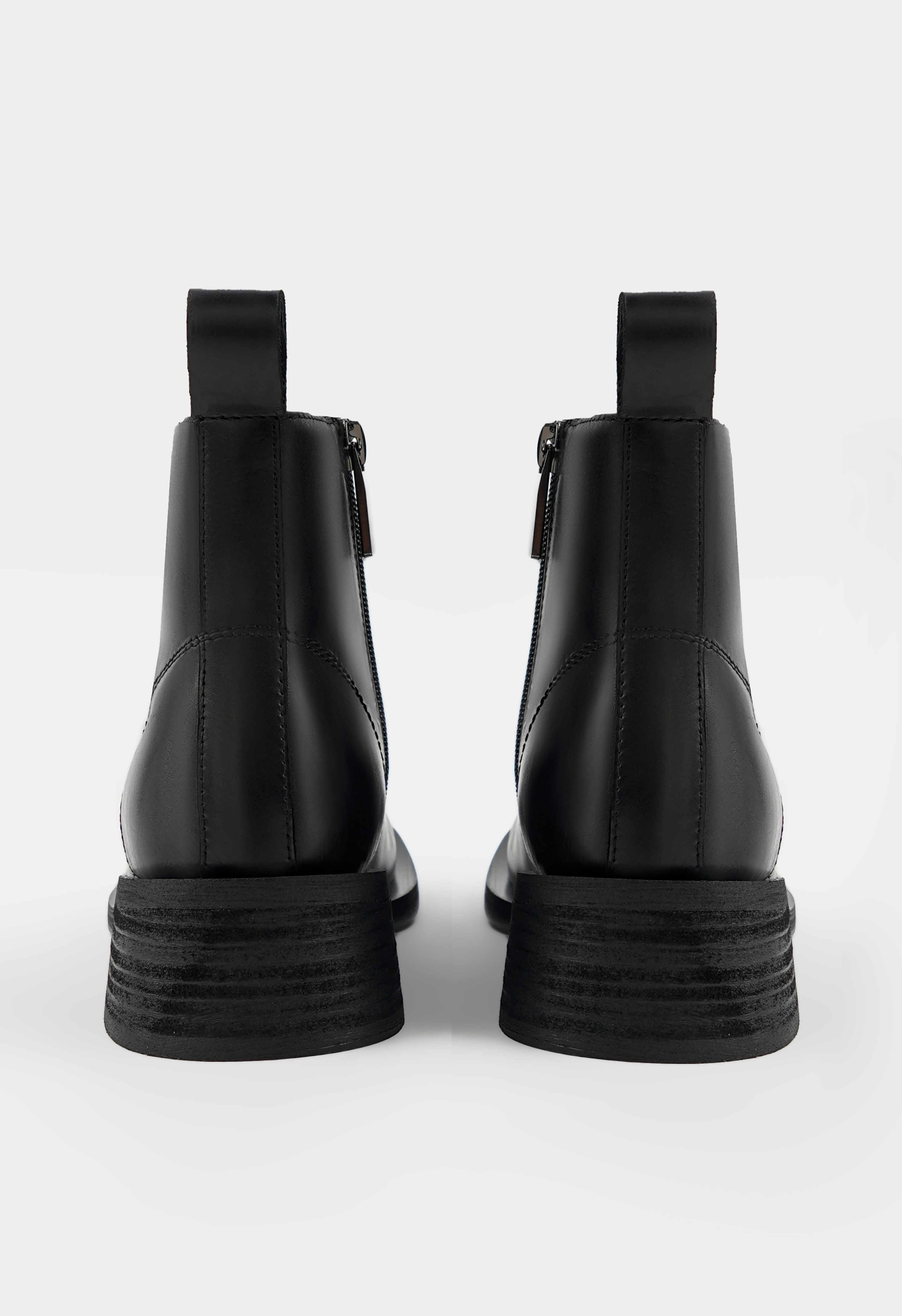 Черные ботинки из натуральной кожи сочетают в себе брутальный характер и городской стиль. Модель с выразительным квадратным мыском и массивным широким каблуком демонстрирует уверенный, современный силуэт. Жесткая, надежная подошва гарантирует устойчивость на любой поверхности, а практичный дуэт из классической шнуровки и удобной боковой молнии со стильной фурнитурой металлик позволяет идеально подогнать посадку по ноге. Благодаря невероятно уютной байковой подкладке, в этих ботинках будет комфортно даже в прохладную погоду.