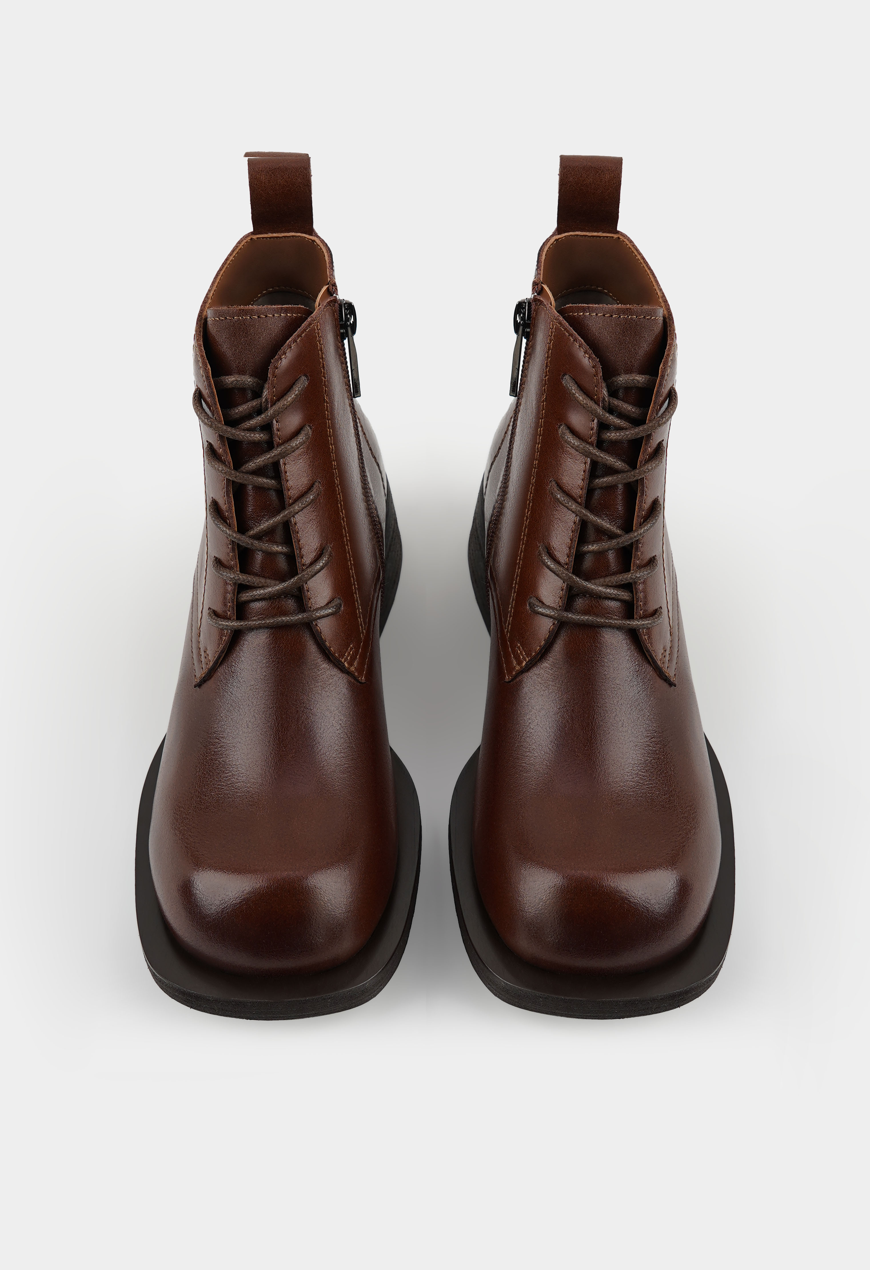 Коричневые ботинки из натуральной кожи сочетают в себе брутальный характер и городской стиль. Модель с выразительным квадратным мыском и массивным широким каблуком демонстрирует уверенный, современный силуэт. Жесткая, надежная подошва гарантирует устойчивость на любой поверхности, а практичный дуэт из классической шнуровки и удобной боковой молнии со стильной фурнитурой металлик позволяет идеально подогнать посадку по ноге. Благодаря невероятно уютной байковой подкладке, в этих ботинках будет комфортно даже в прохладную погоду.