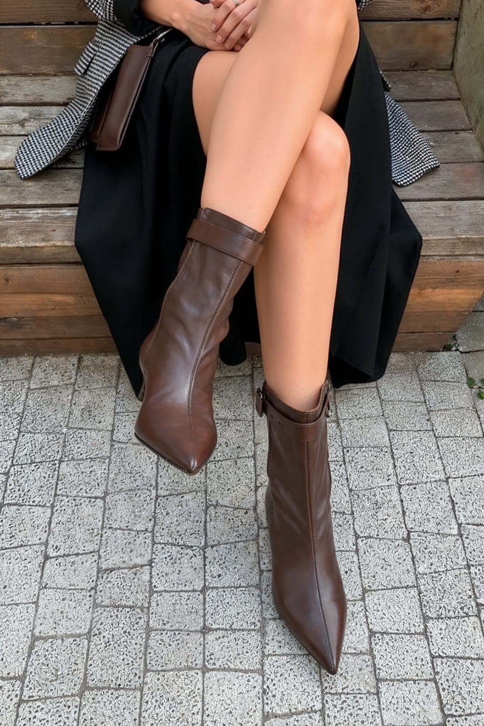 Эти утонченные ботильоны коричневого цвета из натуральной кожи с изящным мыском и элегантным каблуком kitten heel создают неповторимый образ женственной грации – в них гармонично сочетаются лаконичный дизайн и продуманный комфорт. Гибкая подошва обеспечивает невесомость при ходьбе, а нежная байковая подкладка дарит уютное тепло, делая эту пару идеальной для прохладной погоды. Стильная коричневая фурнитура подчеркивает благородный оттенок кожи, создавая целостную эстетику образа.