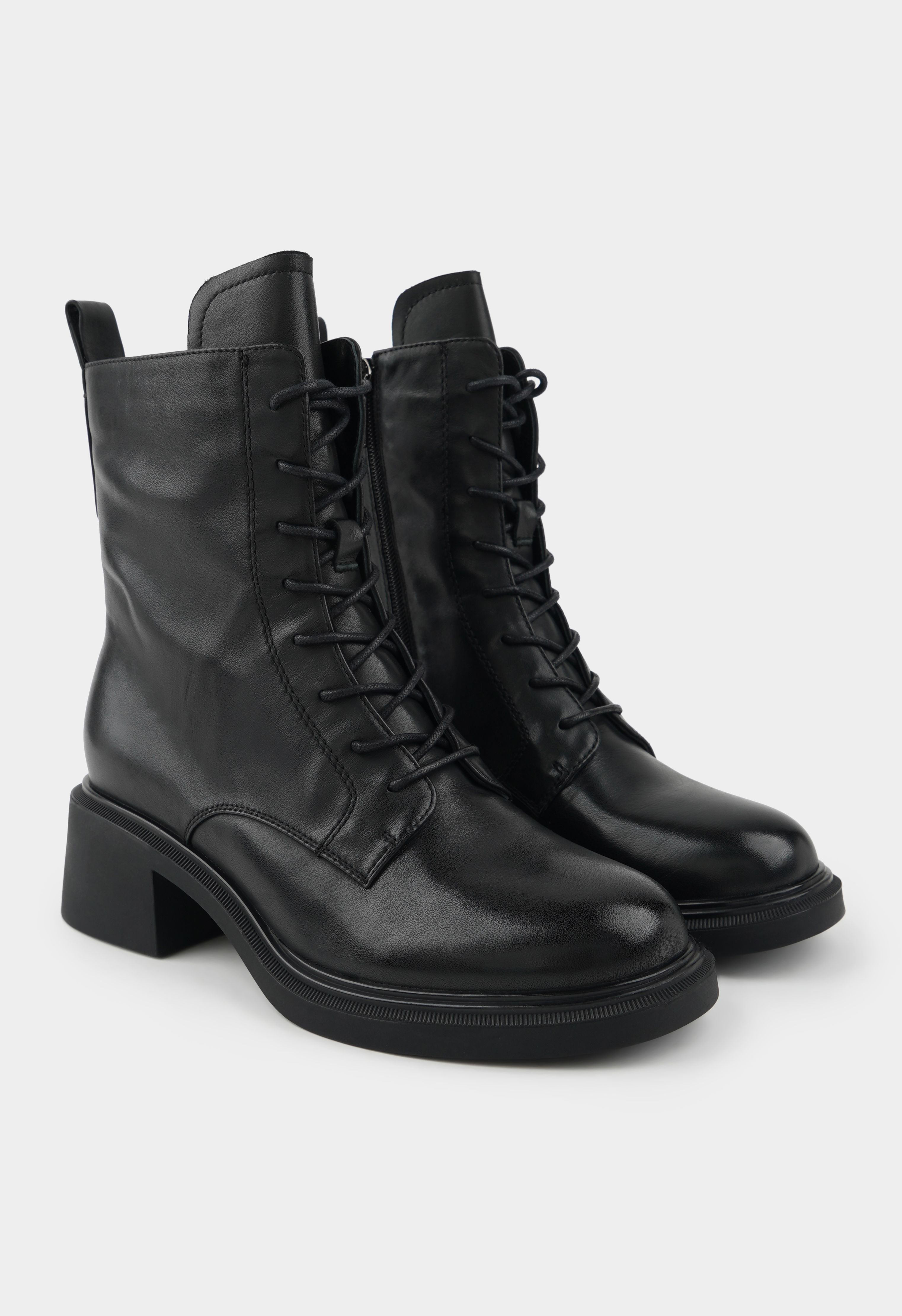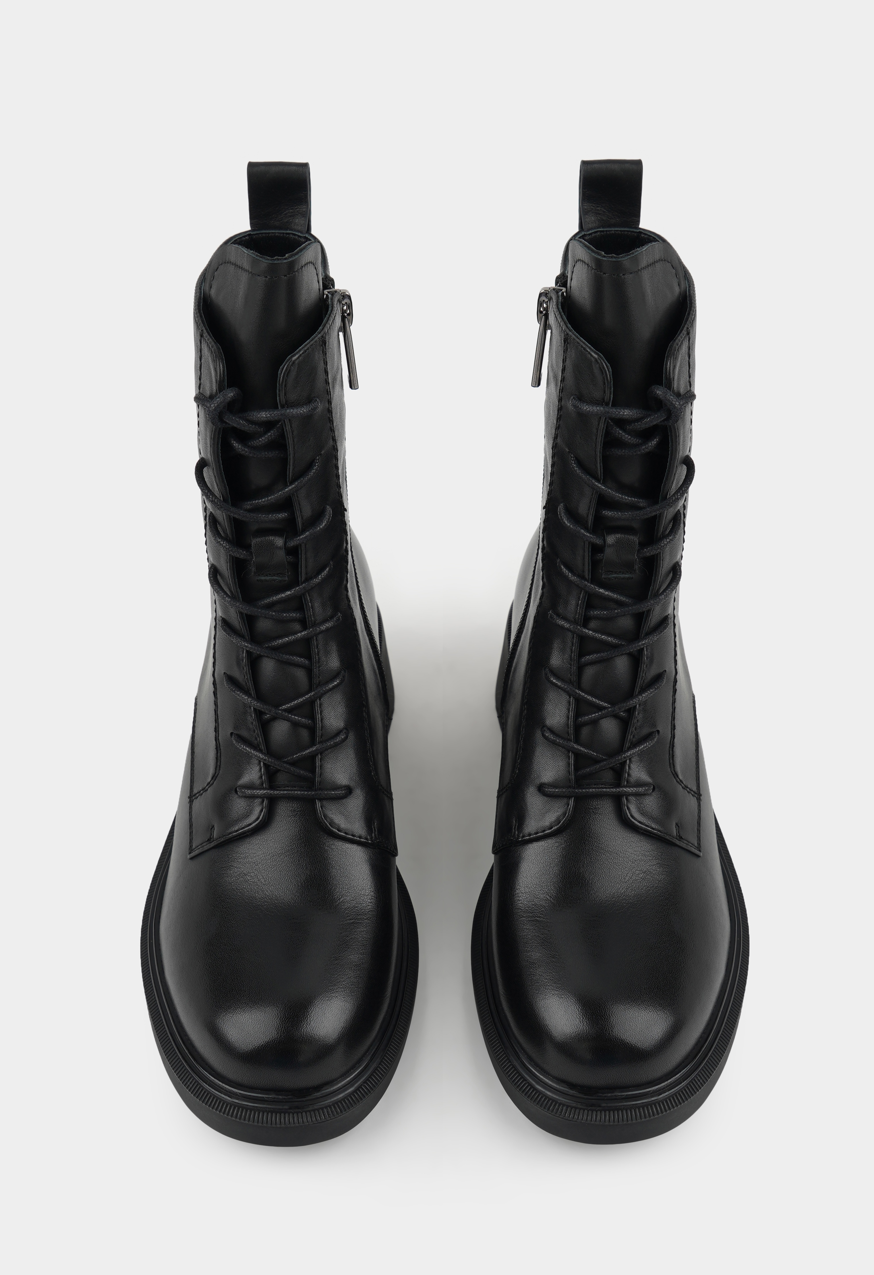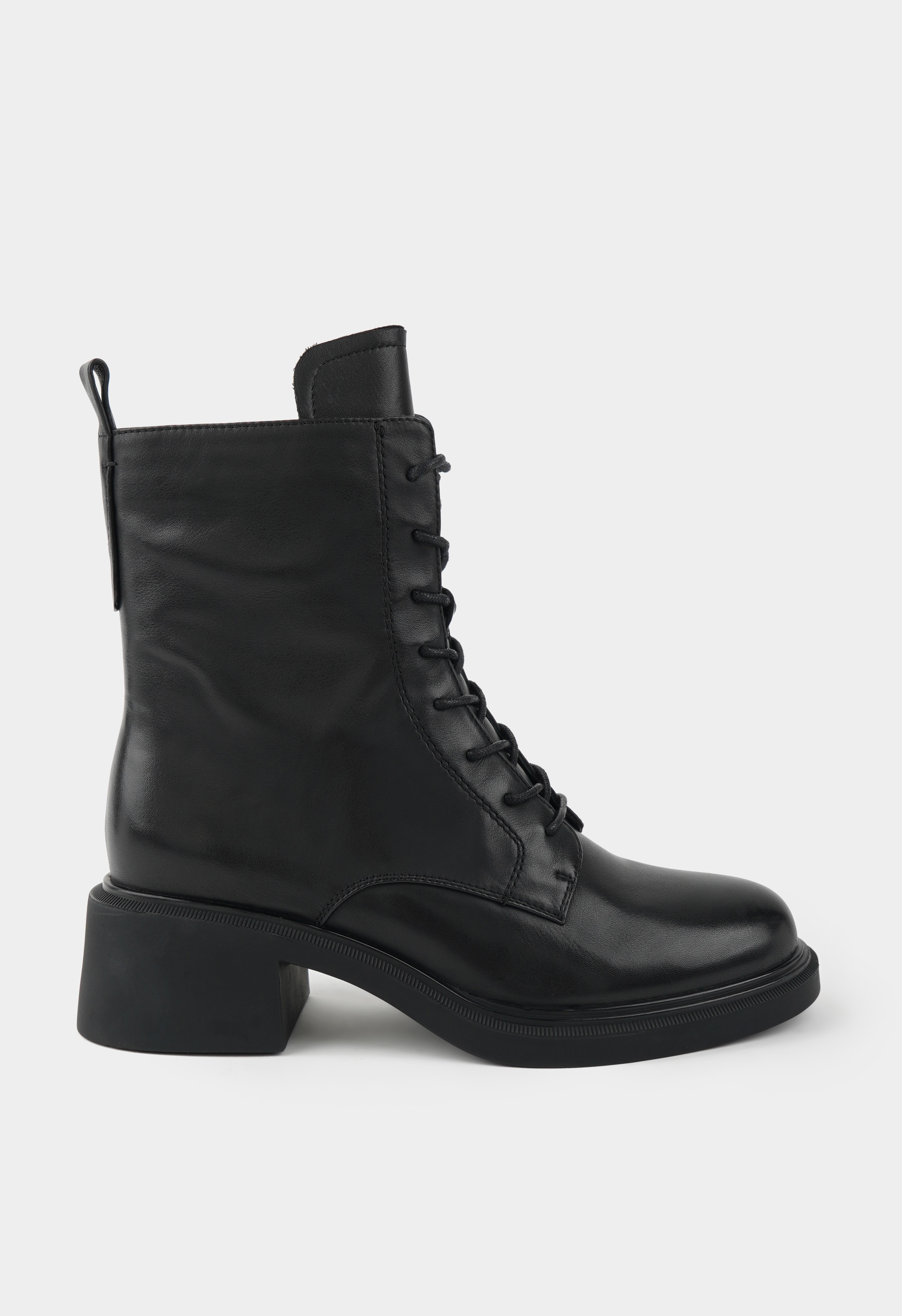 Черные ботинки из натуральной кожи с подкладкой из байки созданы для тех, кто ценит практичность и стиль в одной паре. Модель отличается округлым мысом, устойчивым широким каблуком и жесткой подошвой, что делает обувь удобной для повседневной носки. Молния в сочетании со шнуровкой гарантирует удобство и точную посадку, а металлическая фурнитура добавляет выразительности. В комплект входит дополнительная стелька из натурального меха – идеальное решение для холодных дней.