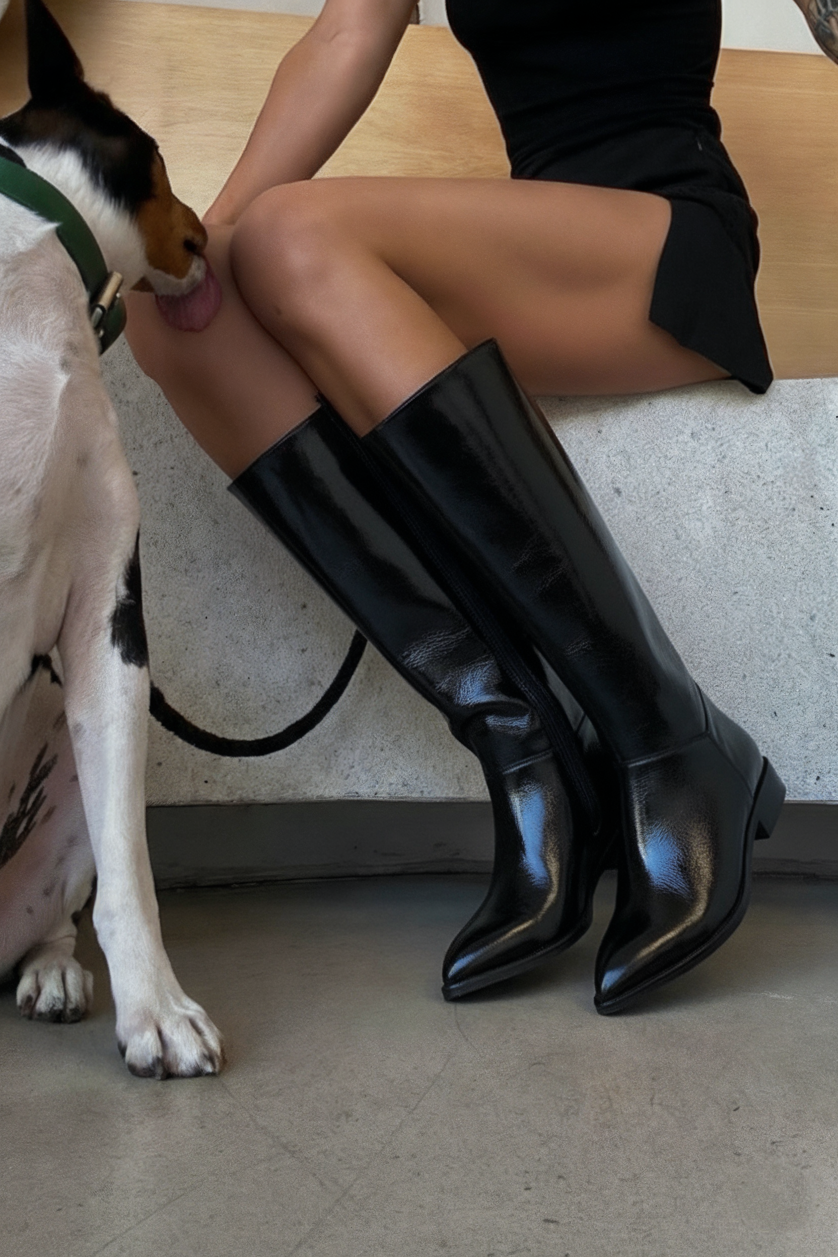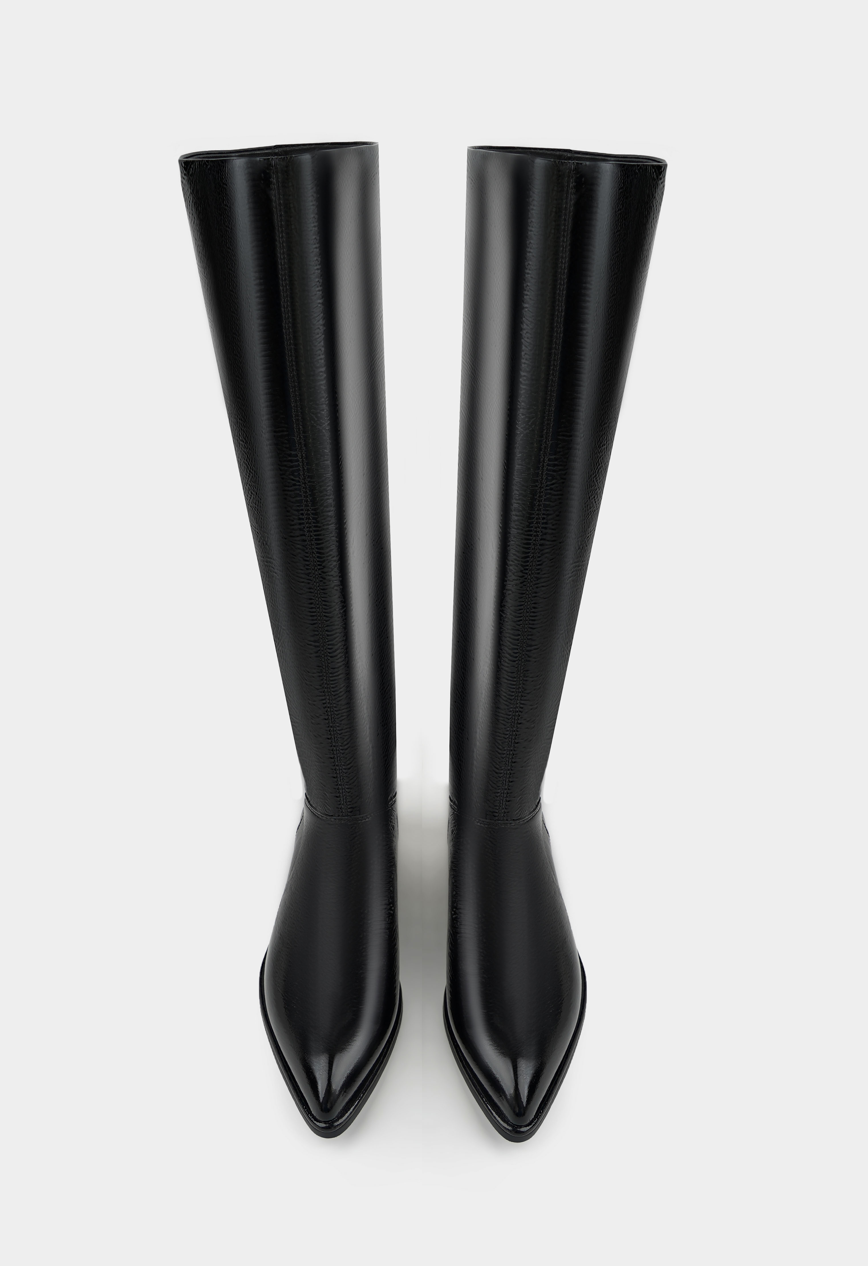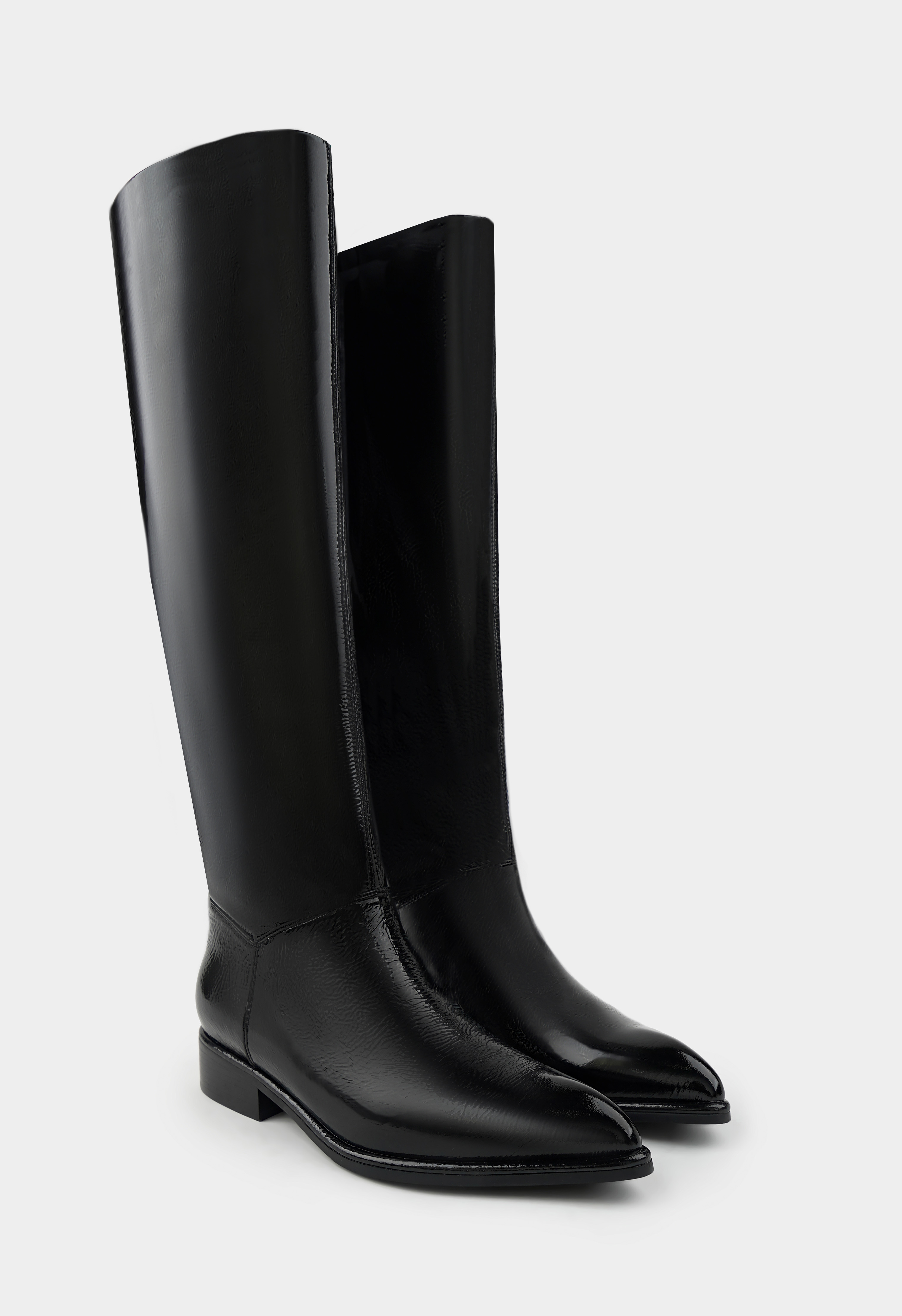 Черные сапоги из натуральной лаковой кожи с подкладкой из байки – это идеальный баланс элегантности и практичности. Заостренный мысок придает образу изящность, а широкий каблук обеспечивает комфорт и стабильность при каждом шаге. Гибкая подошва делает обувь удобной для долгих прогулок. Эта модель легко вписывается в повседневный гардероб и дополнит как классические, так и более смелые образы, подчеркивая актуальность образа.