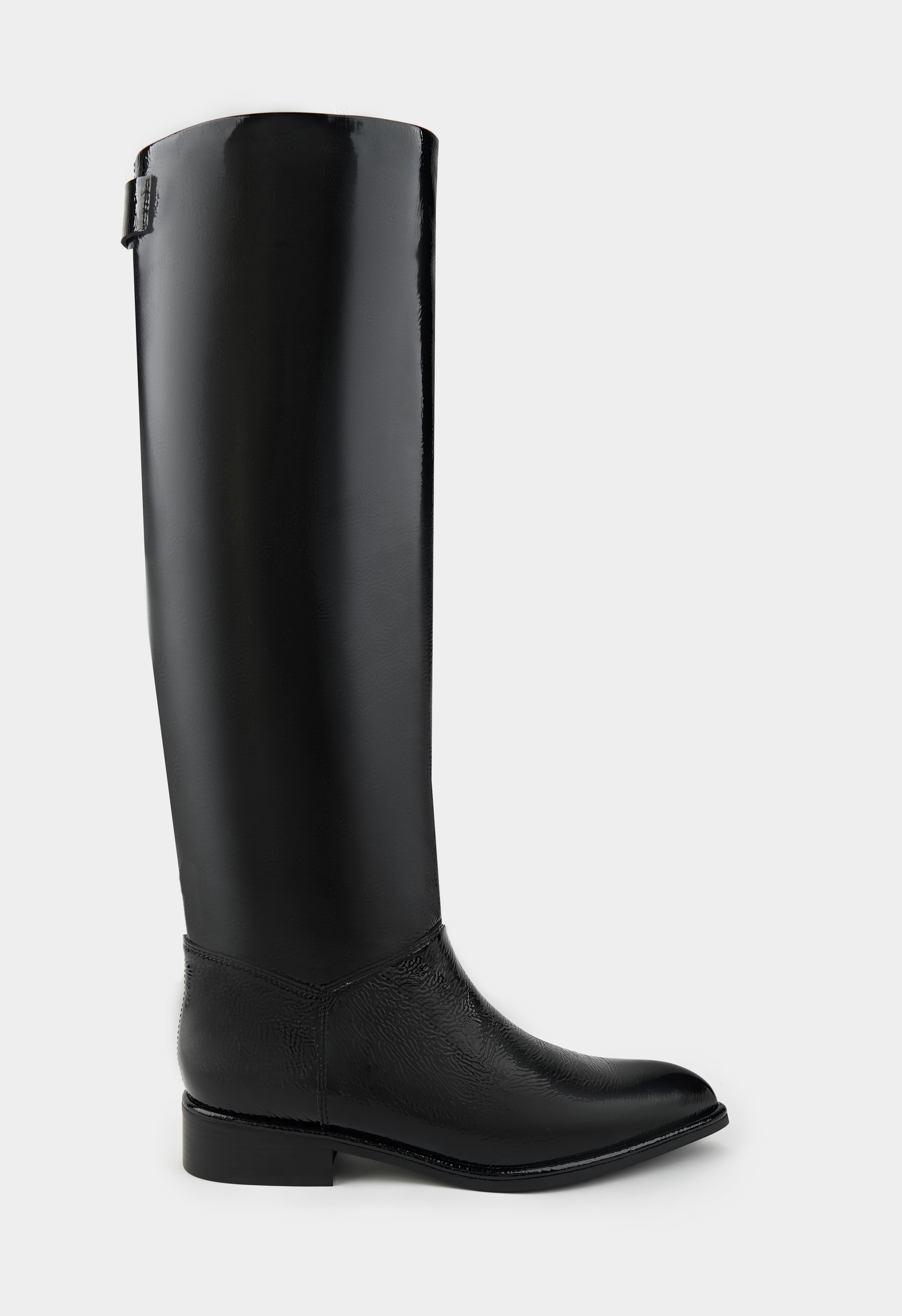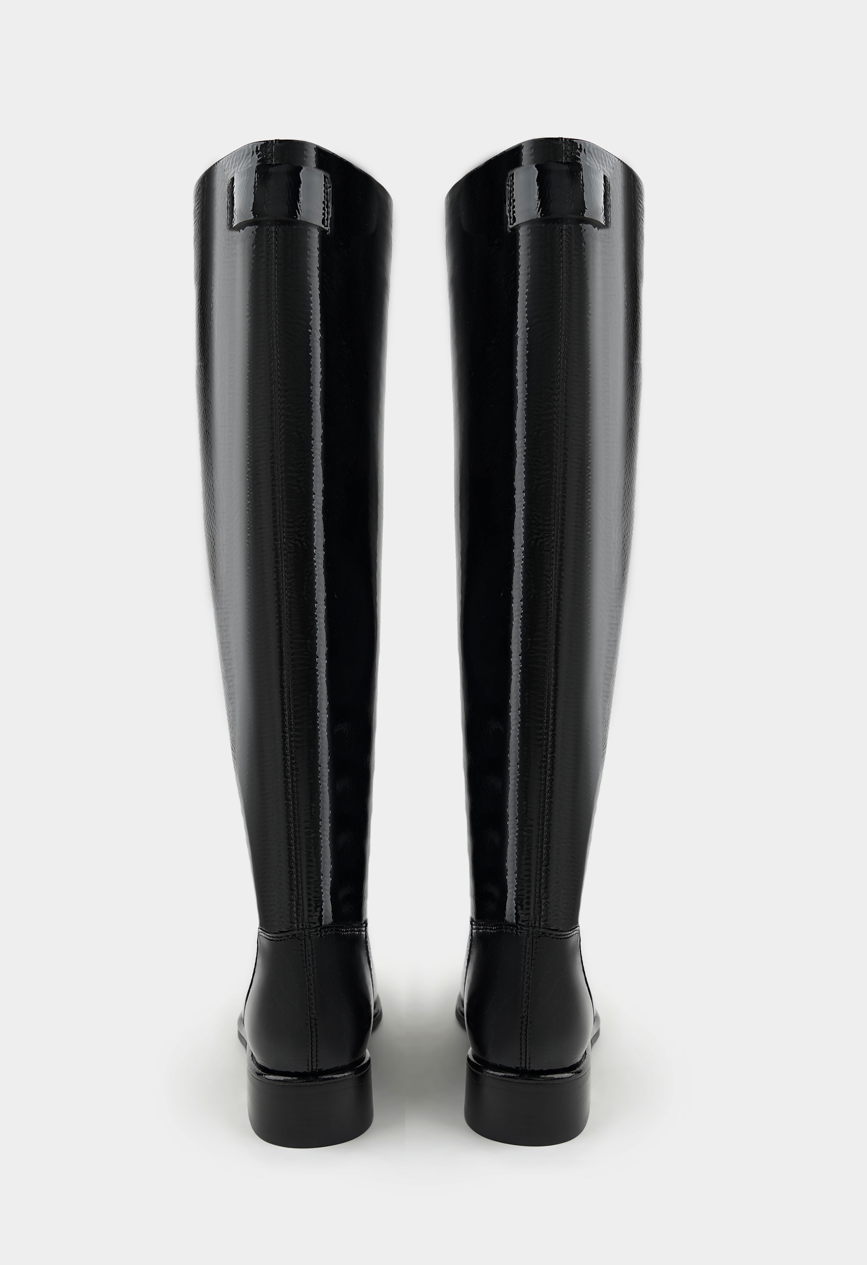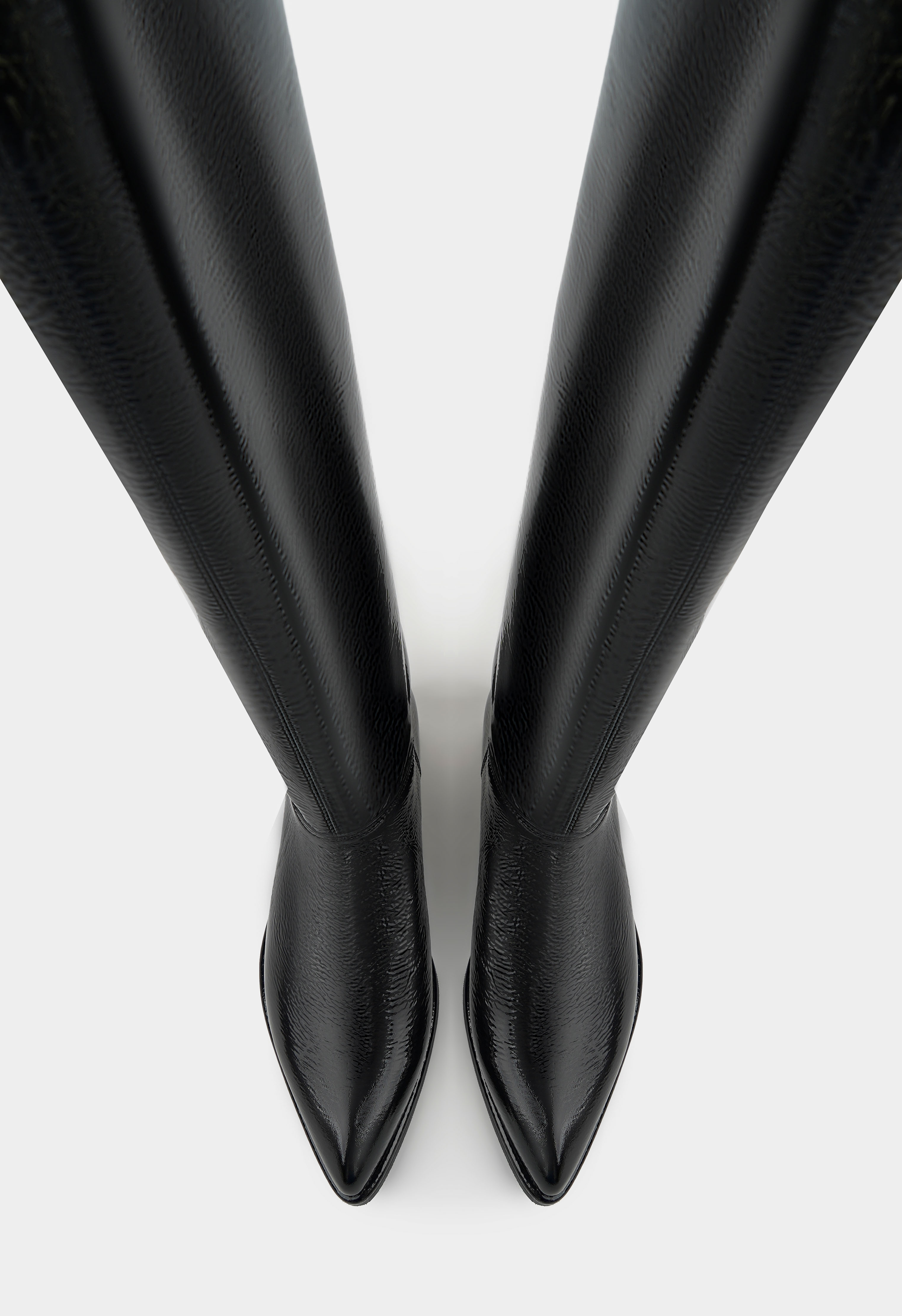 Черные сапоги из натуральной лаковой кожи с подкладкой из байки – это идеальный баланс элегантности и практичности. Заостренный мысок придает образу изящность, а широкий каблук обеспечивает комфорт и стабильность при каждом шаге. Гибкая подошва делает обувь удобной для долгих прогулок. Эта модель легко вписывается в повседневный гардероб и дополнит как классические, так и более смелые образы, подчеркивая актуальность образа.
