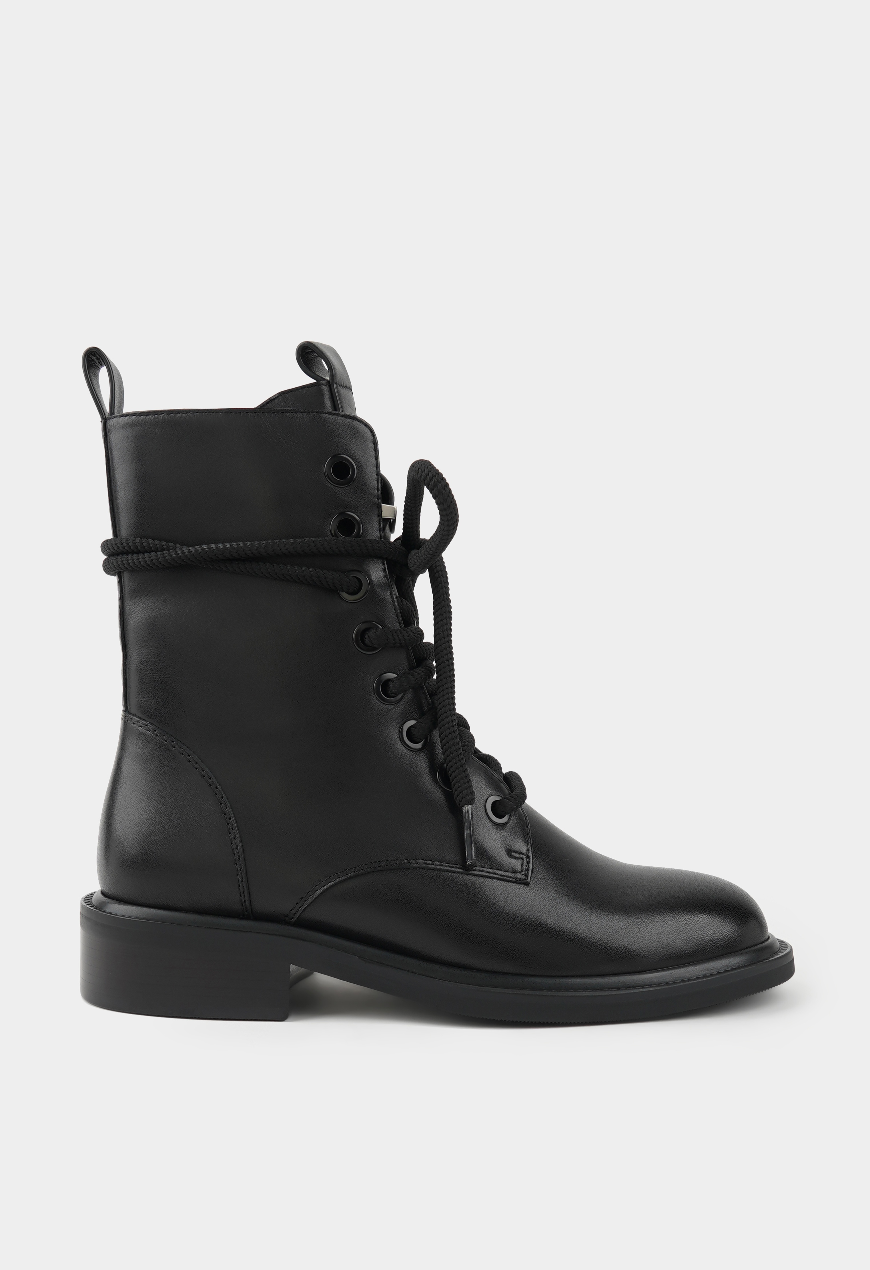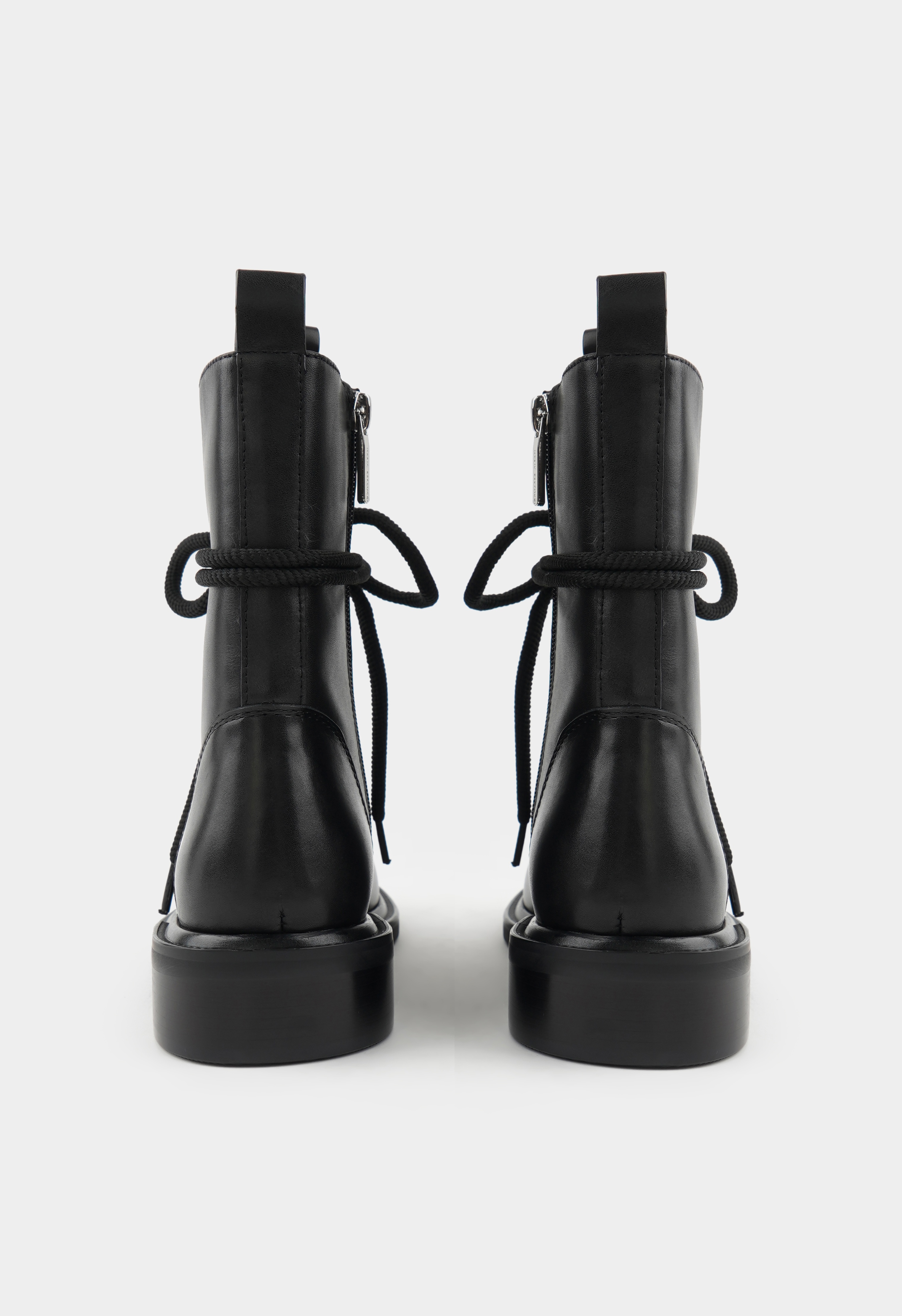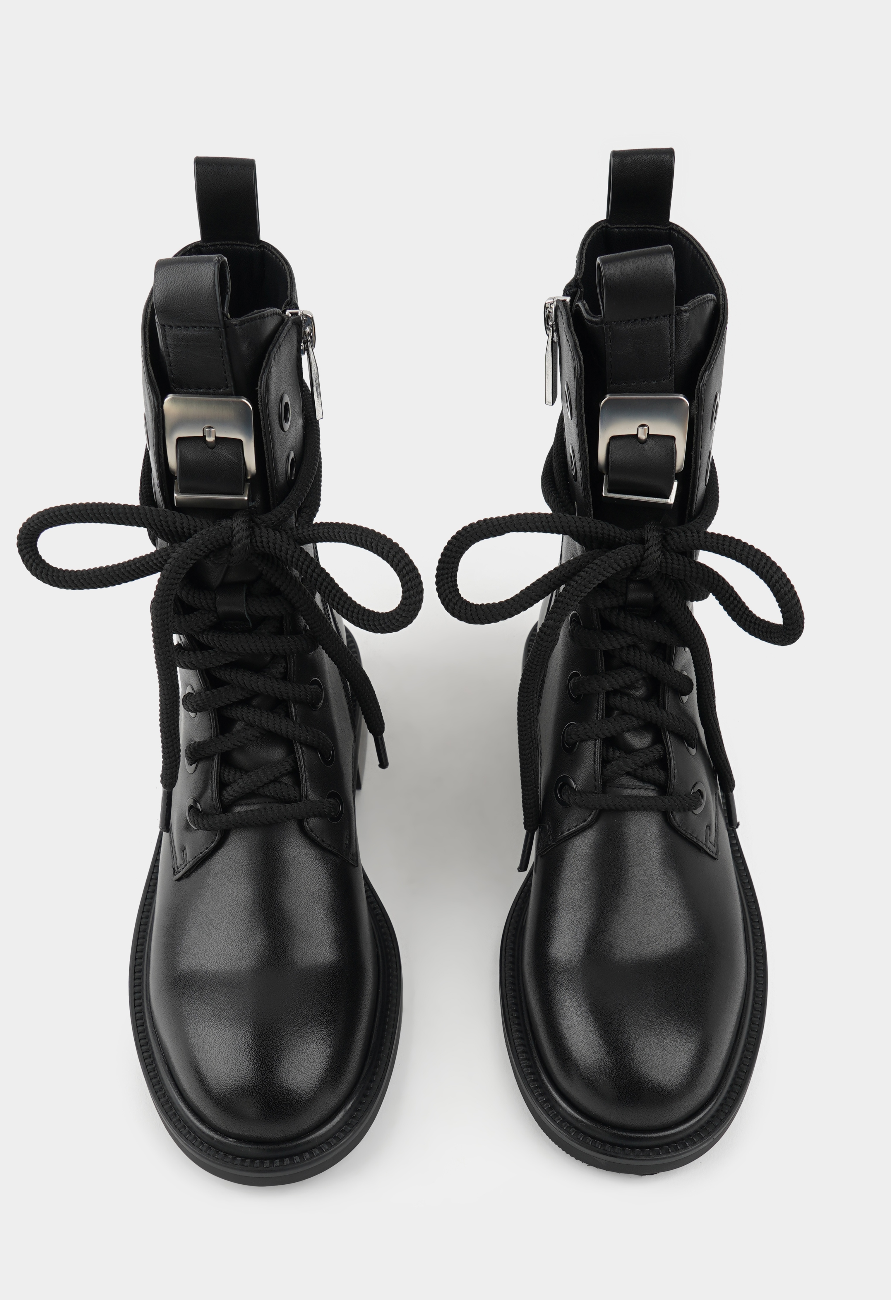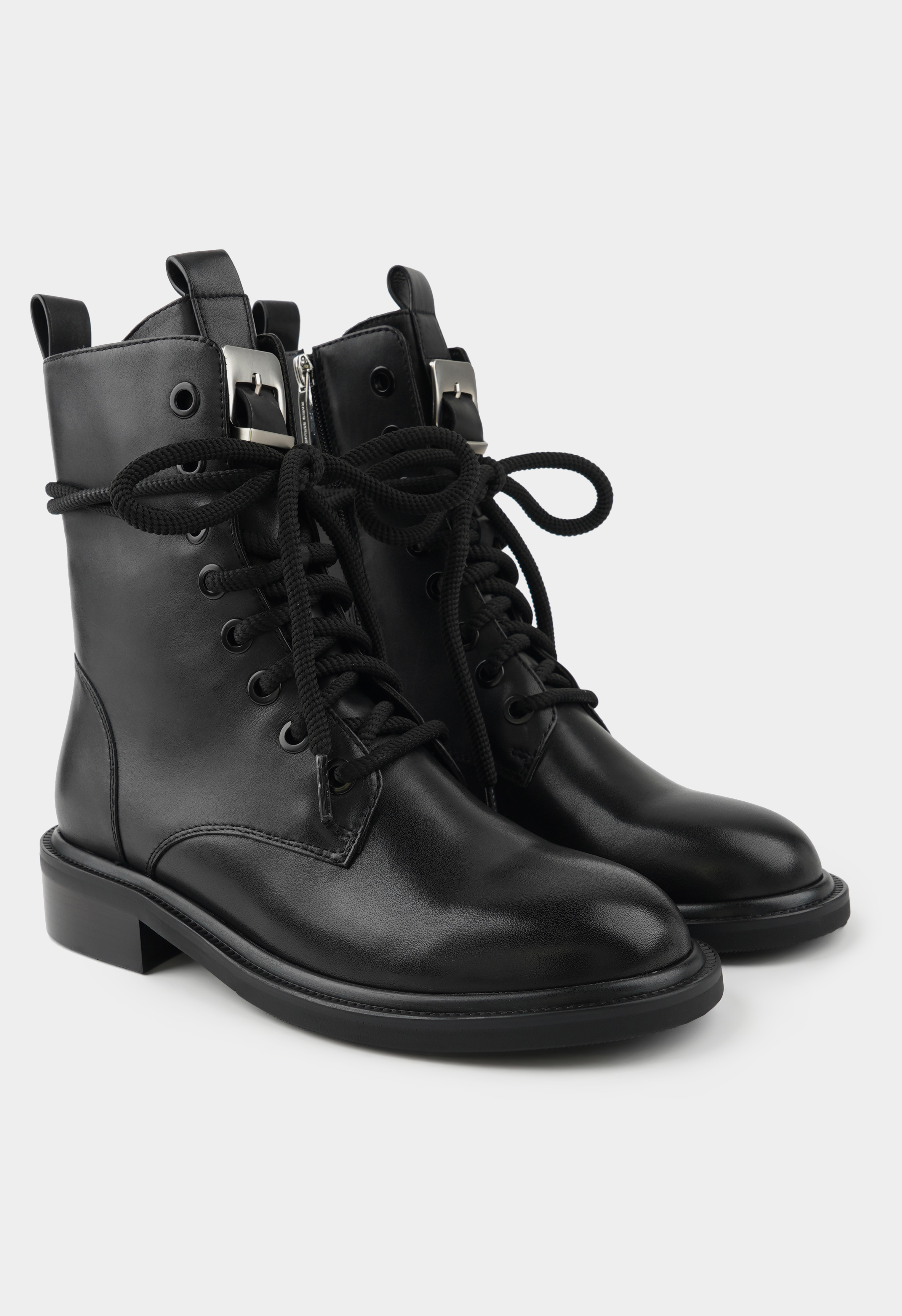 Стильные черные ботинки из натуральной кожи с мягкой подкладкой из байки станут надежной парой для холодного сезона. Жесткая подошва и устойчивый широкий каблук обеспечивают комфорт при ходьбе, а округлый мысок делает модель универсальной и удобной для повседневной носки. Удобная комбинация молнии и шнуровки позволяет легко регулировать посадку, в то время как серебряная фурнитура придает современный акцент и добавляет стиля. Эти ботинки гармонично сочетают практичность и элегантность, оставаясь уместными как в городе, так и в более неформальных образах.