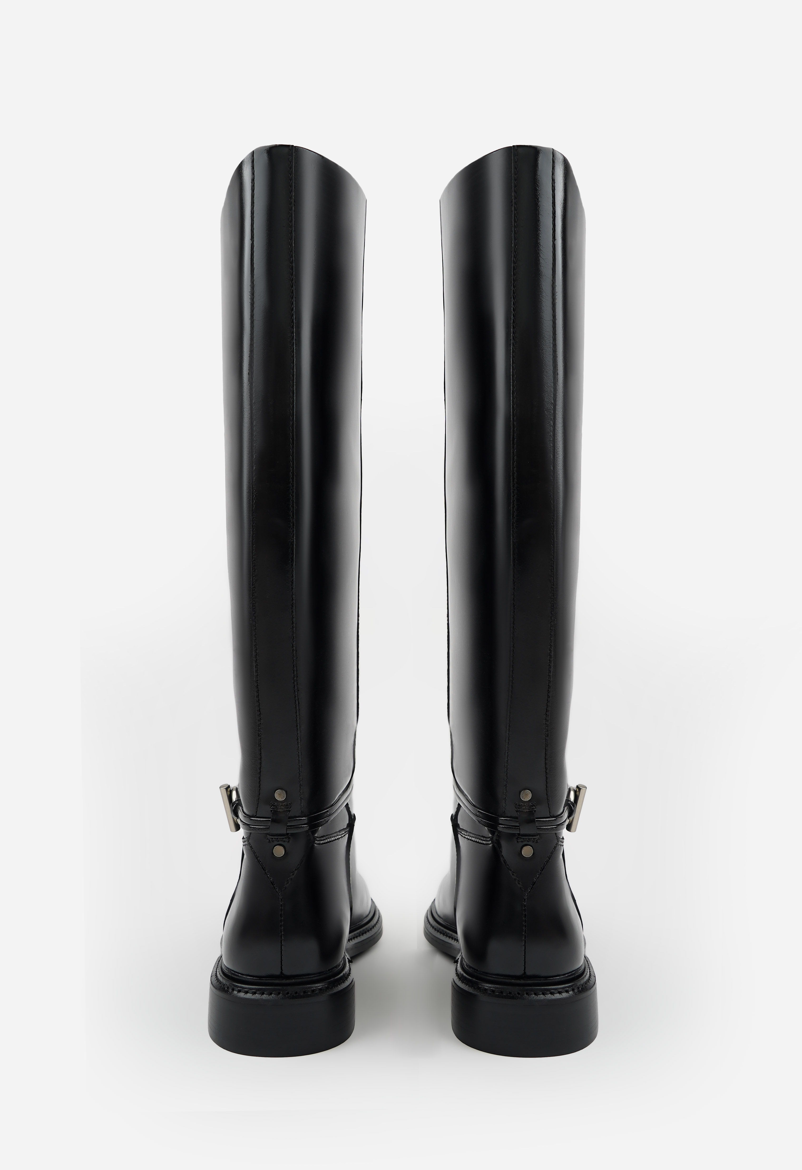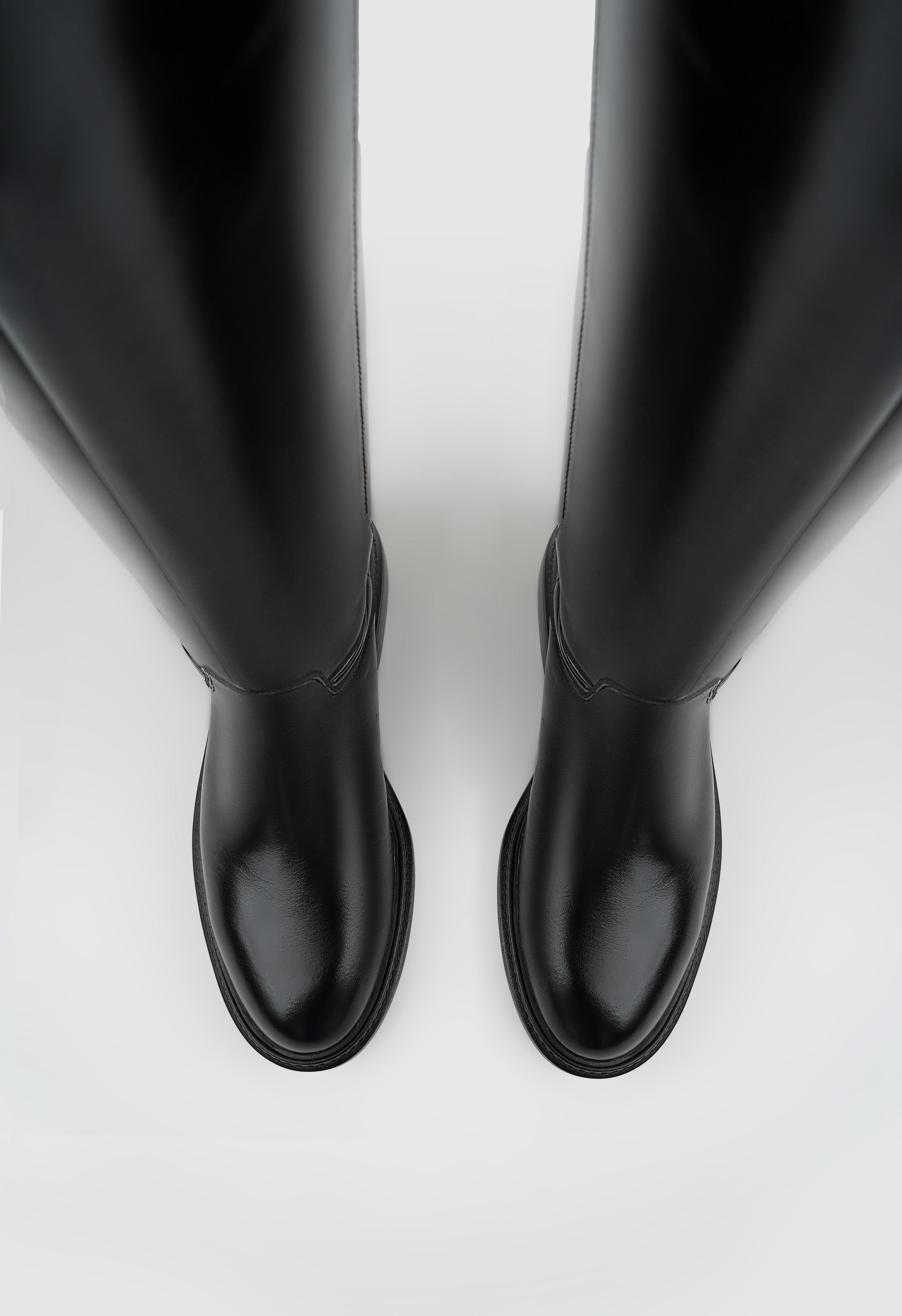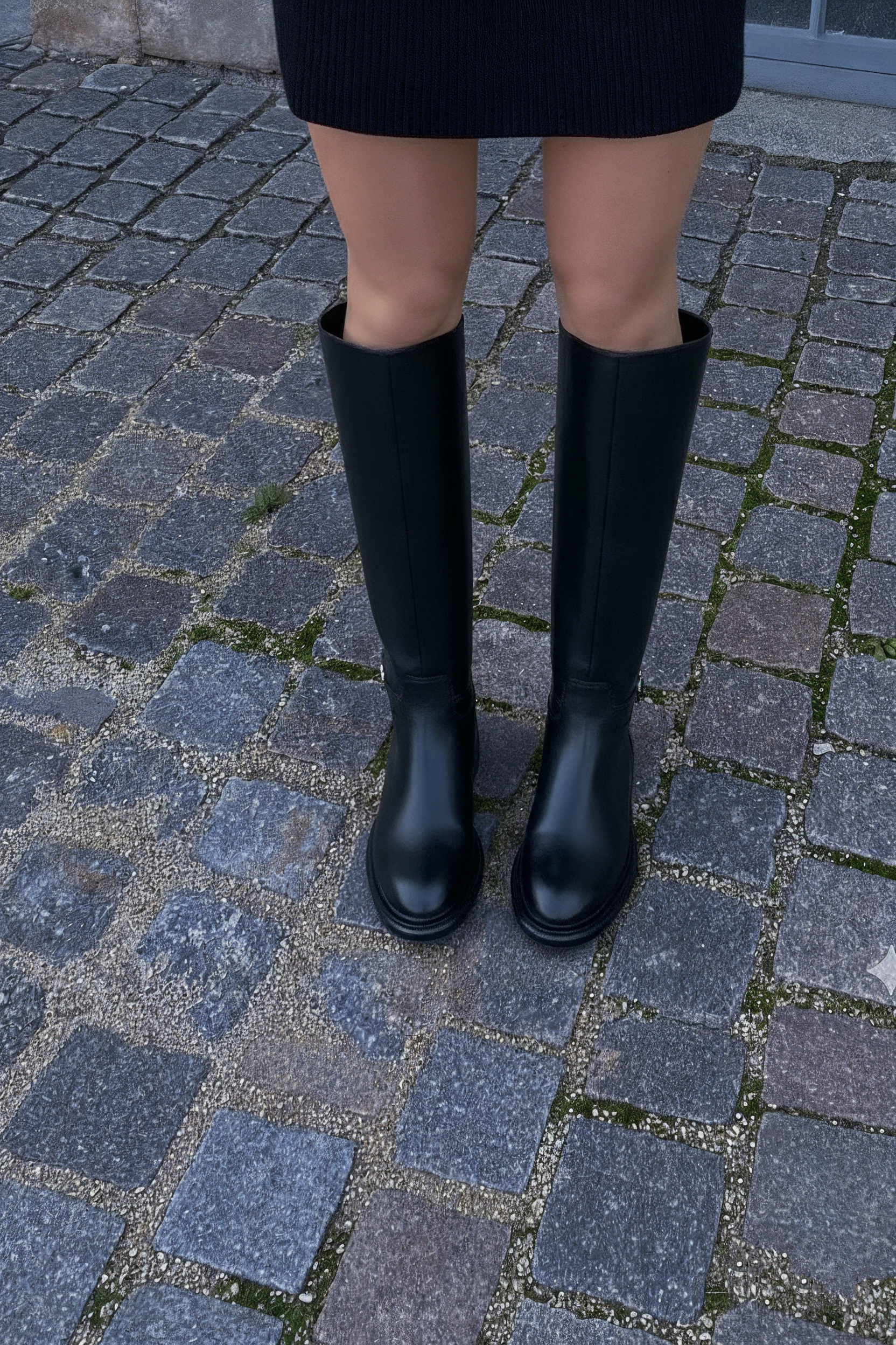 Сапоги из натуральной лаковой кожи в классическом черном цвете – выбор для тех, кто ценит стиль и практичность в одном. Глянцевая поверхность придает образу изысканности, а прочная жесткая подошва и широкий каблук обеспечивают устойчивость и комфорт в повседневной носке. Округлый мысок делает модель удобной даже при длительных прогулках, в то время как фурнитура металлик добавляет современный акцент. Такая пара станет гармоничным дополнением к любому образу, подчеркивая вашу уверенность и безупречное чувство стиля.