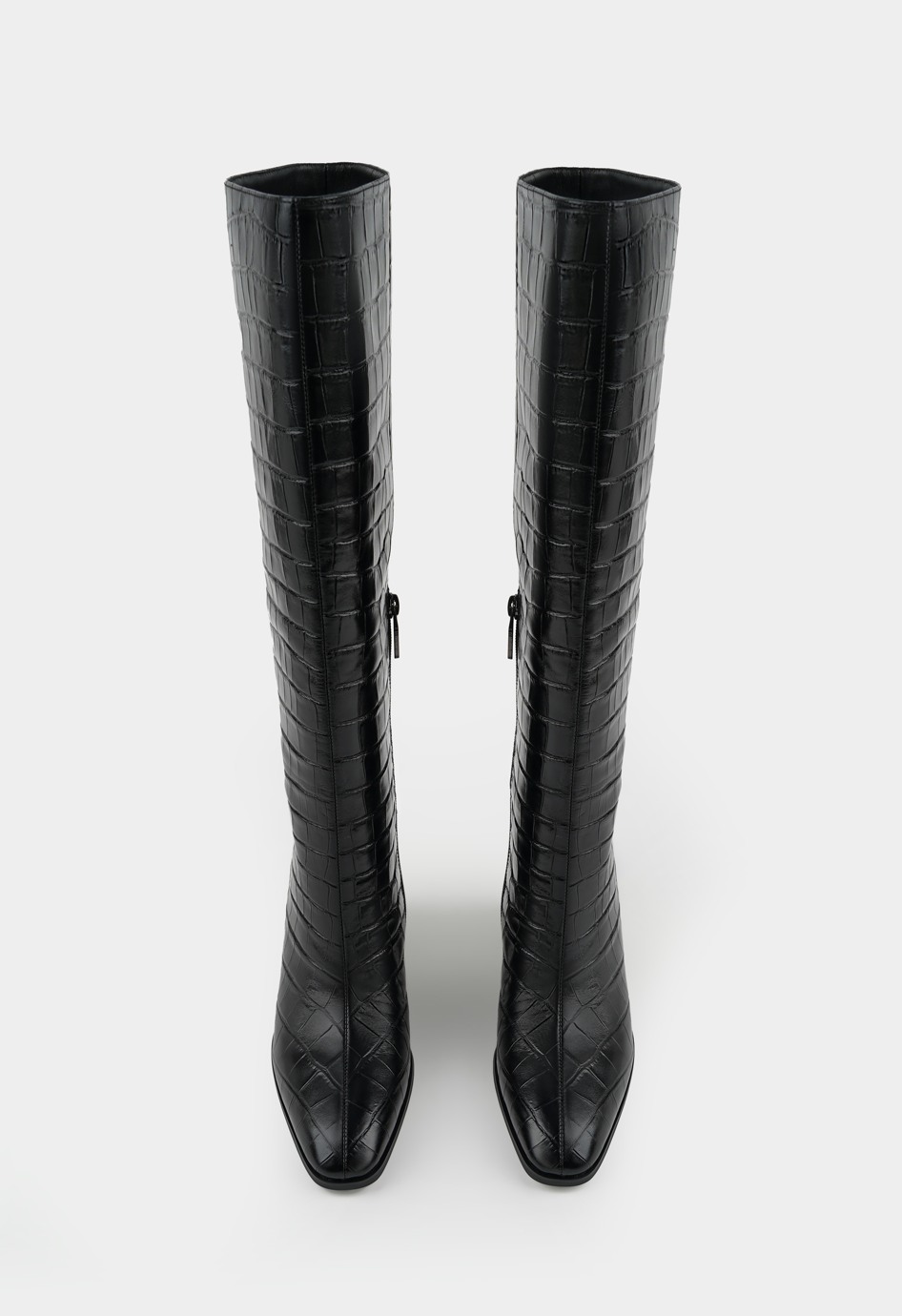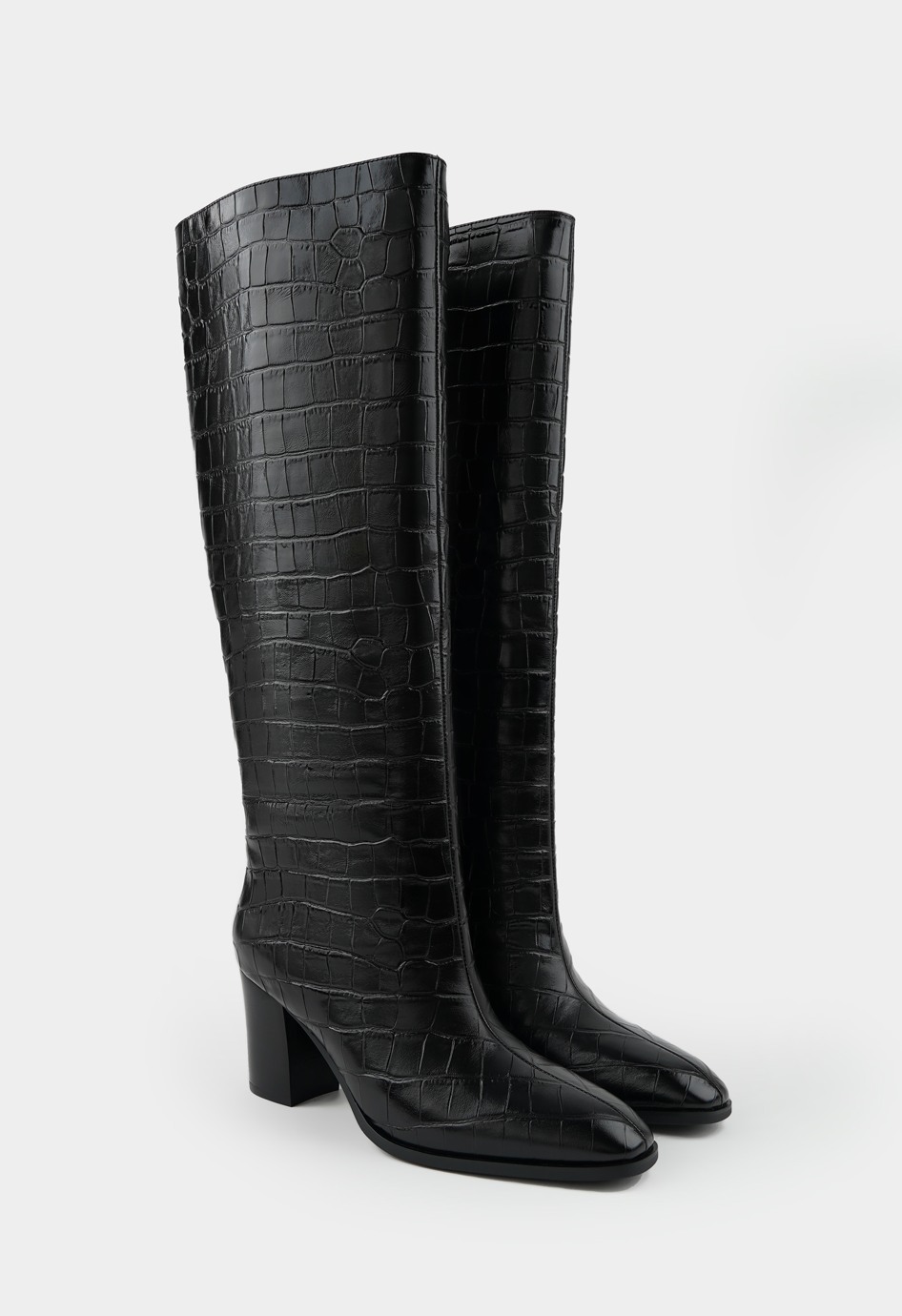 Изысканные сапоги черного цвета с эффектным каблуком-столбиком и элегантным заостренным мыском, выполненные из натуральной кожи. Удобная гибкая подошва и мягкая байковая подкладка обеспечивают комфорт при длительной носке, а стильная фурнитура металлик с боковой молнией добавляет образу современный вид. Универсальная модель станет идеальным дополнением как для делового гардероба, так и для вечернего выхода, прекрасно сочетаясь с любыми женственными образами.