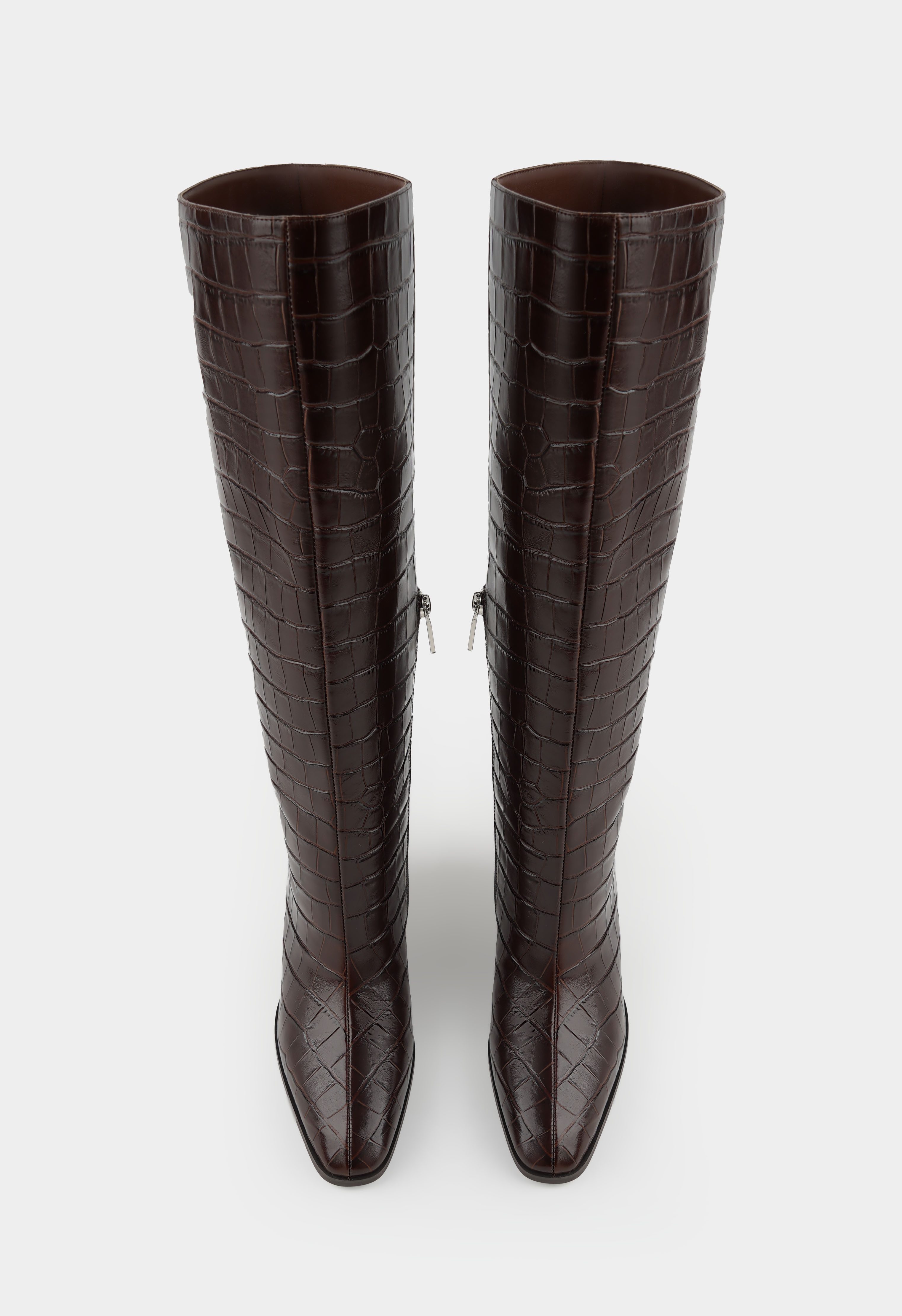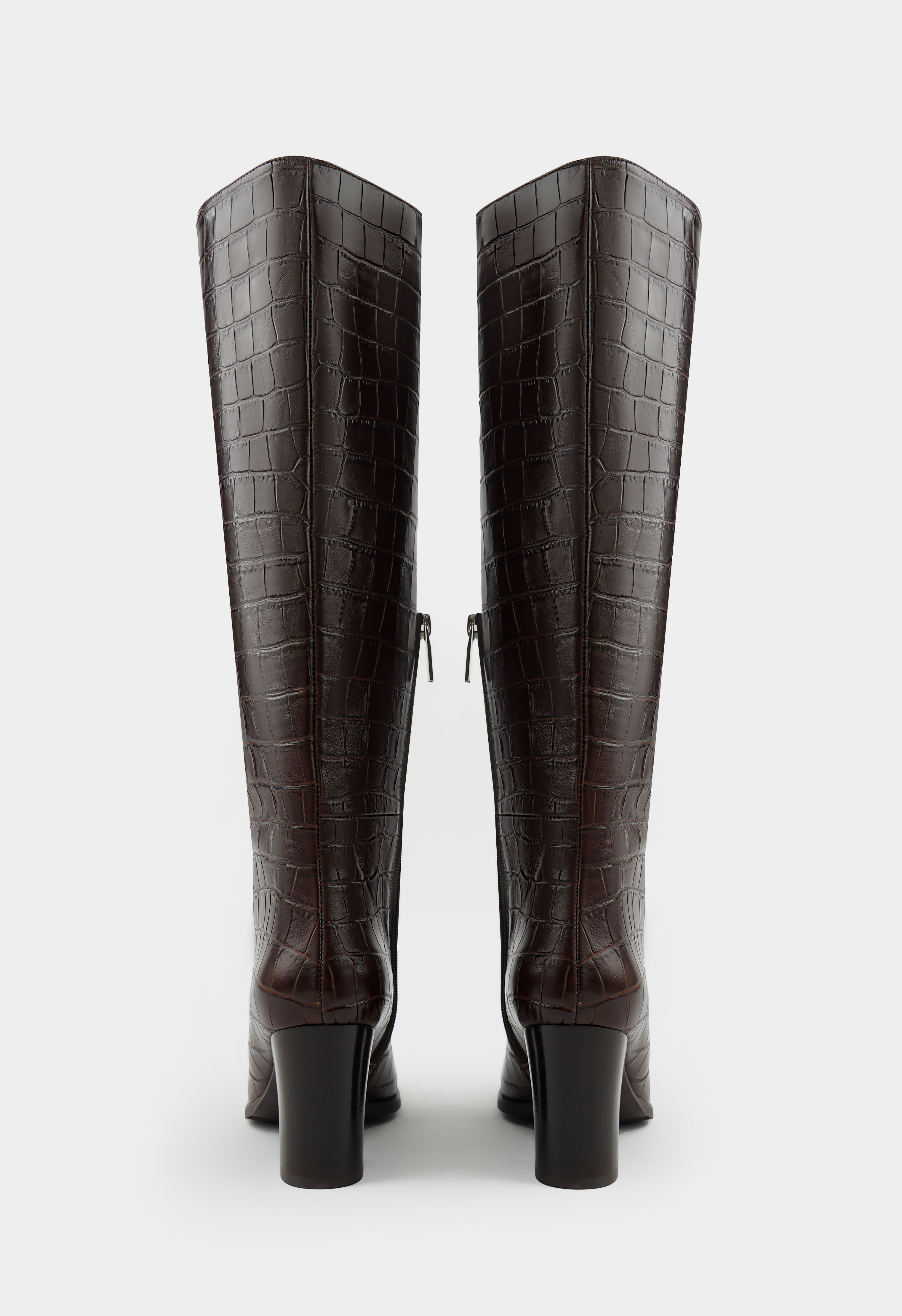 Изысканные сапоги коричневого цвета с эффектным каблуком-столбиком и элегантным заостренным мыском, выполненные из натуральной кожи. Удобная гибкая подошва и мягкая байковая подкладка обеспечивают комфорт при длительной носке, а стильная фурнитура металлик с боковой молнией добавляет образу современный вид. Универсальная модель станет идеальным дополнением как для делового гардероба, так и для вечернего выхода, прекрасно сочетаясь с любыми женственными образами.