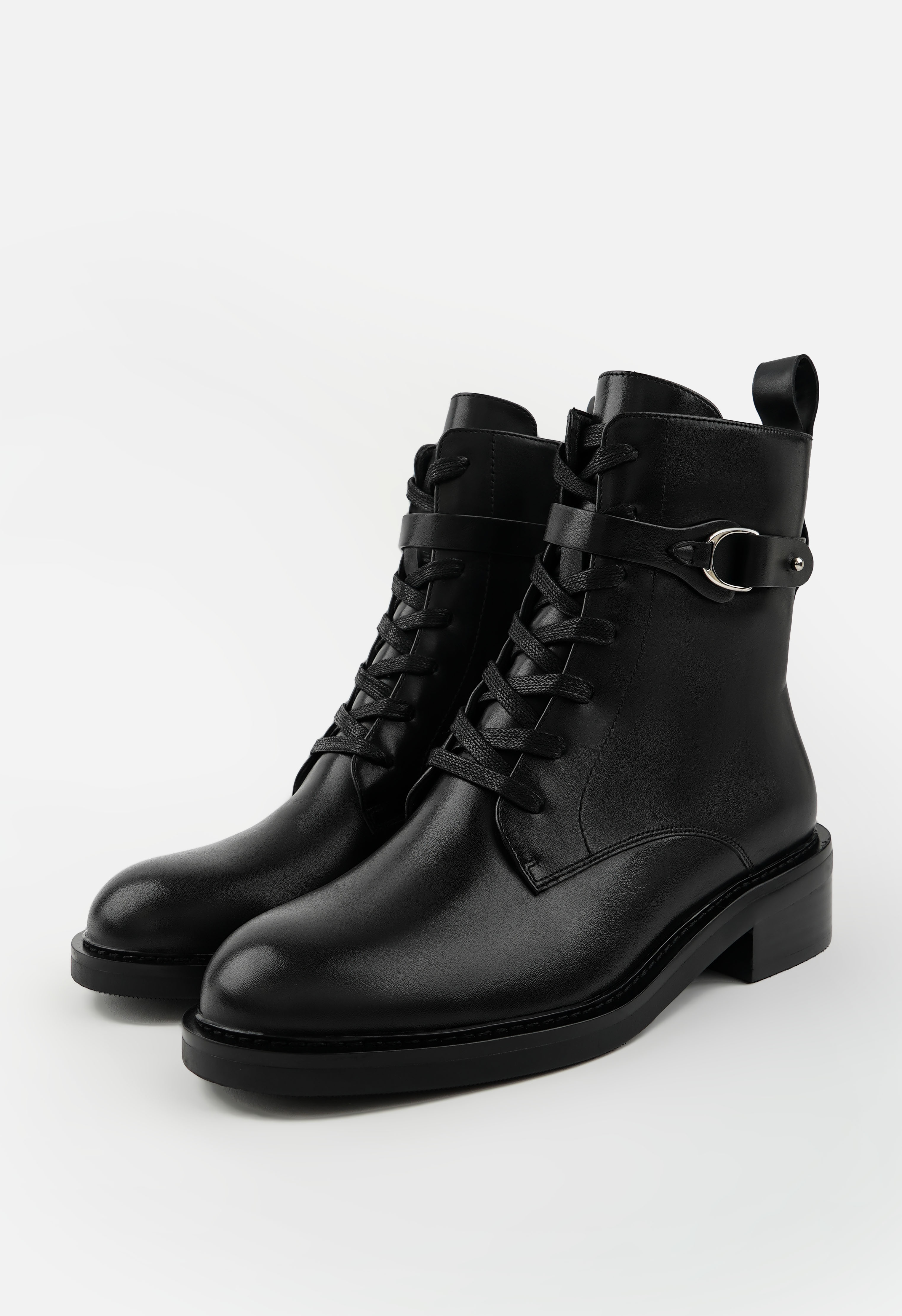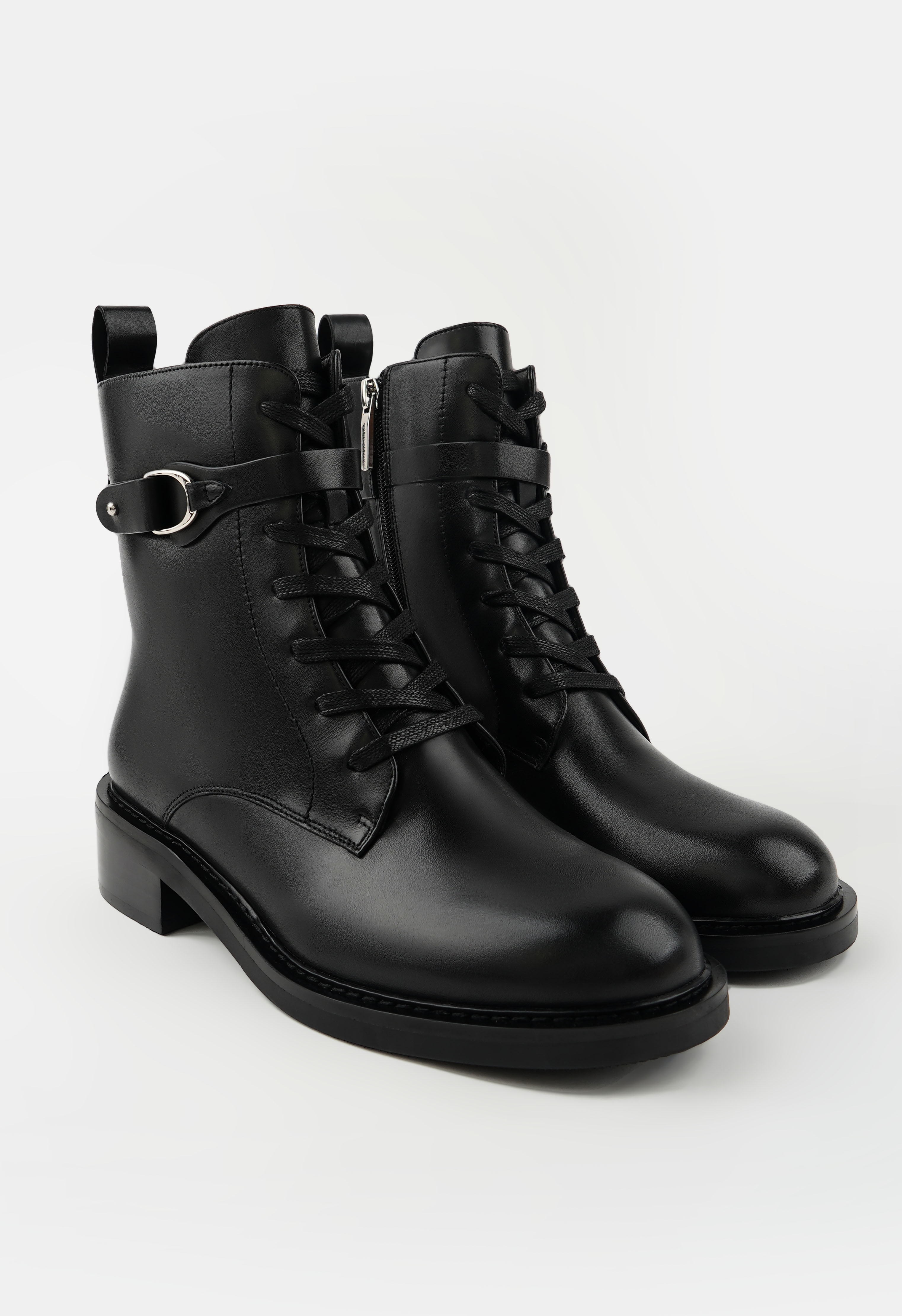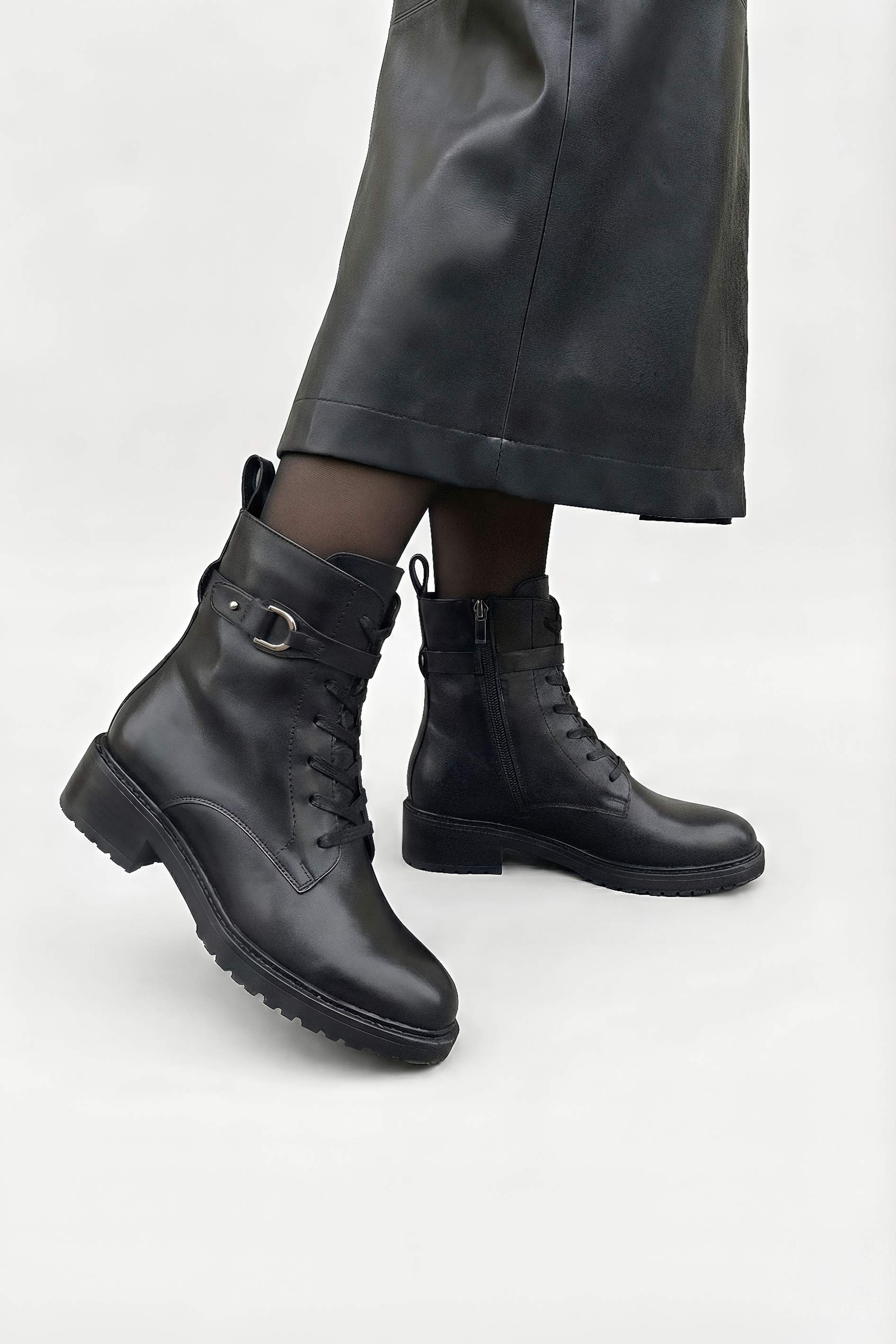 Ботинки из натуральной кожи в универсальном черном цвете – надежный вариант для прохладного сезона, когда важны и стиль, и комфорт. Внутренняя байка сохраняет тепло, а жесткая подошва и широкий каблук дарят уверенную опору в каждом шаге. Округлый мысок делает модель удобной для повседневной носки, а сочетание молнии и шнуровки позволяет легко регулировать посадку по ноге. Серебряная фурнитура добавляет современный акцент, делая ботинки гармоничным сочетанием практичности и стильного дизайна.