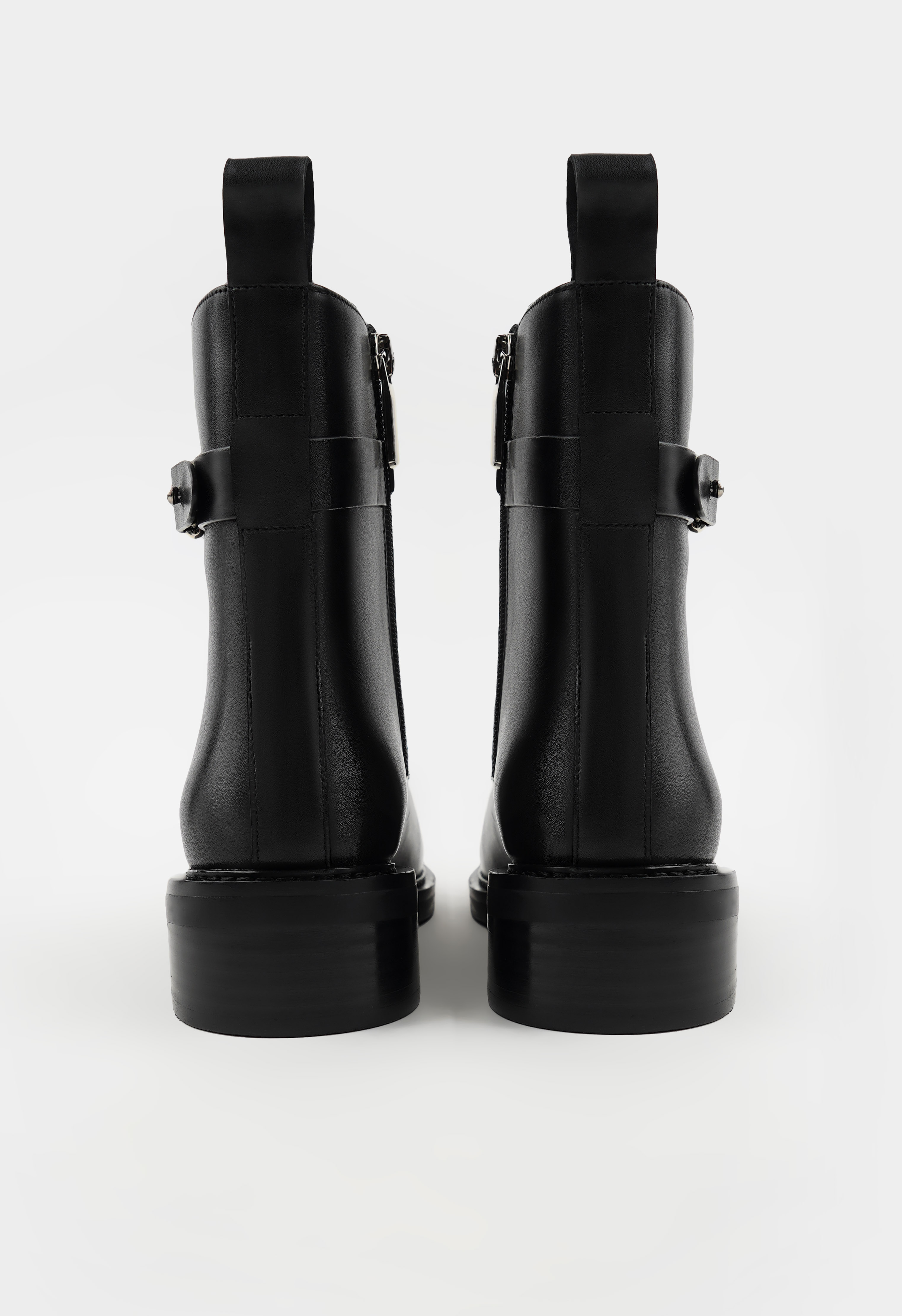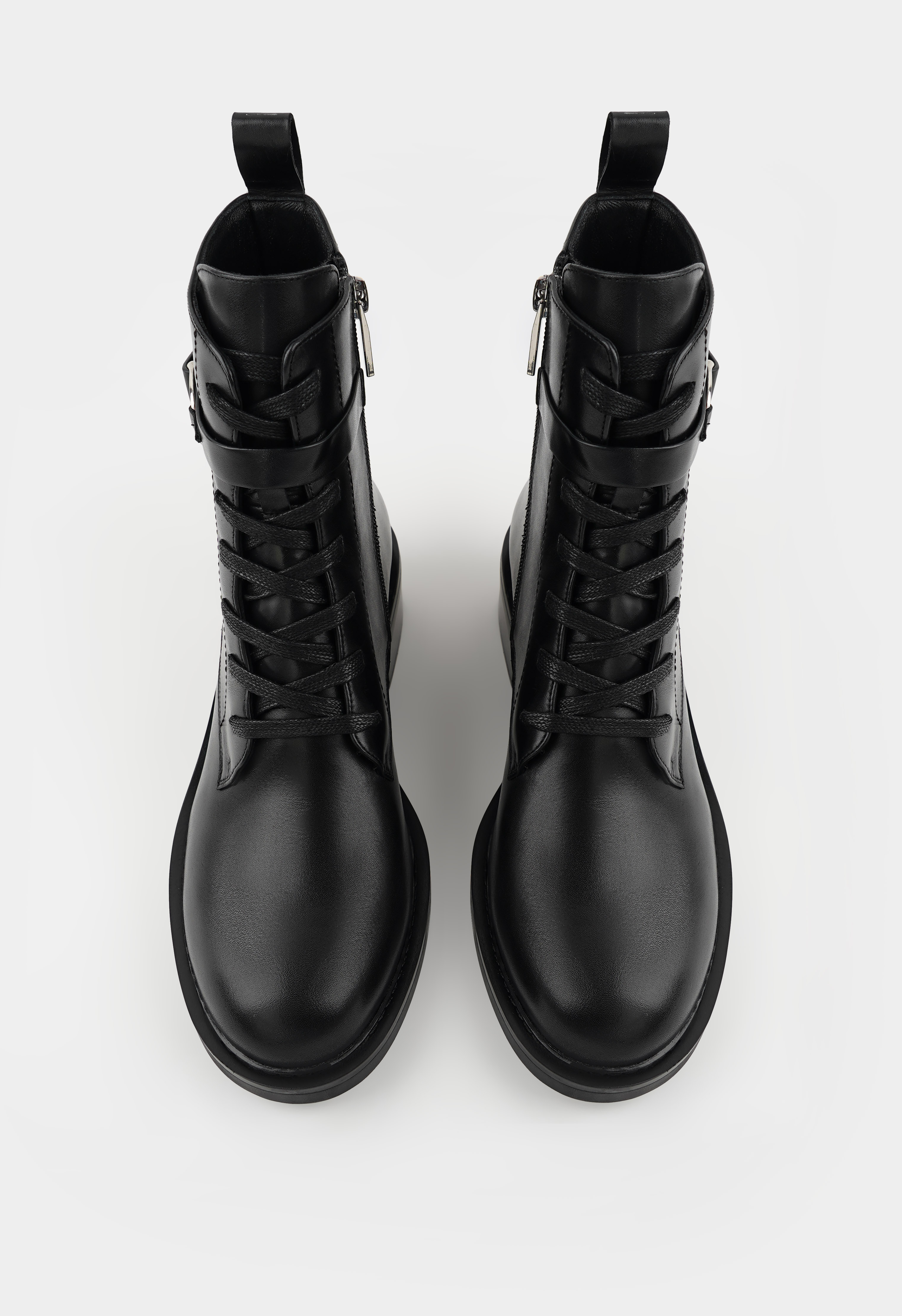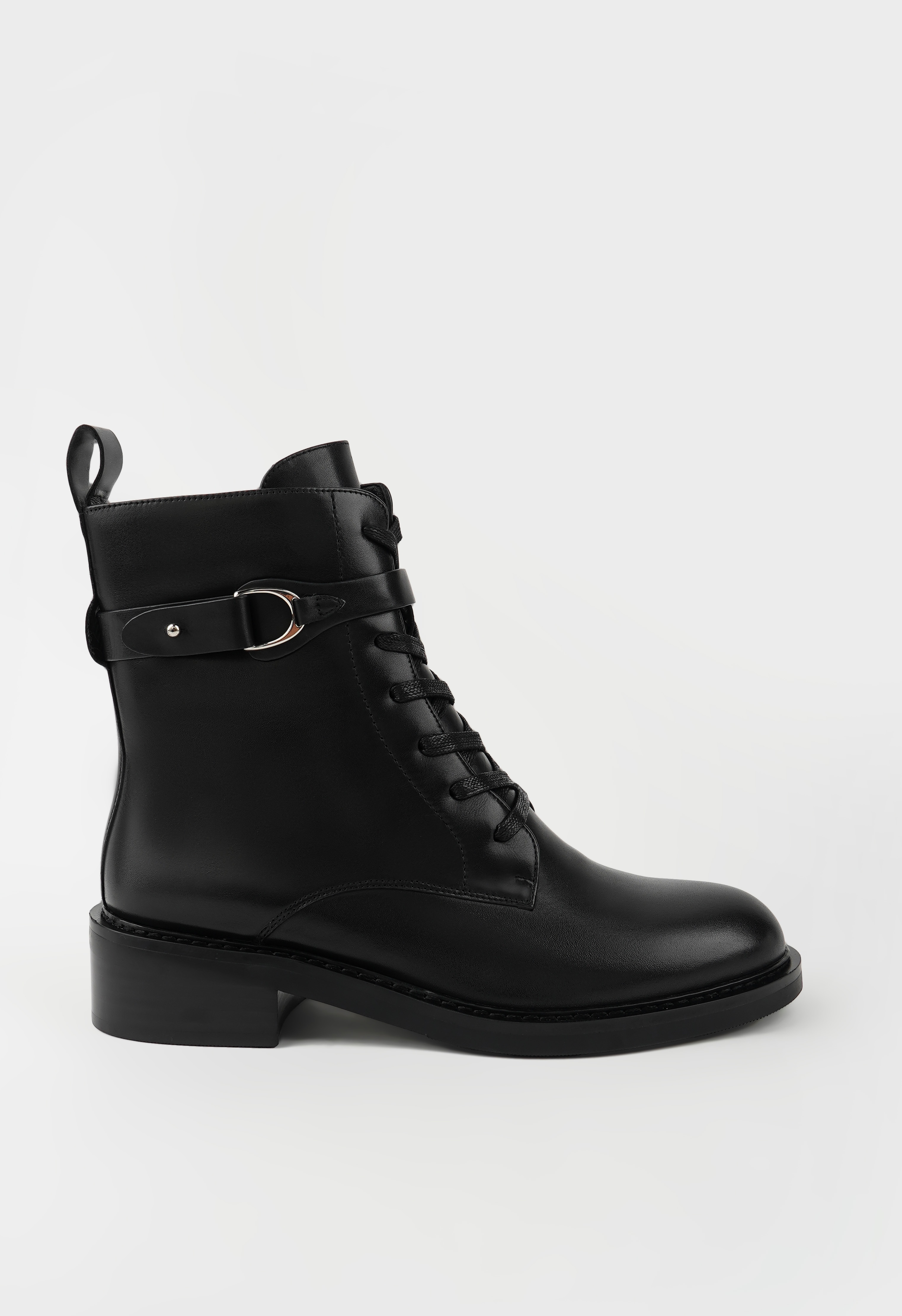 Ботинки из натуральной кожи в универсальном черном цвете – надежный вариант для прохладного сезона, когда важны и стиль, и комфорт. Внутренняя байка сохраняет тепло, а жесткая подошва и широкий каблук дарят уверенную опору в каждом шаге. Округлый мысок делает модель удобной для повседневной носки, а сочетание молнии и шнуровки позволяет легко регулировать посадку по ноге. Серебряная фурнитура добавляет современный акцент, делая ботинки гармоничным сочетанием практичности и стильного дизайна.