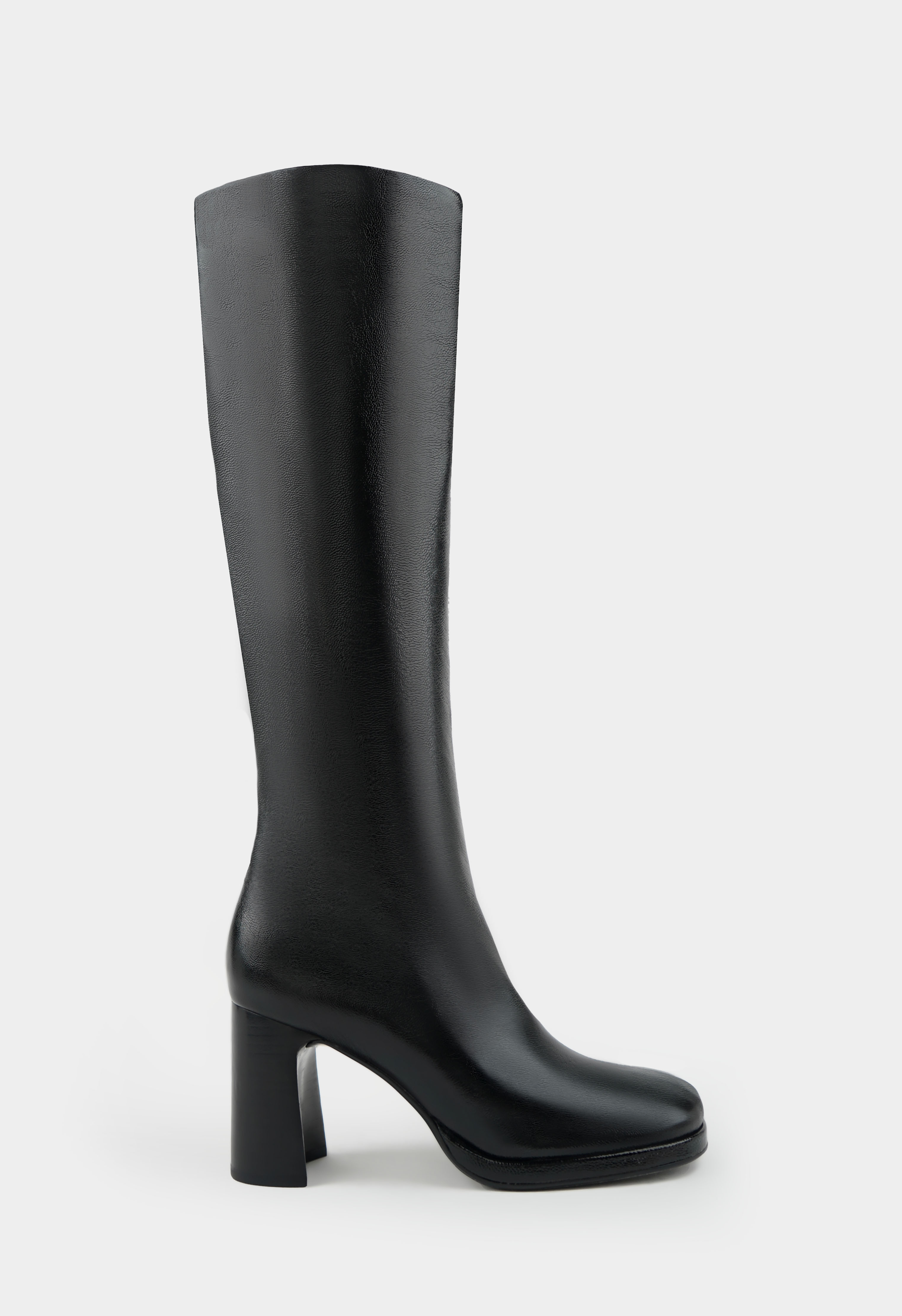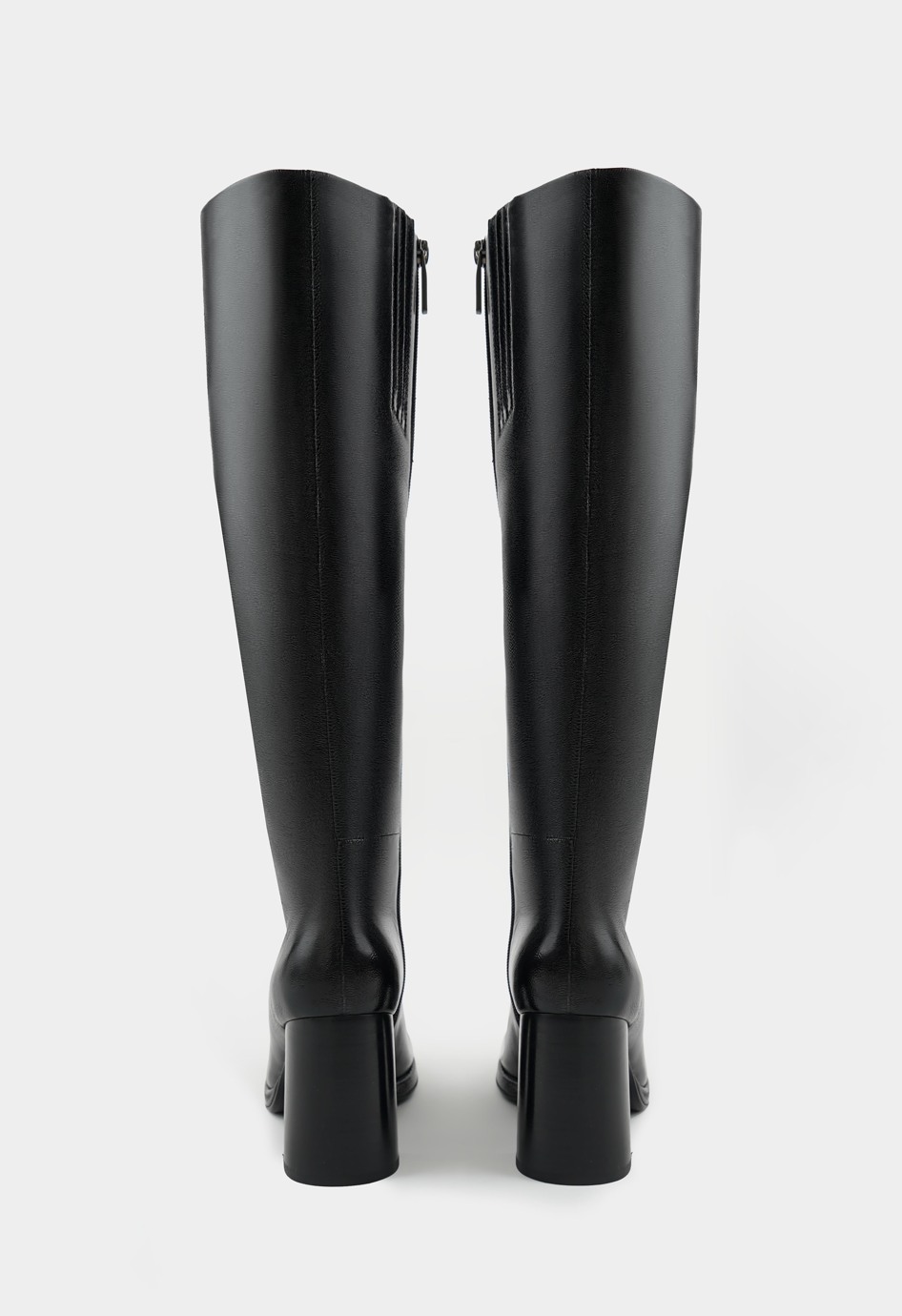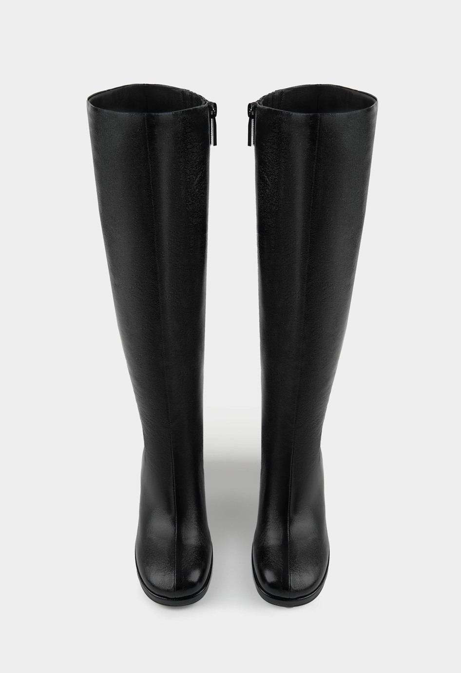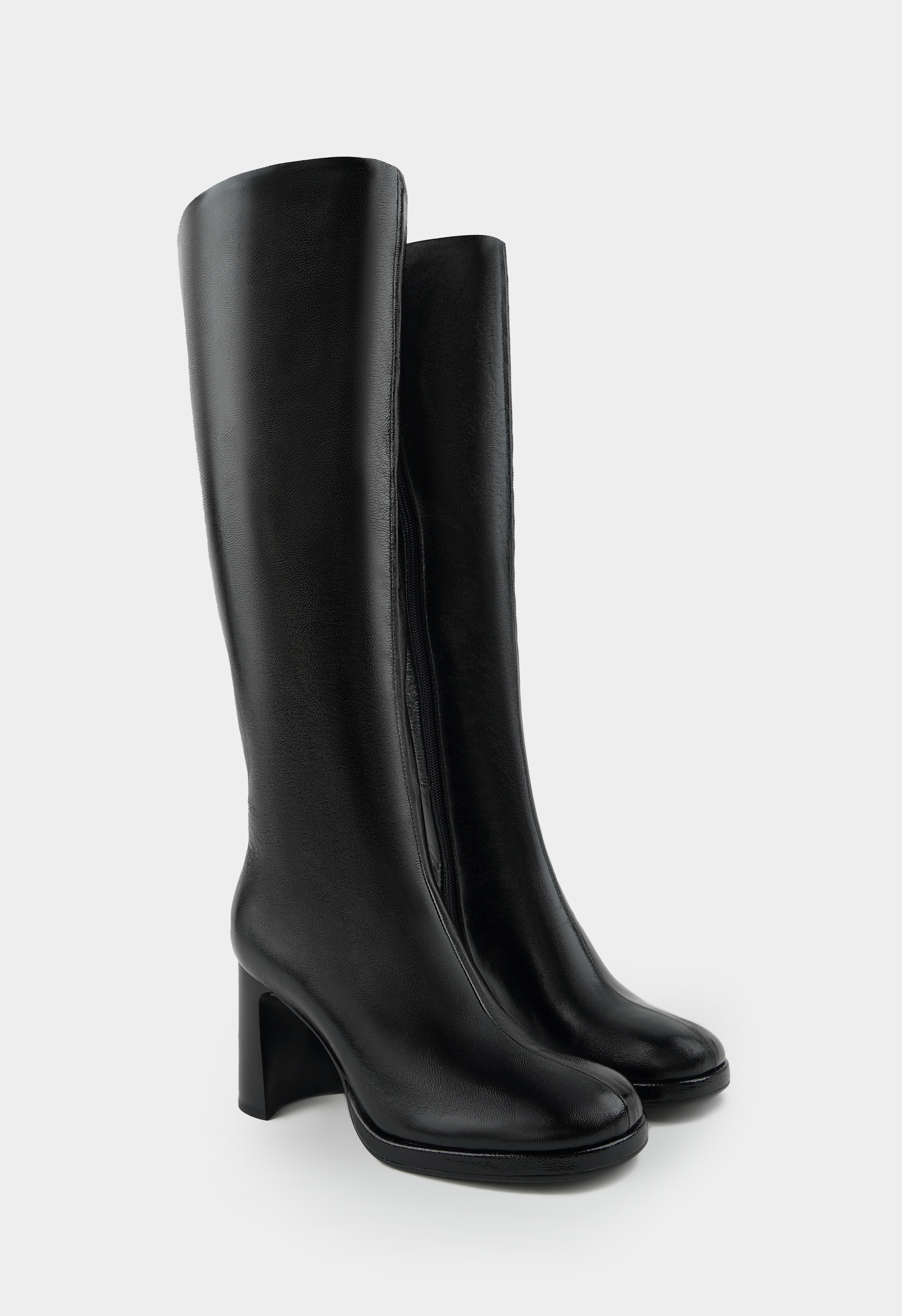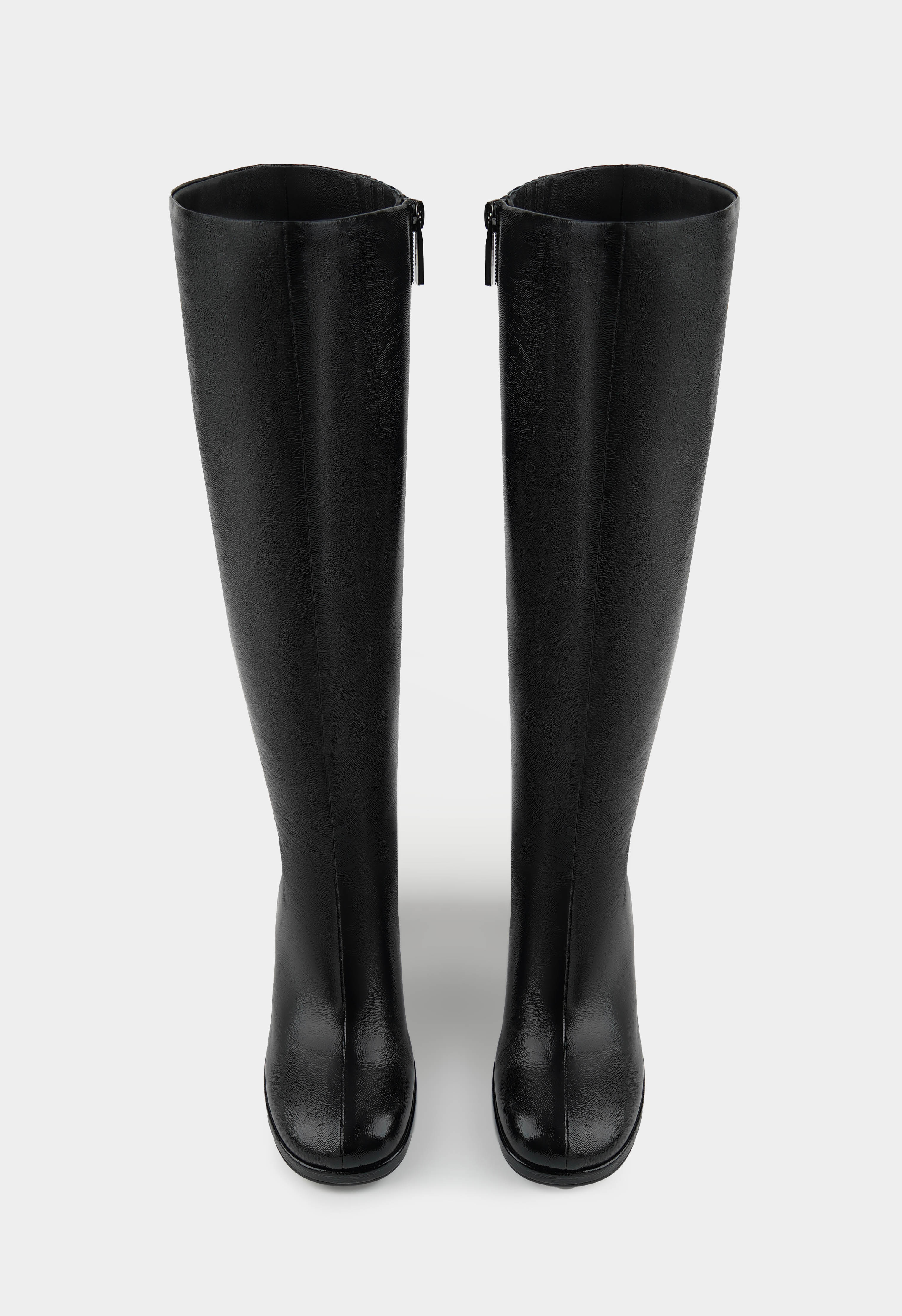 Сапоги черного цвета из натуральной лаковой кожи – смелый акцент для тех, кто выбирает стиль с характером. Глянцевая поверхность придает модели выразительность и современную энергетику, а мягкая байковая подкладка обеспечивает комфорт и уют в прохладное время года. Жесткая подошва гарантирует устойчивость, квадратный мысок подчеркивает трендовый силуэт, в то время как фурнитура в цвете металлик и аккуратная молния добавляют динамичный штрих. Геометричный каблук завершает образ, превращая эти сапоги в эффектный элемент, который легко впишется в как повседневные, так и вечерние образы.