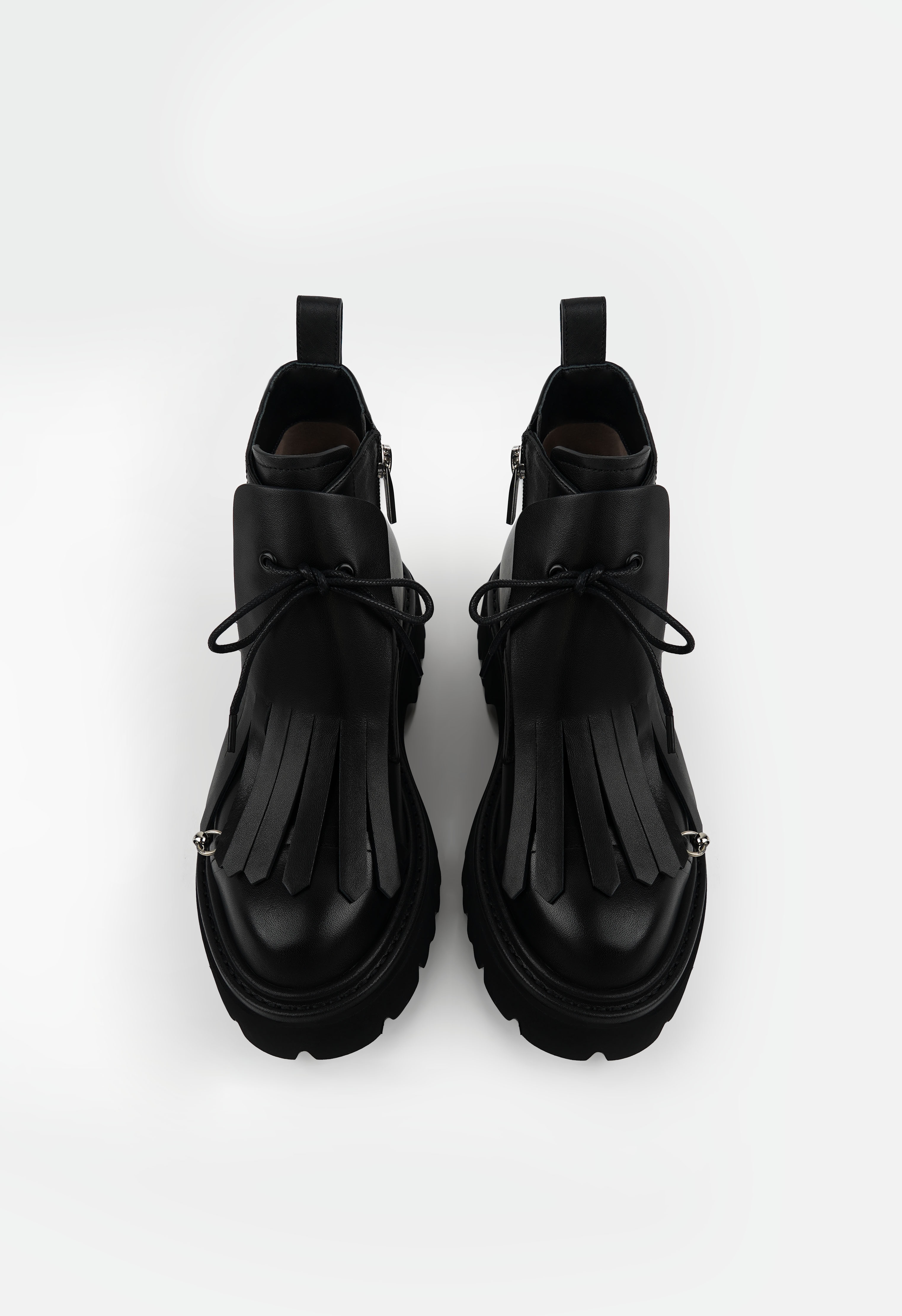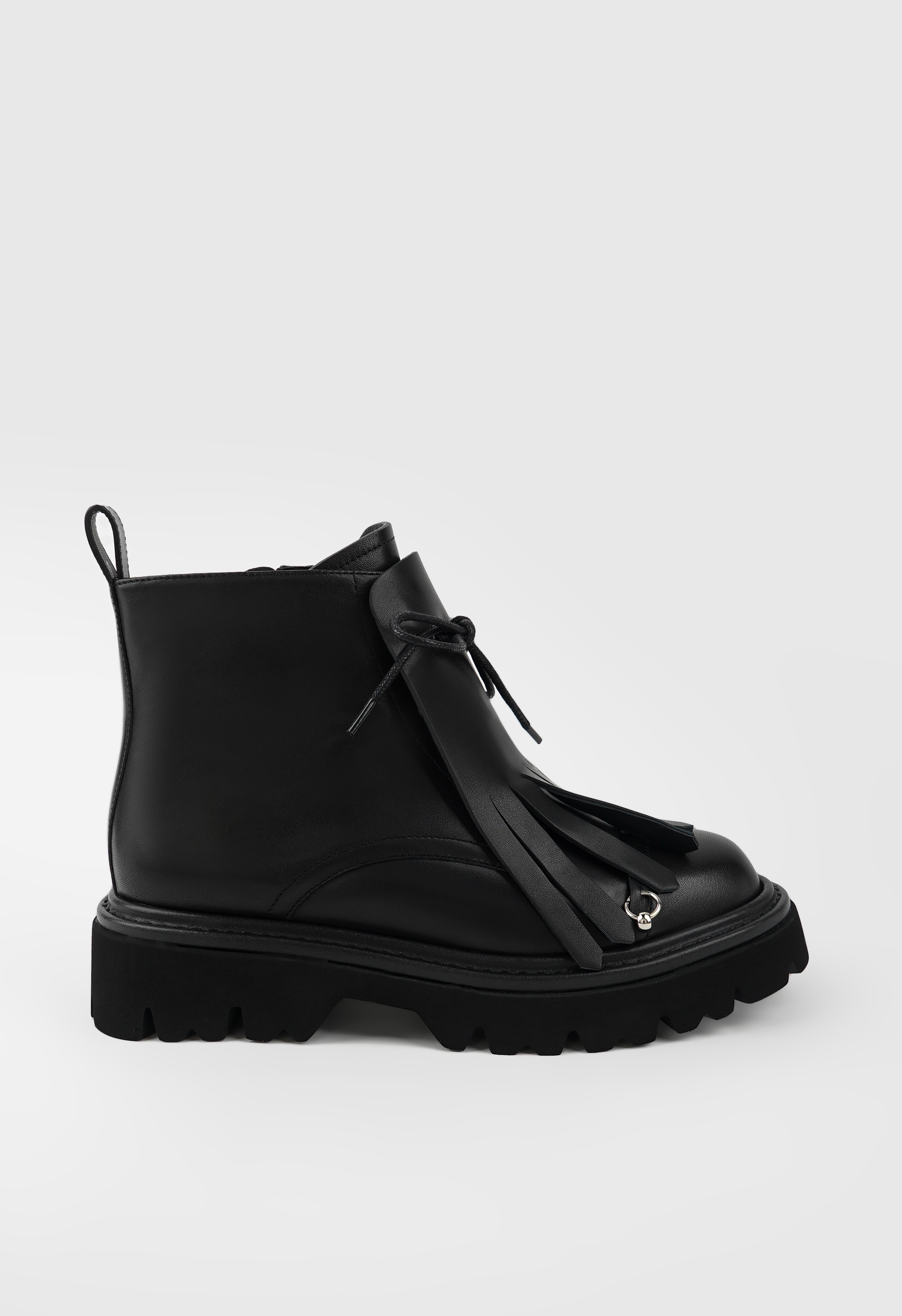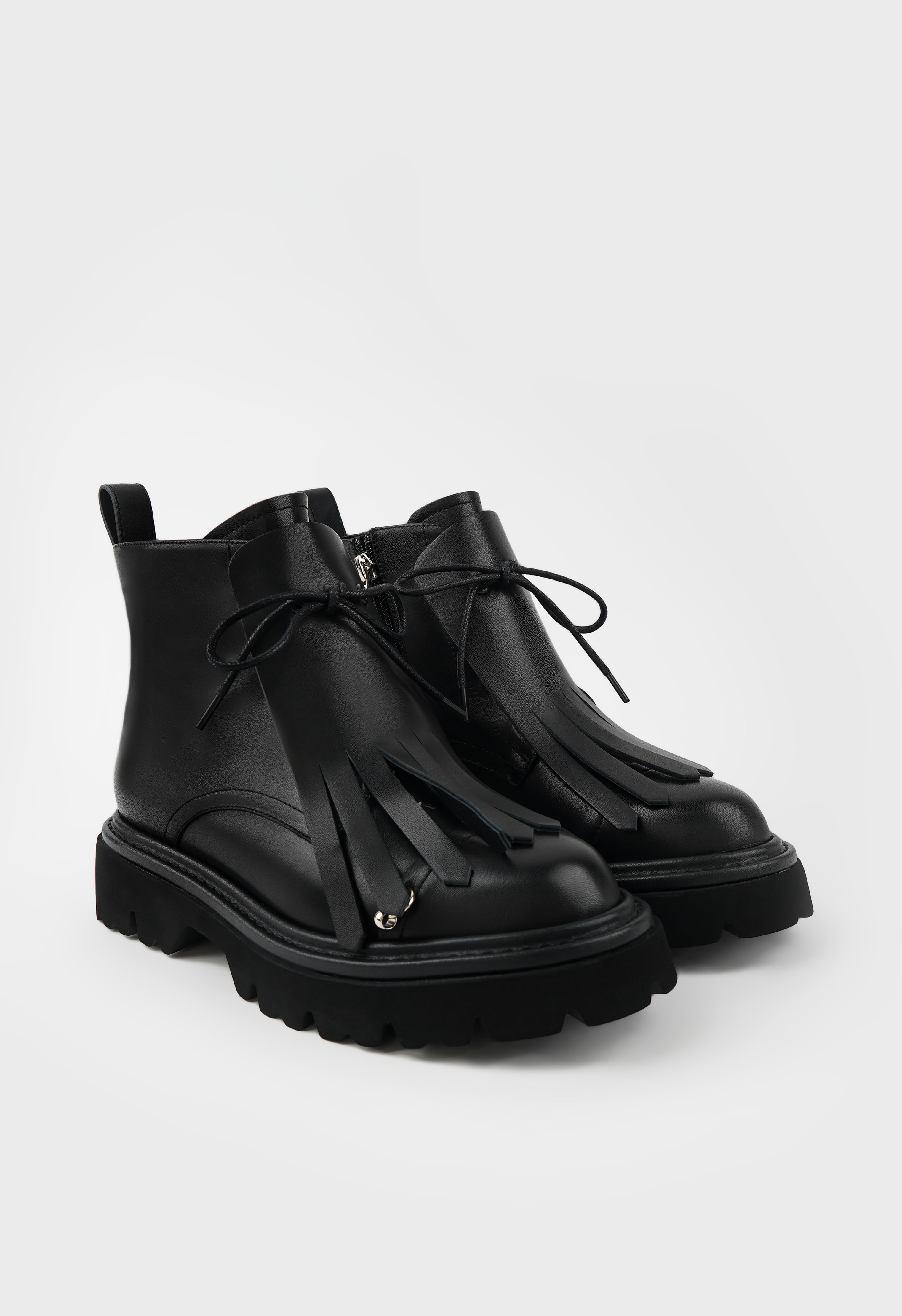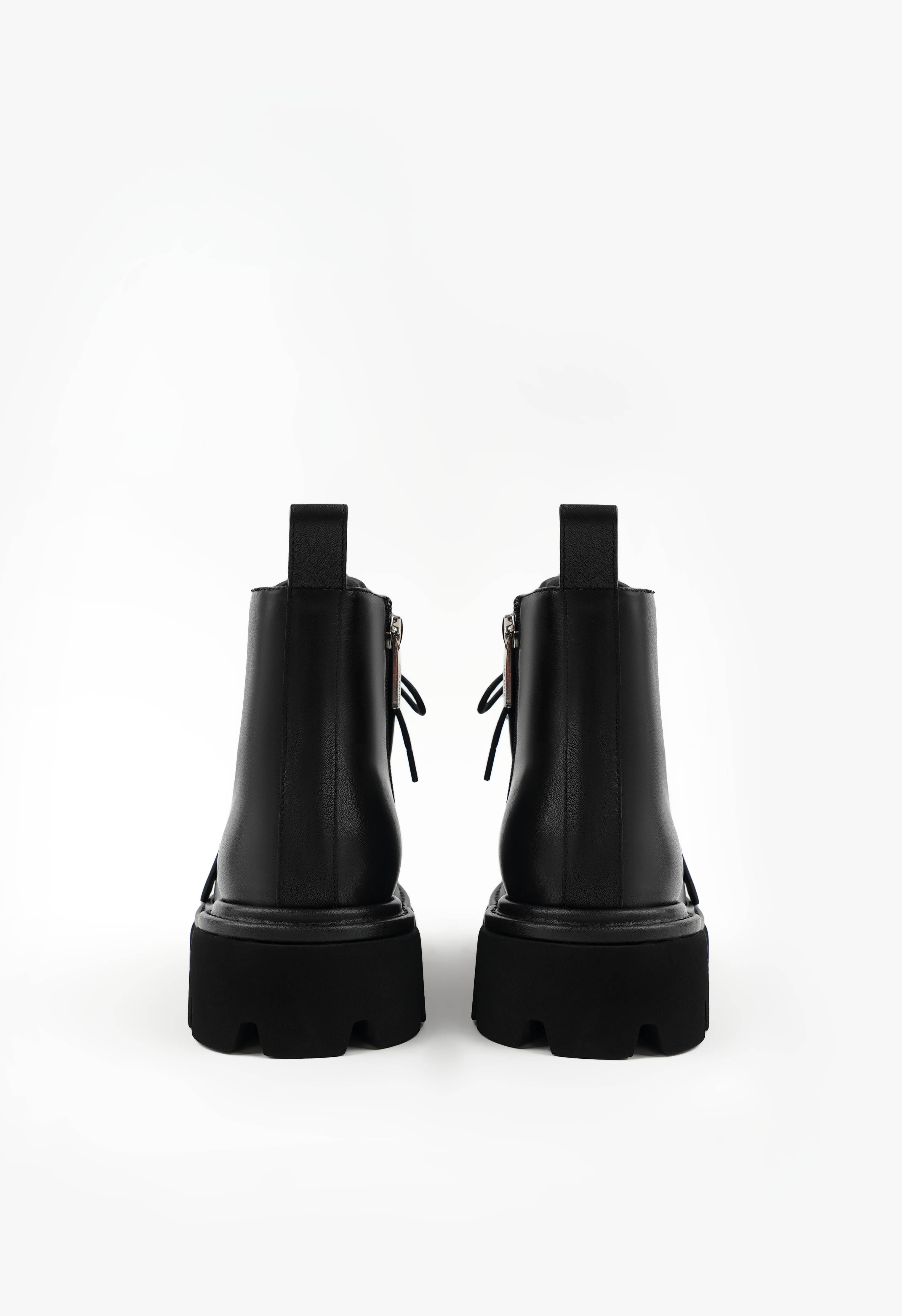 Черные ботинки из натуральной кожи с байкой внутри – это сочетание надежности, комфорта и современного стиля. Жесткая подошва и округлый мысок обеспечивают удобство при ходьбе, а молния в сочетании со шнуровкой позволяет идеально подогнать посадку под ногу. Серебряная фурнитура и широкий каблук добавляют модный акцент, делая модель стильной и универсальной. Эти ботинки станут незаменимой частью повседневного гардероба, легко сочетаясь с классическими и более повседневными образами, подчеркивая вашу уверенность и вкус.