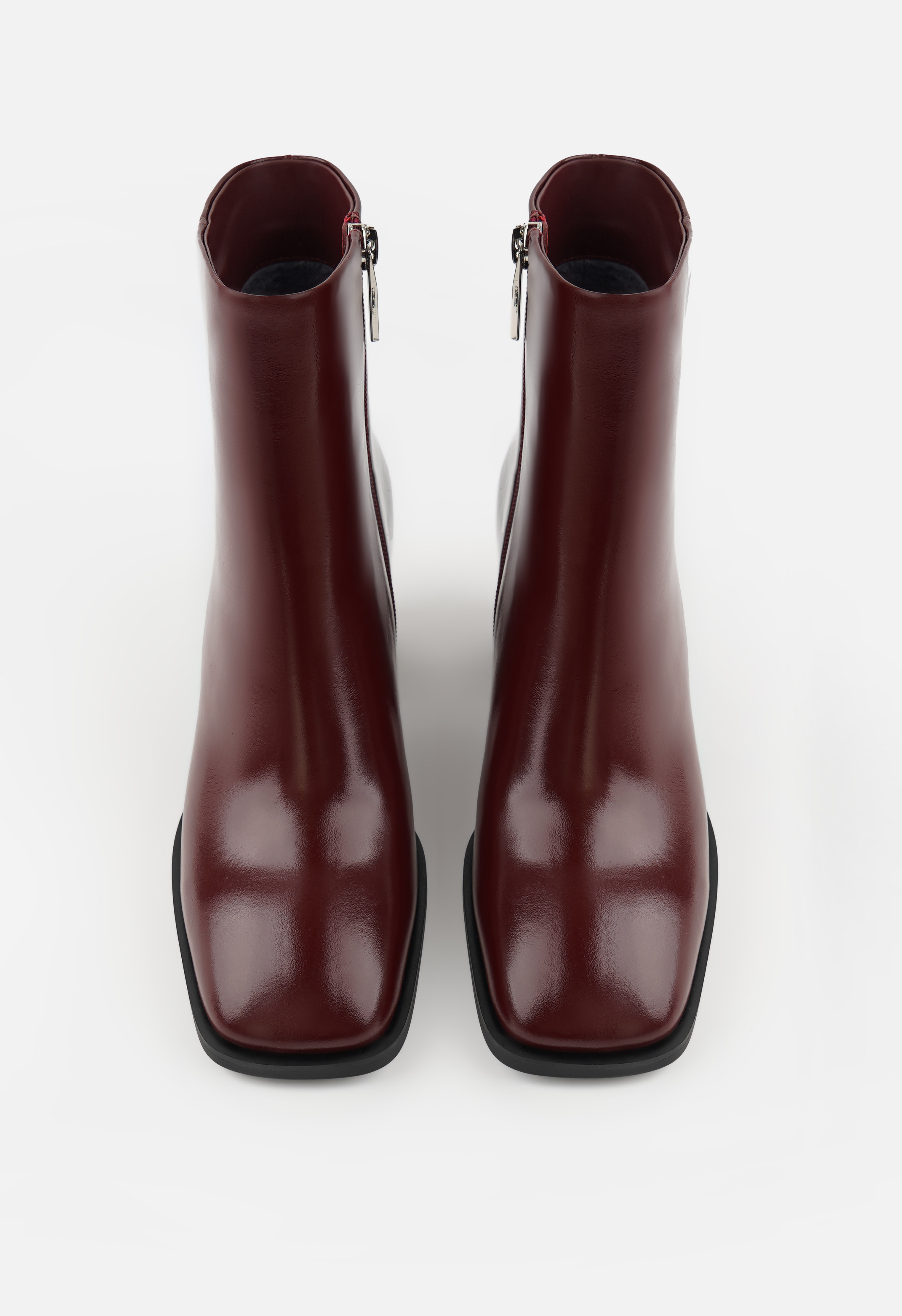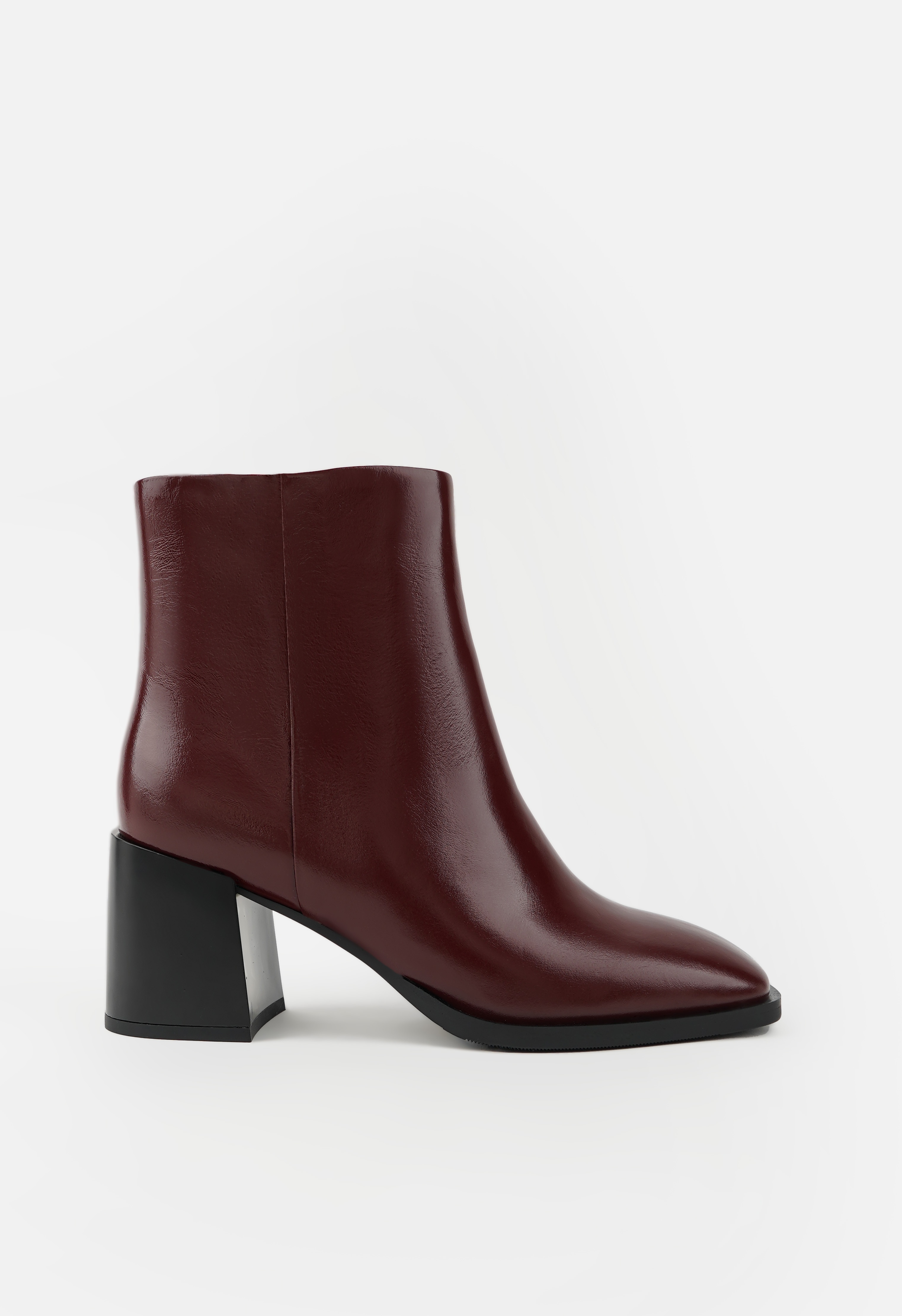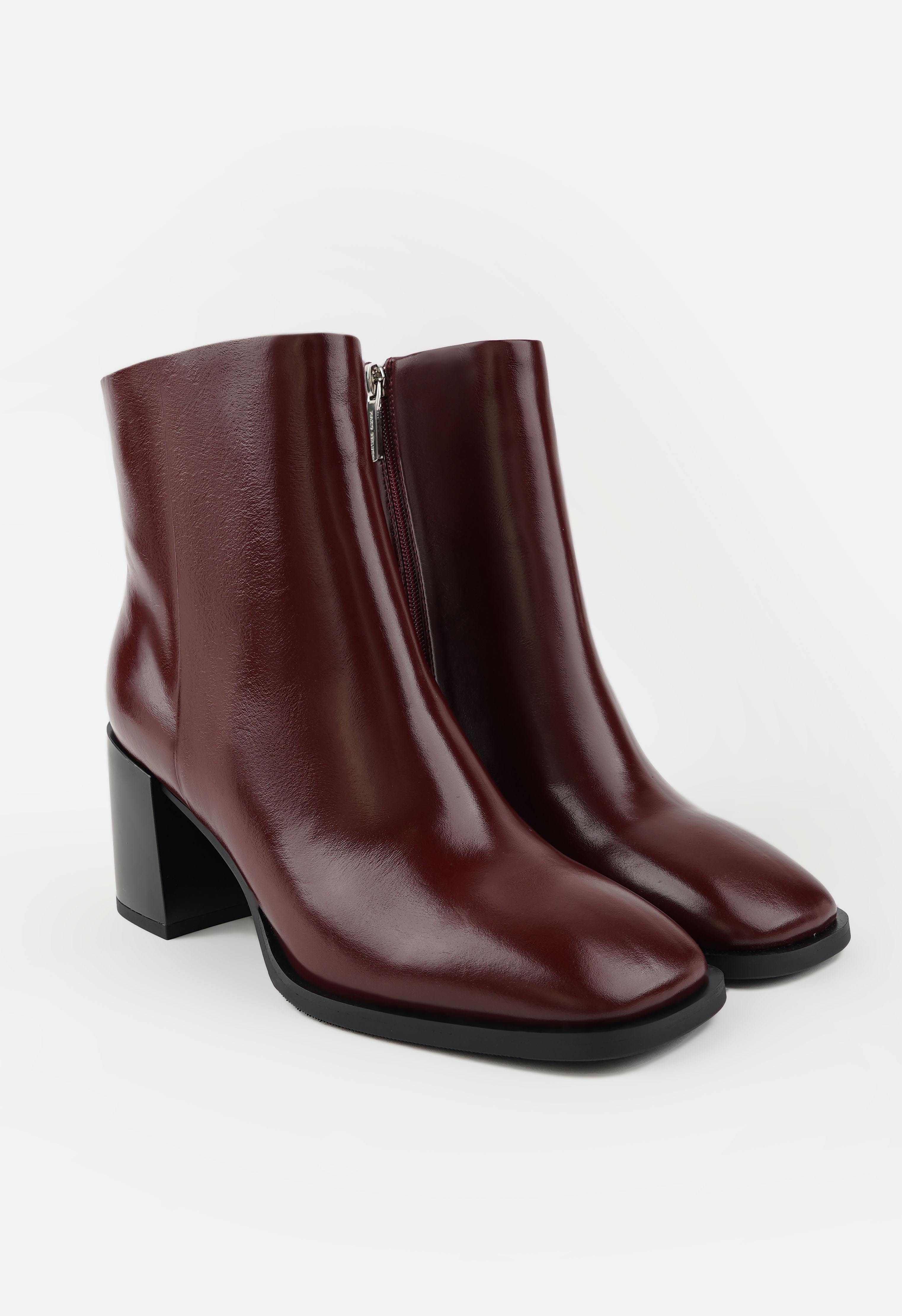Бордовые ботильоны из натуральной лаковой кожи с байковой подкладкой – элегантная и практичная пара для холодного сезона. Жесткая подошва и скошенный каблук обеспечивают устойчивость и комфорт при ходьбе, а квадратный мысок добавляет современный и аккуратный силуэт. Молния делает обувь удобной в надевании, в то время как серебряная фурнитура придает модели стильный акцент. Эти ботильоны легко вписываются как в повседневные, так и в более нарядные образы, подчеркивая утонченность и уверенность вашего стиля.