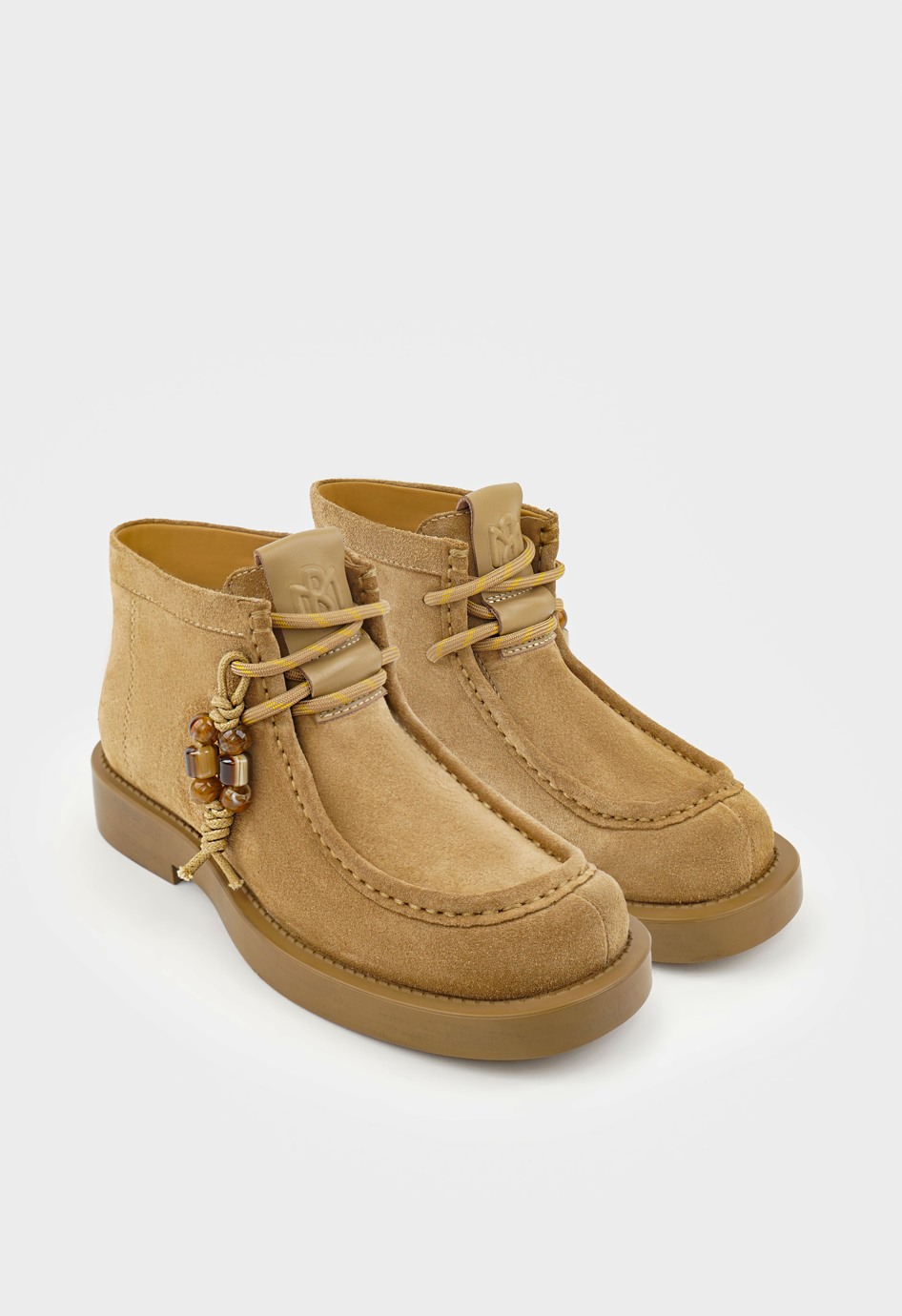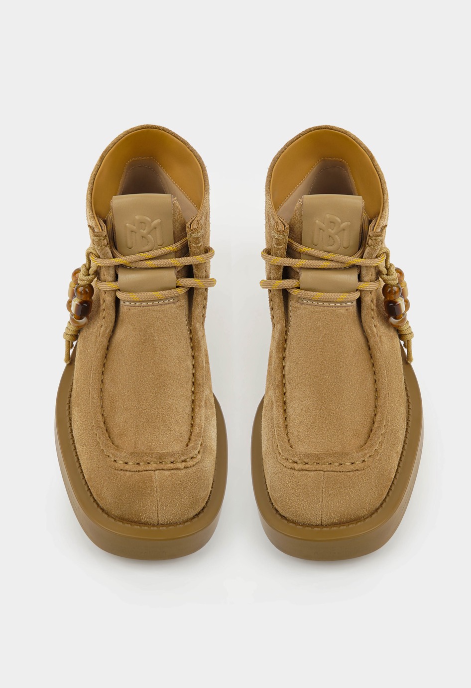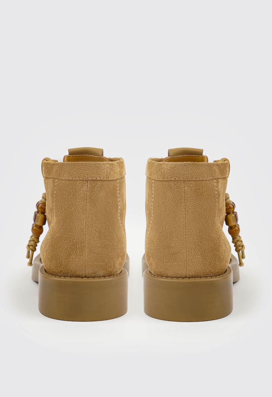 Бежевые ботинки из натуральной замши с теплой байковой подкладкой – идеальный выбор для стильных и уютных осенне-зимних образов. Округлый мысок и массивная платформа придают модели современный характер, а жесткая подошва обеспечивает надежную поддержку и устойчивость на любых поверхностях. Бежевая фурнитура и аккуратная шнуровка добавляют утонченности и позволяют удобно отрегулировать посадку. Эти ботинки прекрасно дополнят повседневные образы с джинсами, брюками или юбками, подчеркивая ваш вкус и заботу о комфорте в любую погоду.