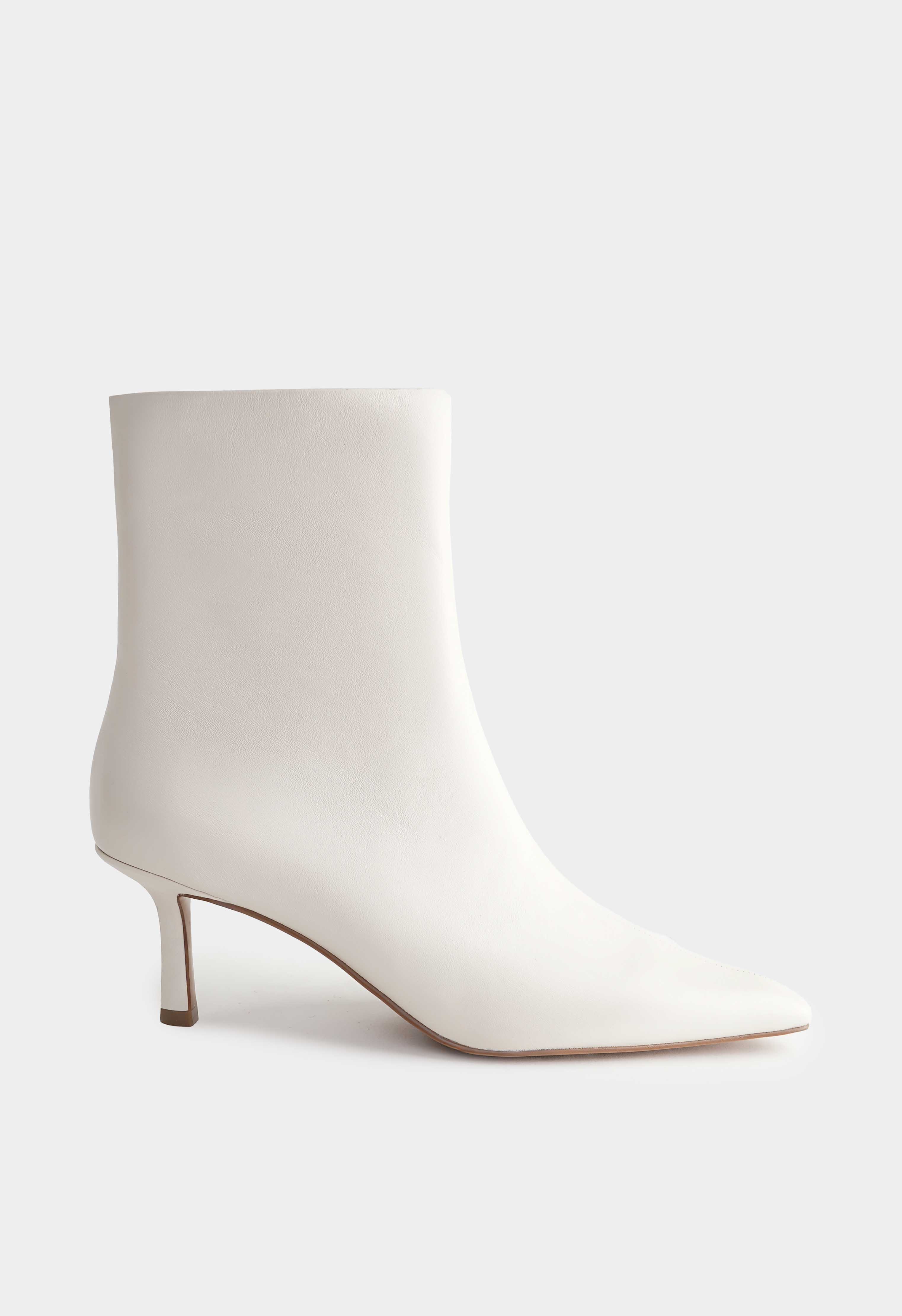 Белые ботильоны из натуральной кожи на молнии – чистая элегантность без лишнего декора, которая всегда выглядит уместно и дорого. Заостренный мысок придает силуэту графичность и визуально вытягивает ногу, а тонкая шпилька добавляет изящной высоты и делает походку более легкой. Гладкая кожа смотрится строго и аккуратно, металлик-фурнитура добавляет сдержанный акцент и подчеркивает качество исполнения. Гибкая подошва поддерживает комфортный шаг и помогает уверенно чувствовать себя в городе.