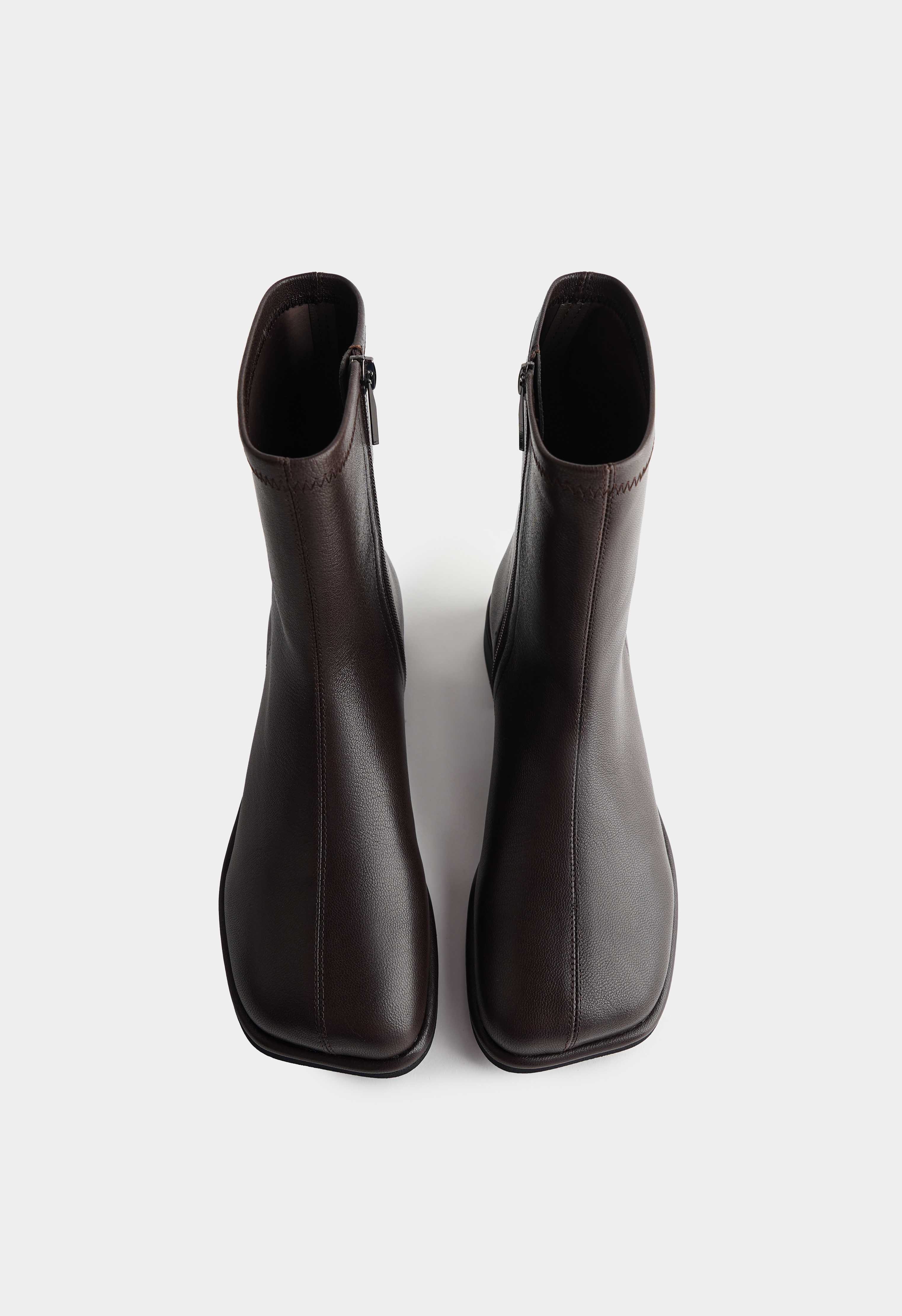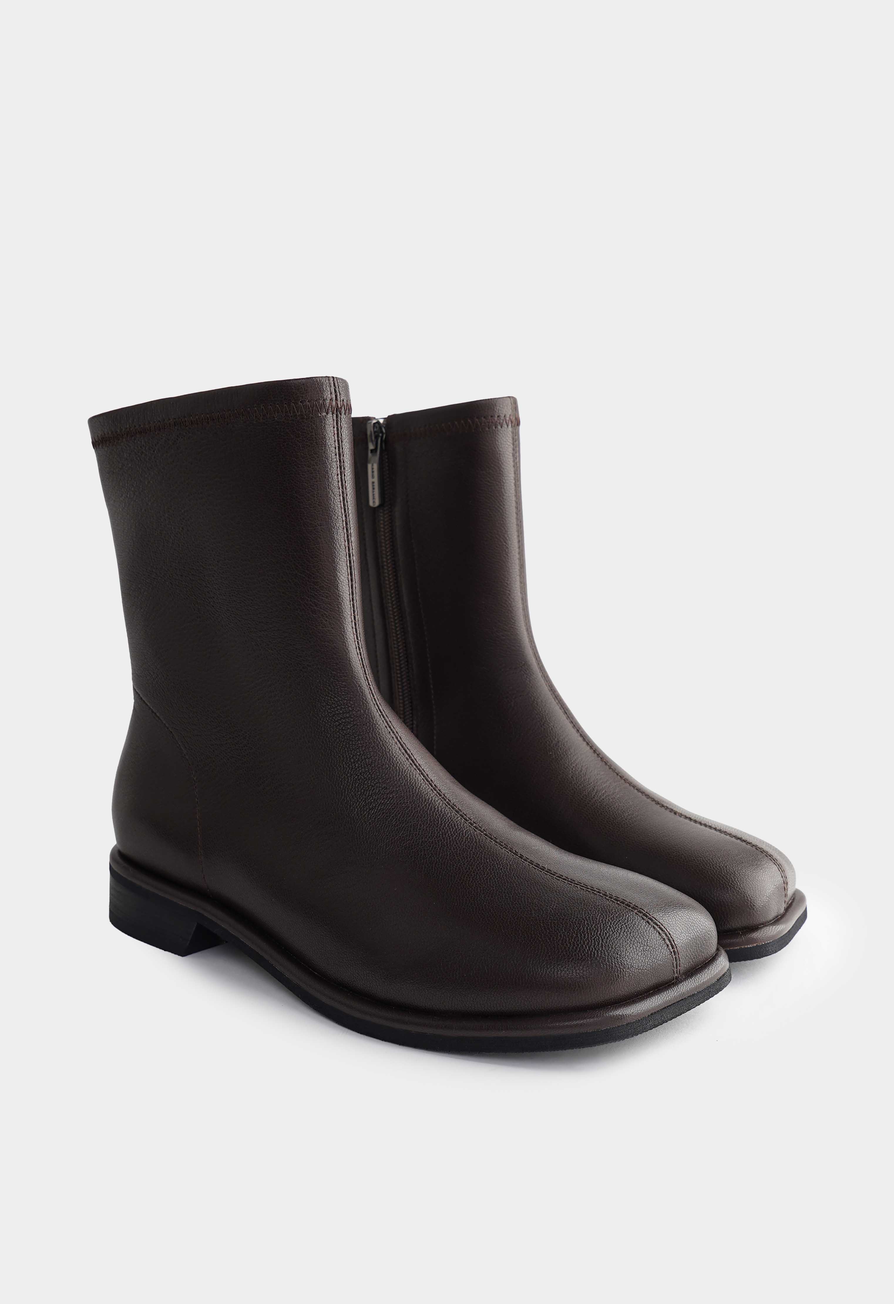 Коричневые полусапоги из натуральной кожи – практичная база на прохладный сезон с аккуратной посадкой и строгим силуэтом. Квадратный мысок придает современную геометрию и добавляет комфорта, а скошенный каблук смотрится собранно и дает устойчивую опору в городе. Молния сбоку делает надевание быстрым и удобным, металлик-фурнитура добавляет тонкий акцент и подчеркивает качество исполнения. Жесткая подошва держит форму и обеспечивает стабильный шаг.