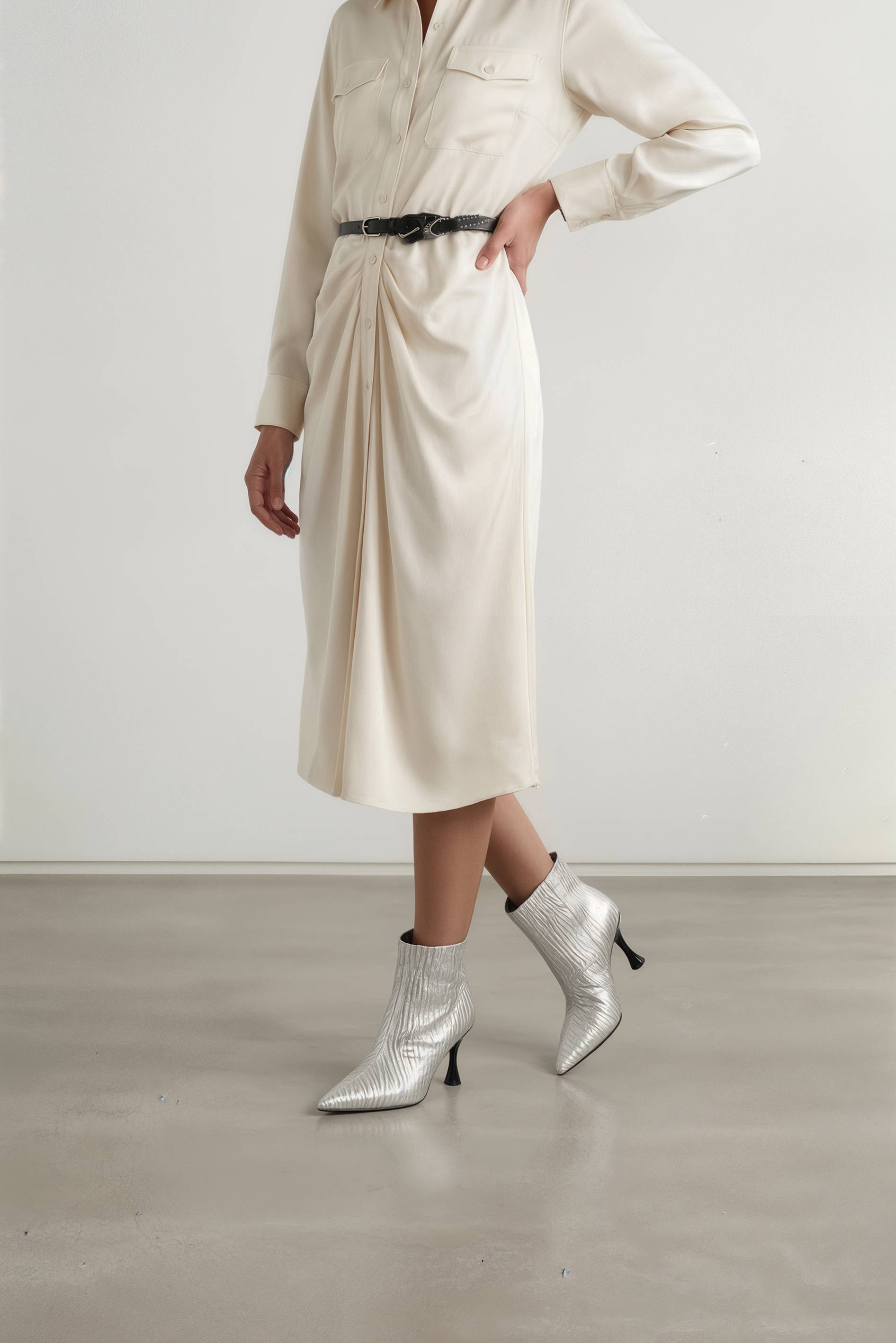 Серебряные ботильоны из натуральной кожи – эффектная пара, которая мгновенно делает образ ярким и статусным. Мерцающая фактура кожи красиво играет на свету и подчеркивает премиальный характер модели. Заостренный мысок визуально вытягивает силуэт и добавляет утонченности, а изящная шпилька делает линию ноги более стройной и выразительной. Гибкая подошва поддерживает комфортный шаг и легкость движений, поэтому ботильоны подходят и для мероприятий, и для стильных городских выходов.