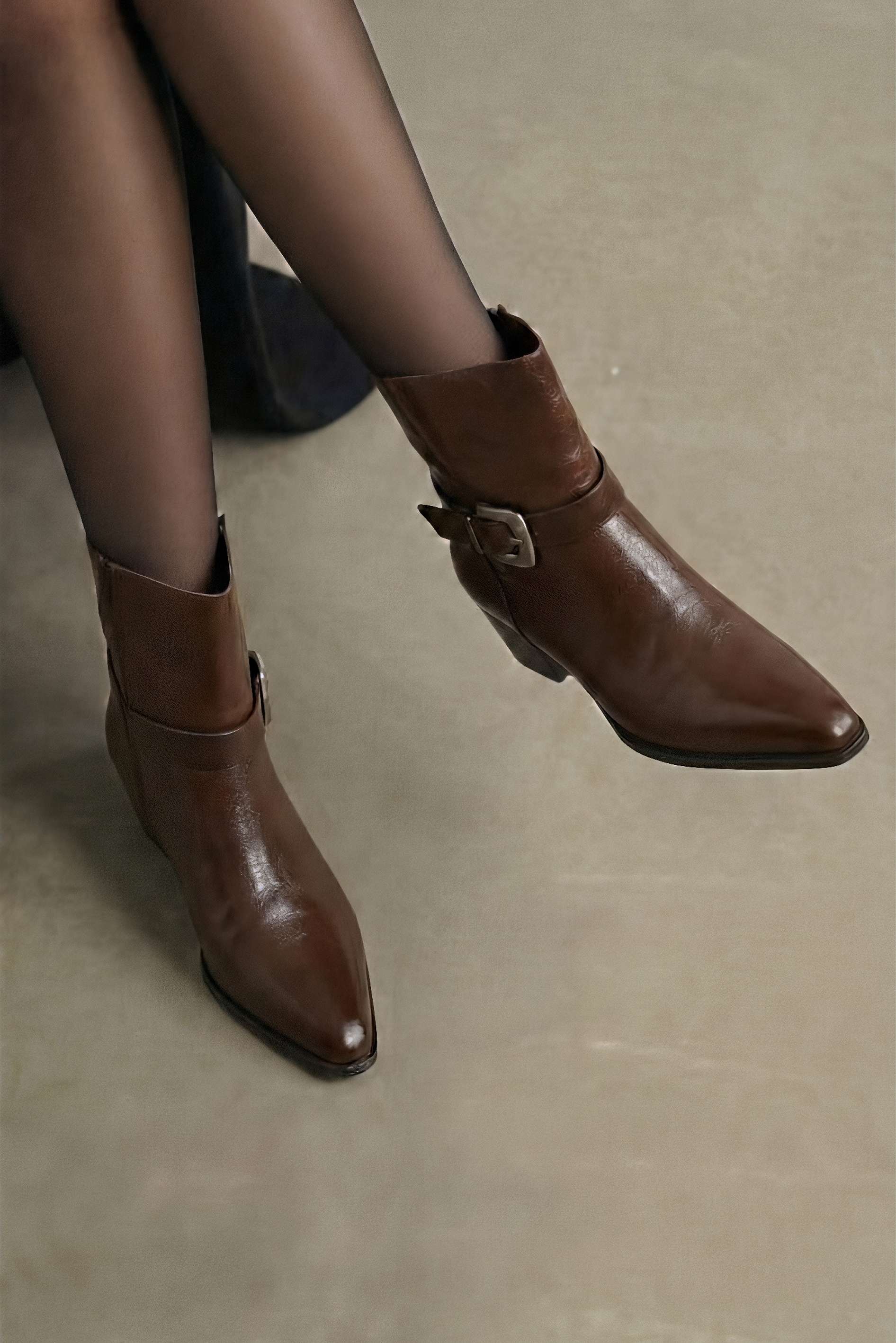 Элегантные коричневые ботильоны из натуральной кожи добавляют образу характер и выглядят по-настоящему статусно. Заостренный мысок визуально вытягивает силуэт и делает линию ноги более изящной, а устойчивый скошенный каблук дает уверенную опору и комфорт на каждый день. Практичная застежка липучке и пряжке не только надежно фиксирует посадку, но и служит стильным акцентом с эффектной серебряной фурнитурой. Гибкая подошва помогает шагать мягче и легче, делая каждый выход легким и свободным.