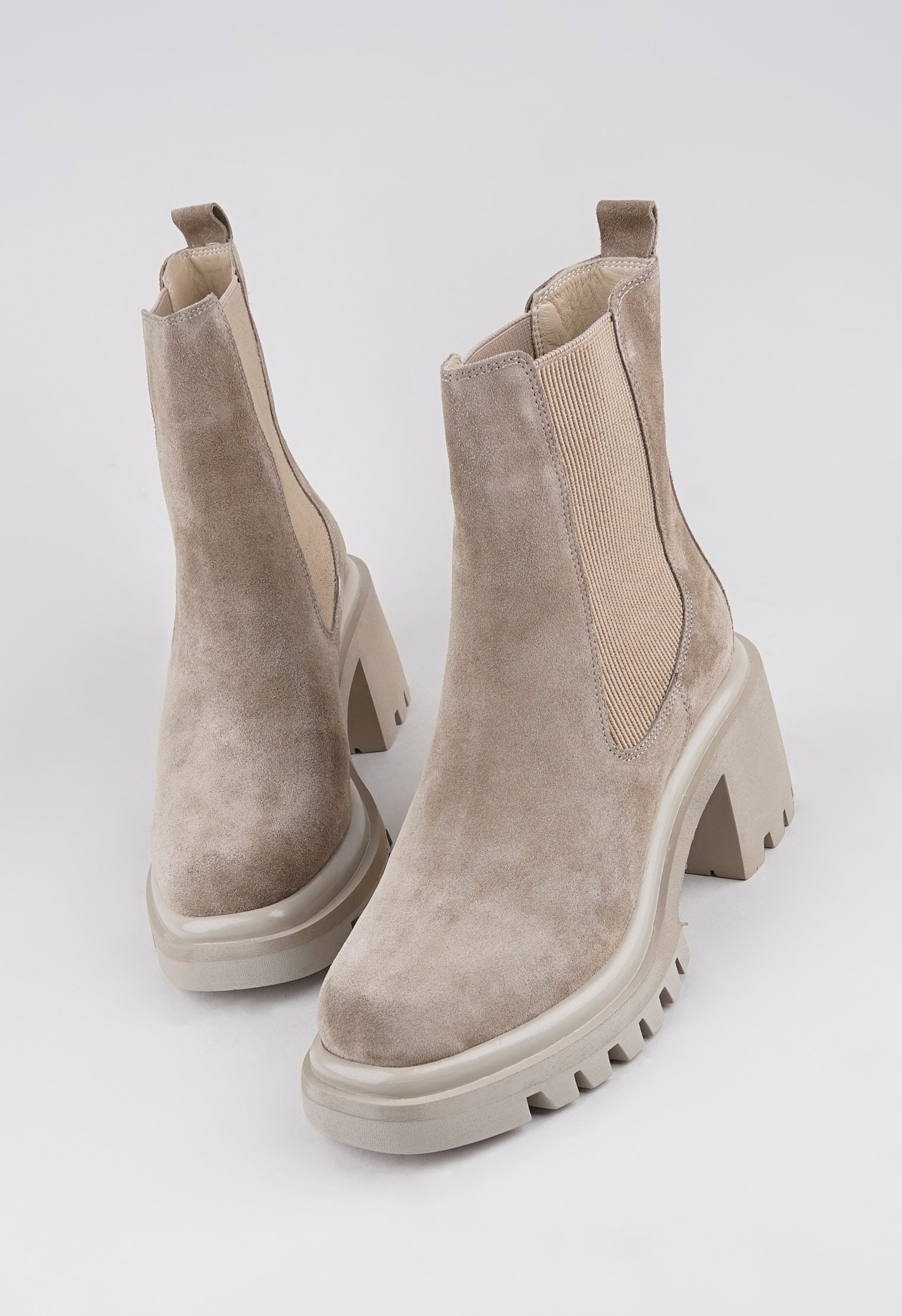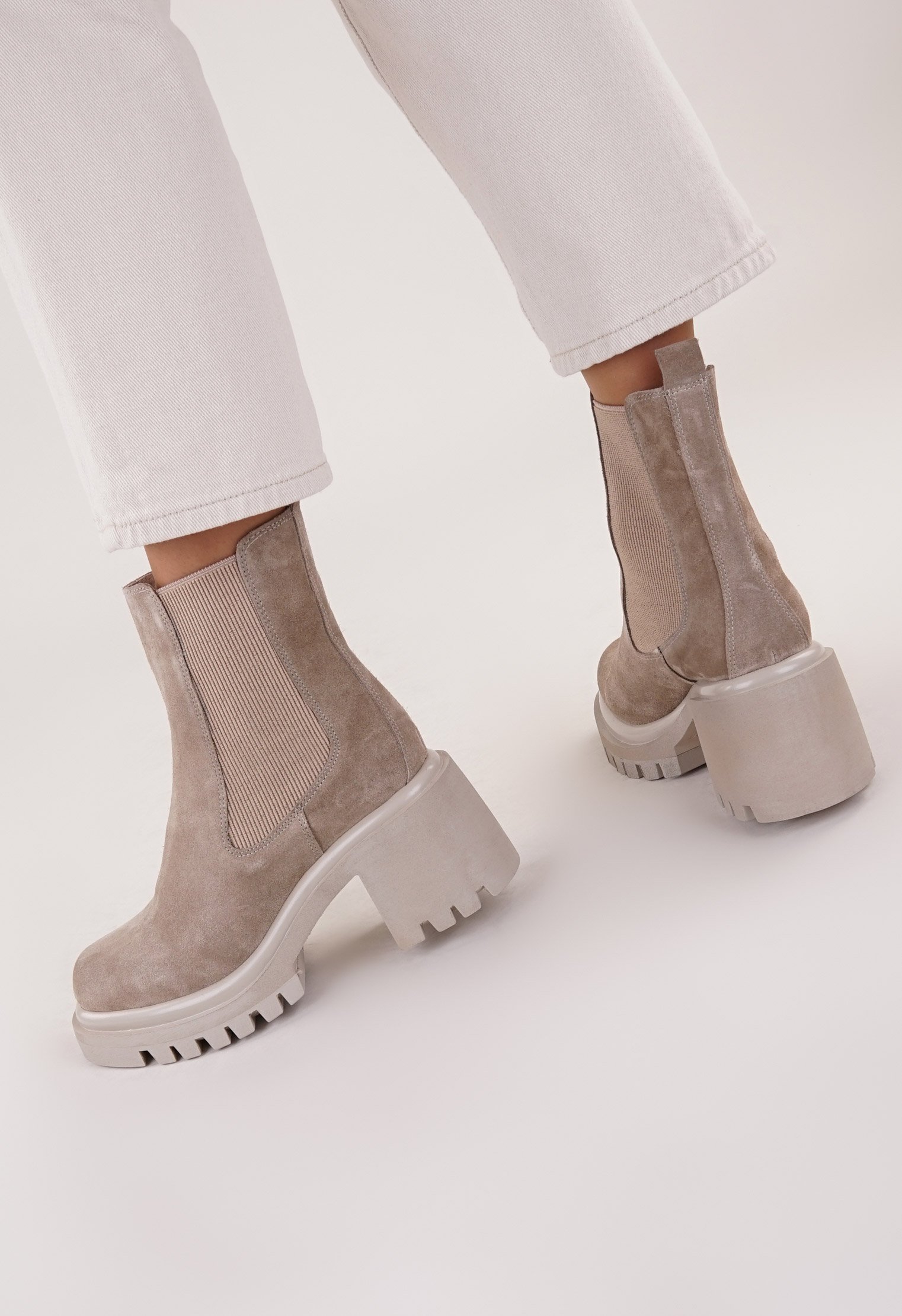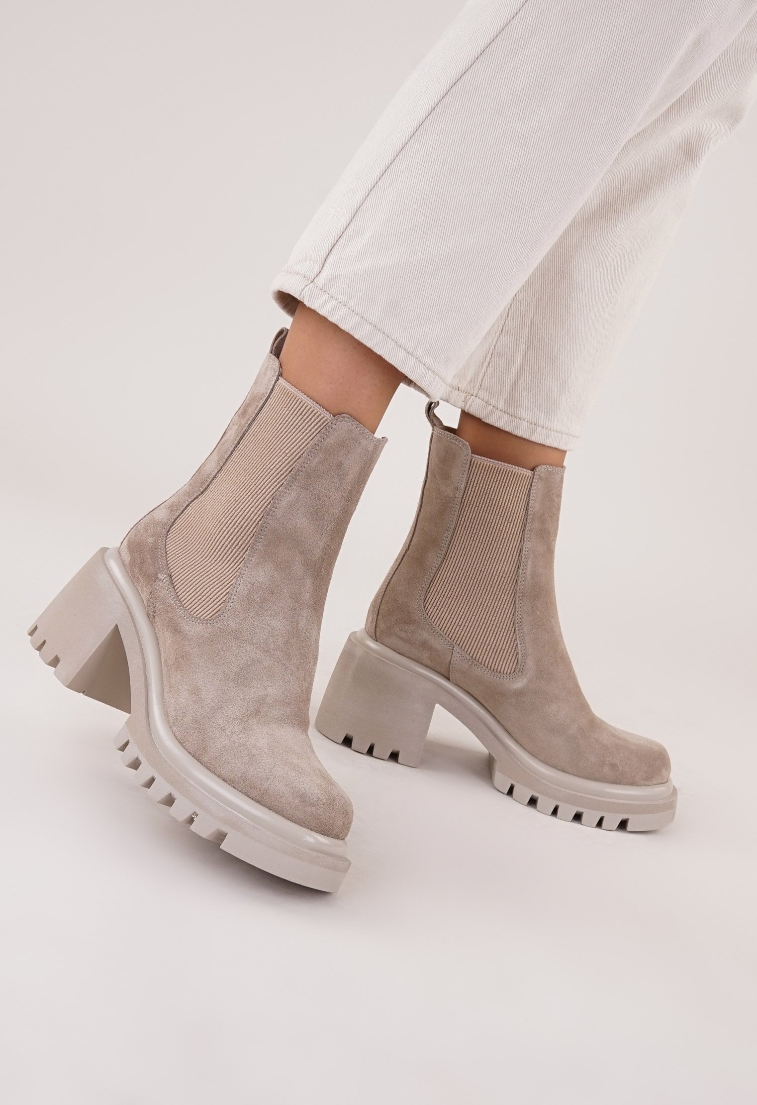 Бежевый цвет отлично сочетается в любом луке, замша достаточно мягкая, ступне комфортно, не сдавливает, садится по ноге. Благодаря вставке-резинке на щиколотке модель легко обувается.