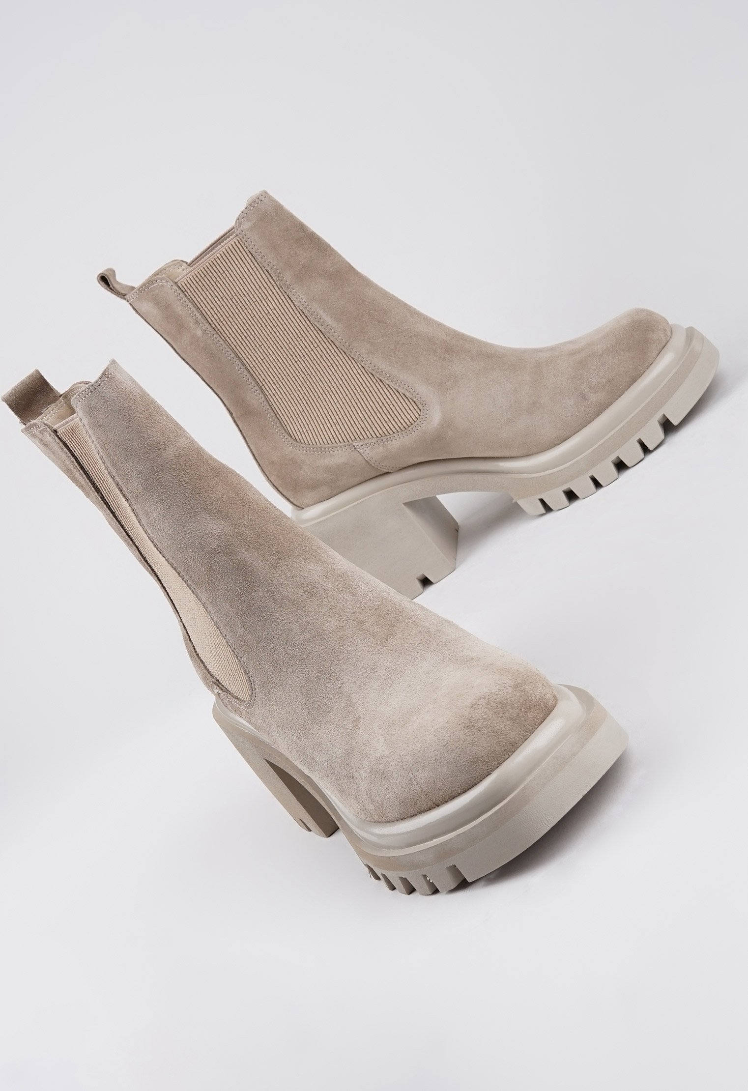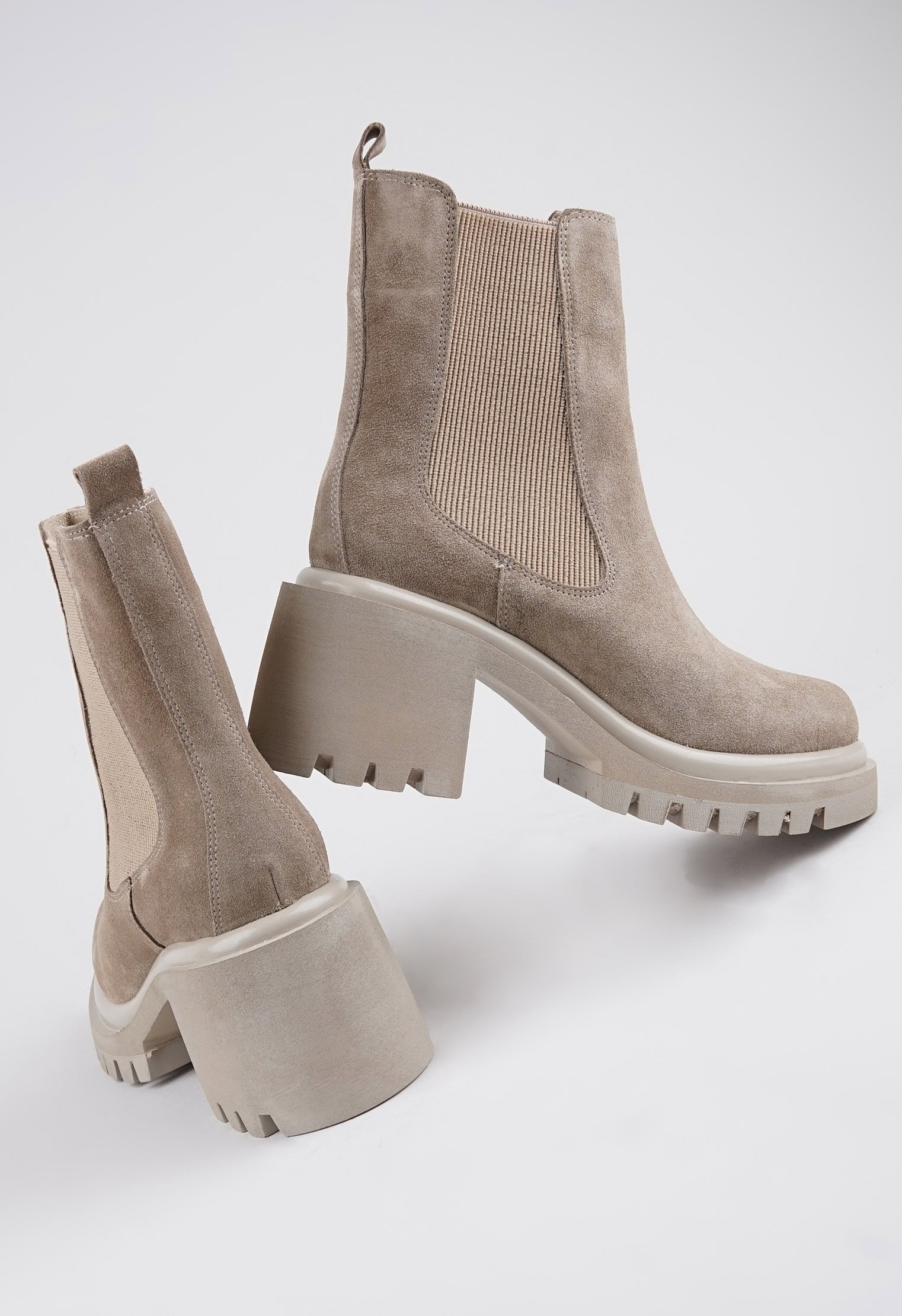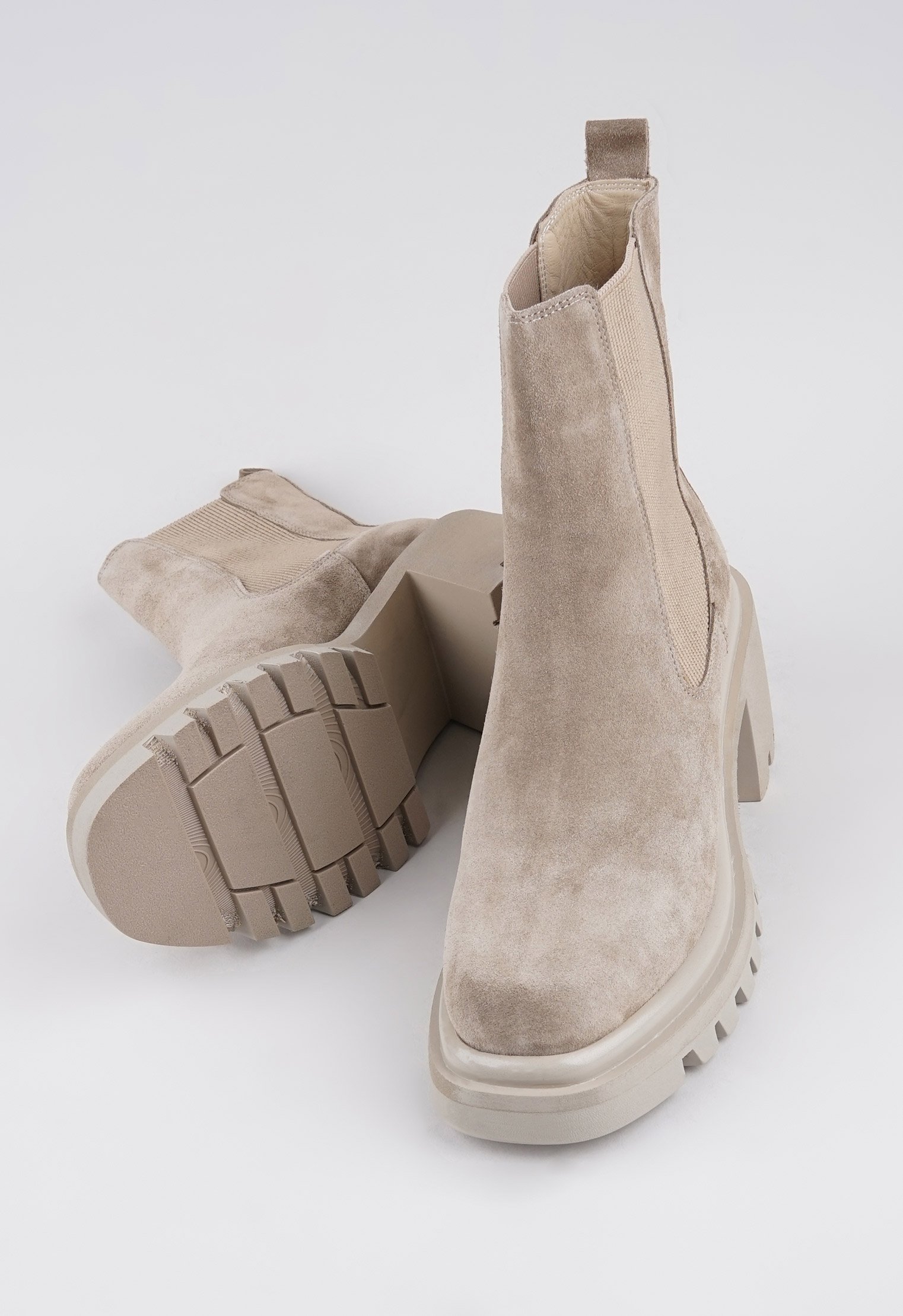 Бежевый цвет отлично сочетается в любом луке, замша достаточно мягкая, ступне комфортно, не сдавливает, садится по ноге. Благодаря вставке-резинке на щиколотке модель легко обувается.
