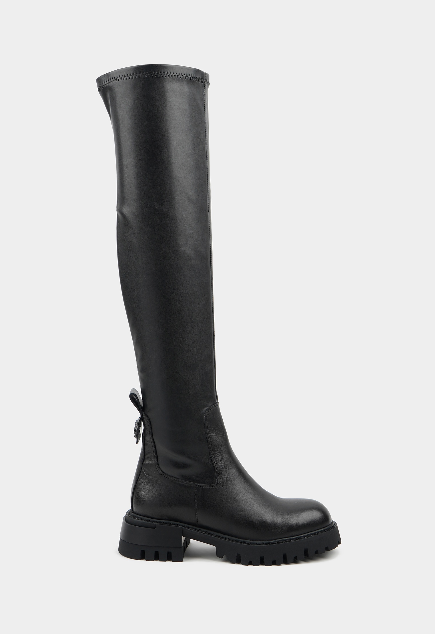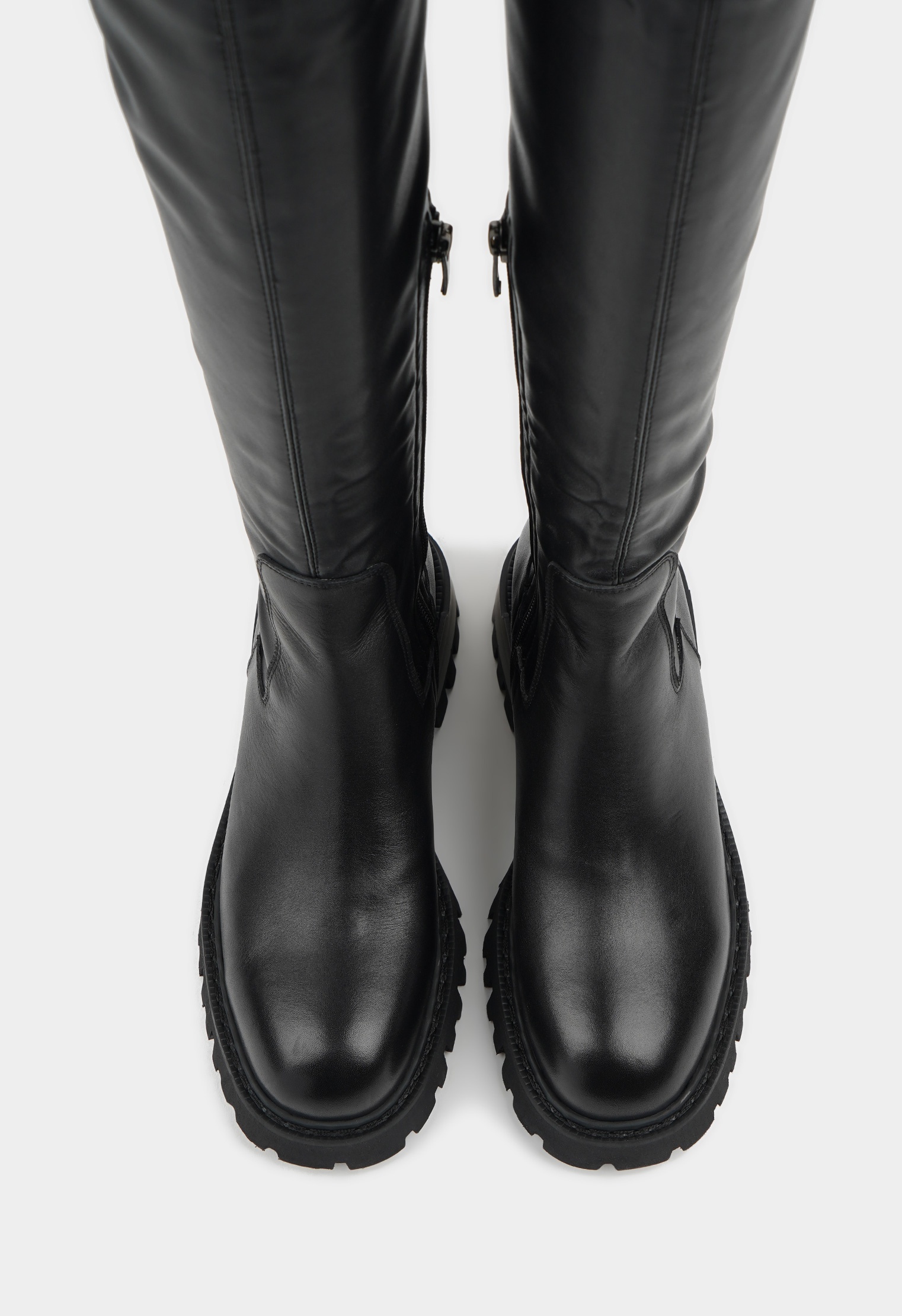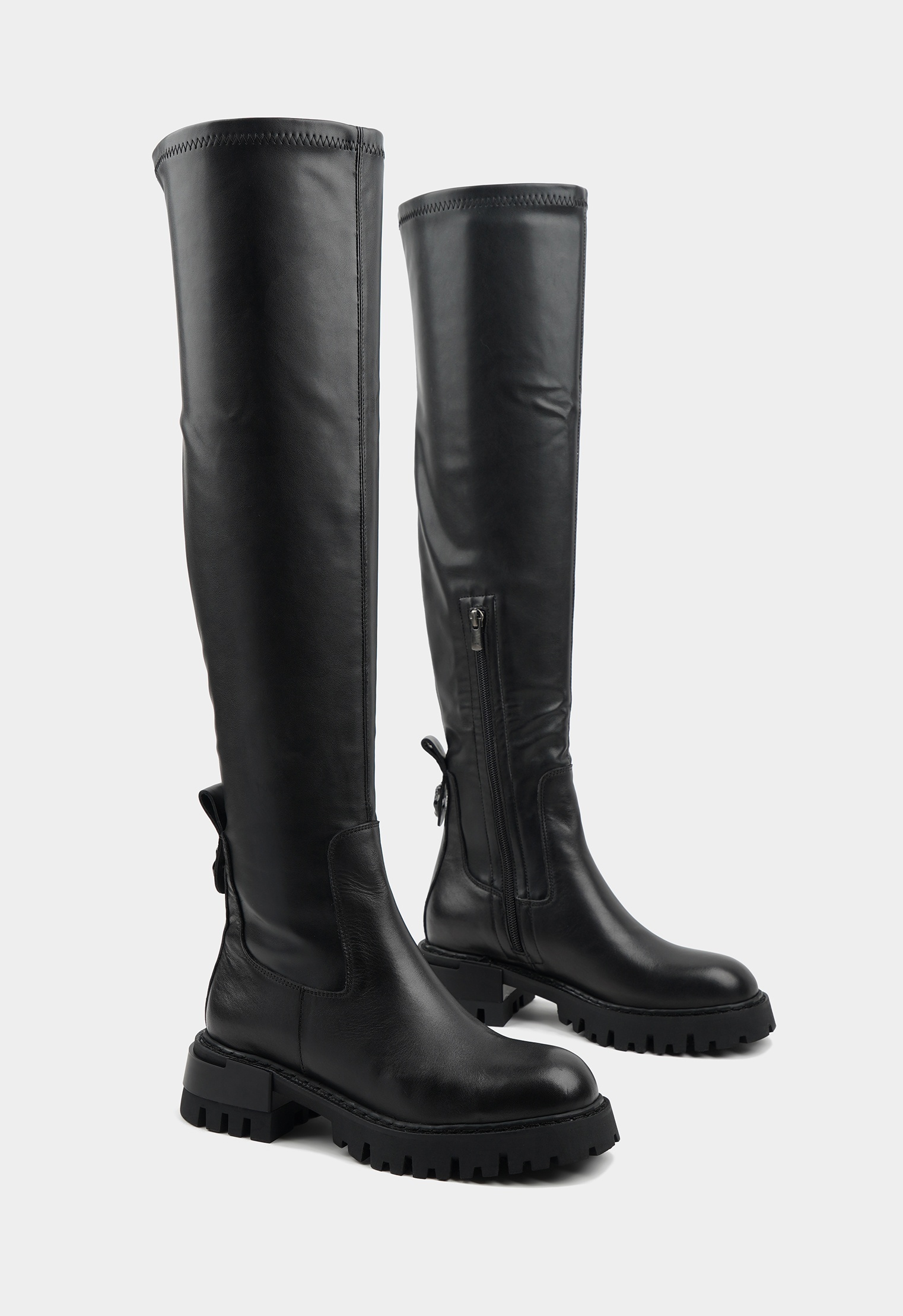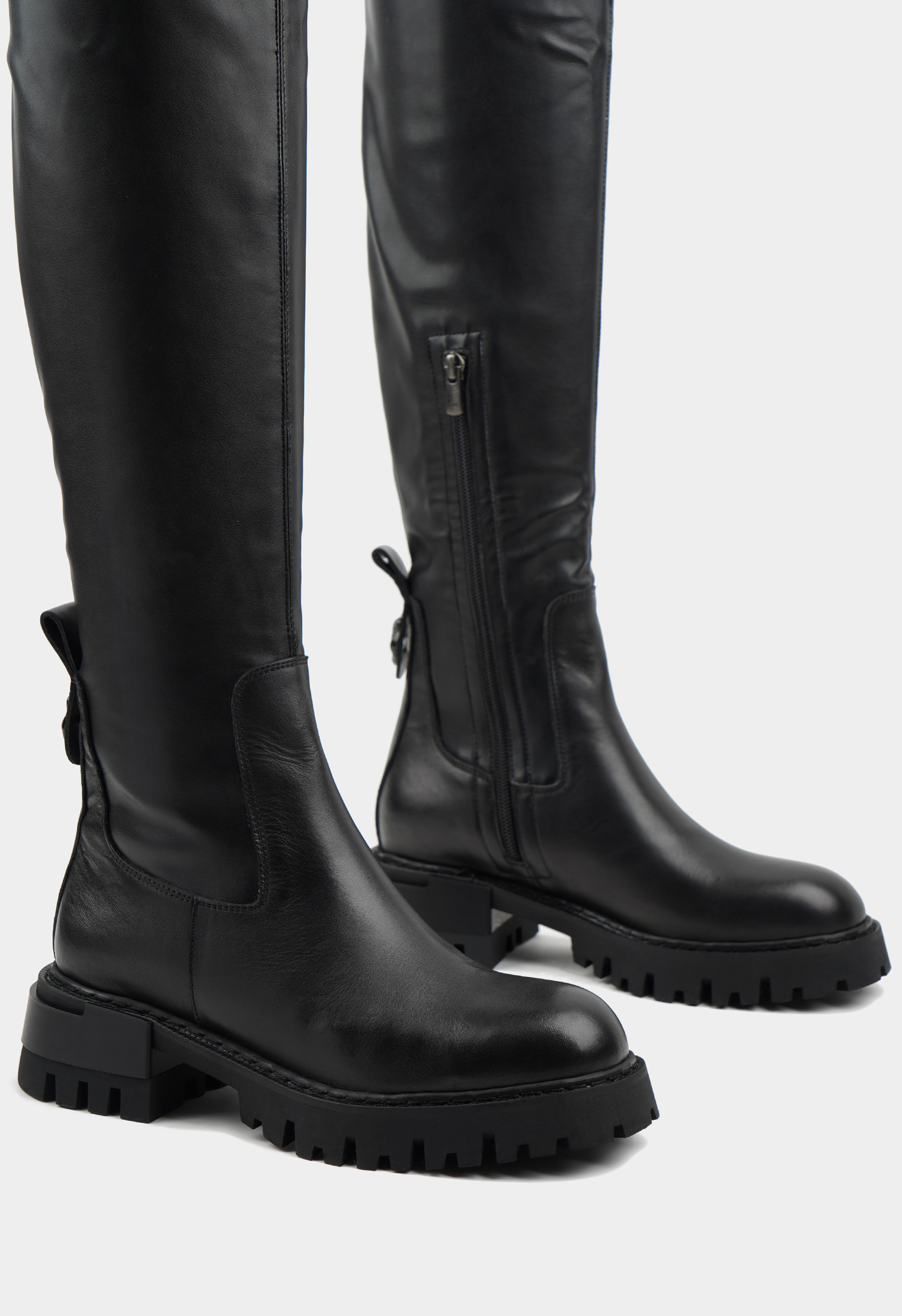 Выбрала на зиму такие сапоги, очень эффектные, для всех кто любит кожу. толстая подошва, приличный меховой слой. выглядят очень стильно и дорого. по размеру все подошло, не маломерки. качество на 5.