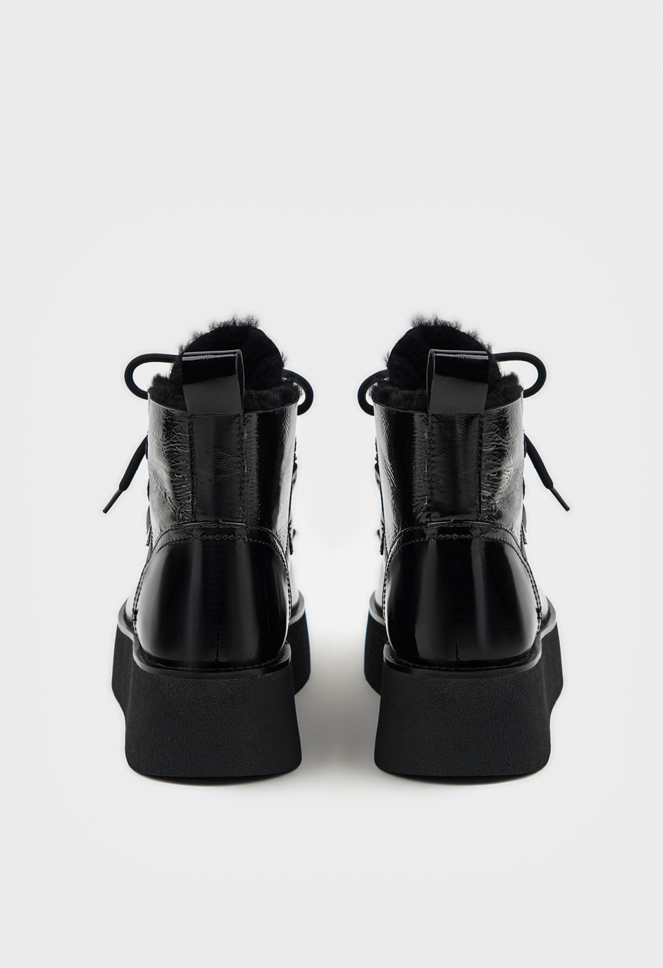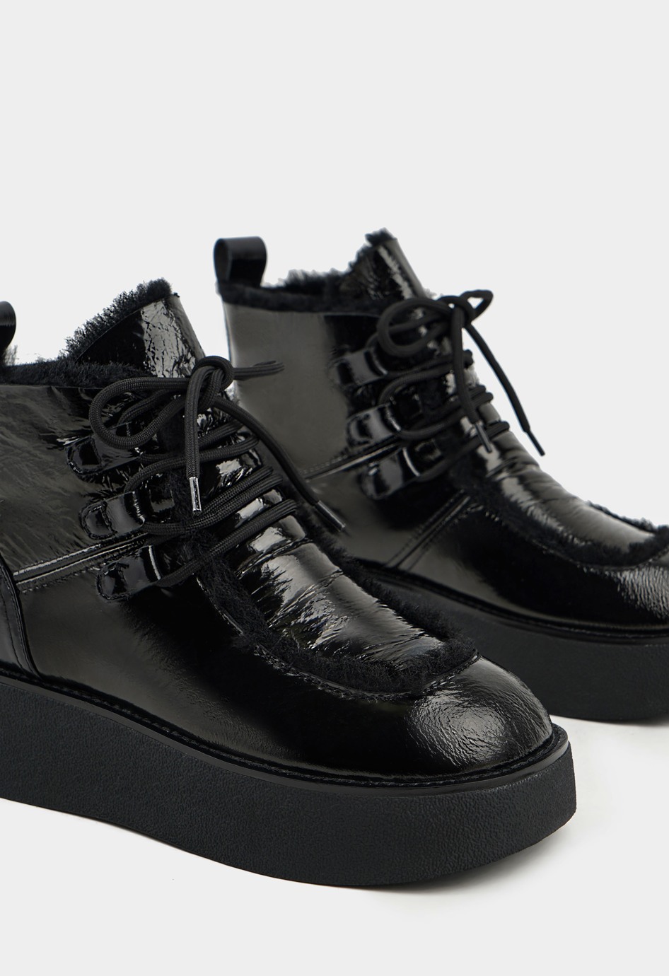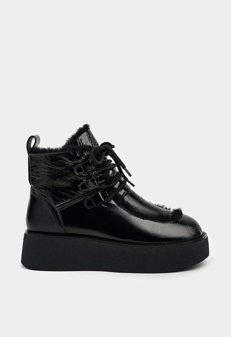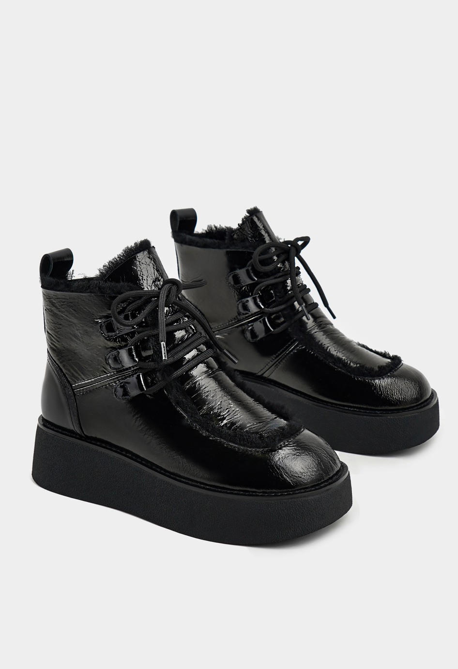 Современные угги на меховой подкладке станут незаменимой базовой зимней парой - они прекрасно сохряняют тепло, удобно надеваются и комфортно сидят на ноге. Лаковая кожа чёрного цвета и шнуровка придают модели нотку утончённости, а благодаря жёсткой полимерной платформе модель будет устойчива даже на льду. Чтобы выбрать наиболее комфортную модель, соответствующую вашим анатомическим особенностям, следует учесть полноту модели и характеристики стопы. Более подробную информацию по выбору размера и об особенностях модели предоставит наш менеджер.