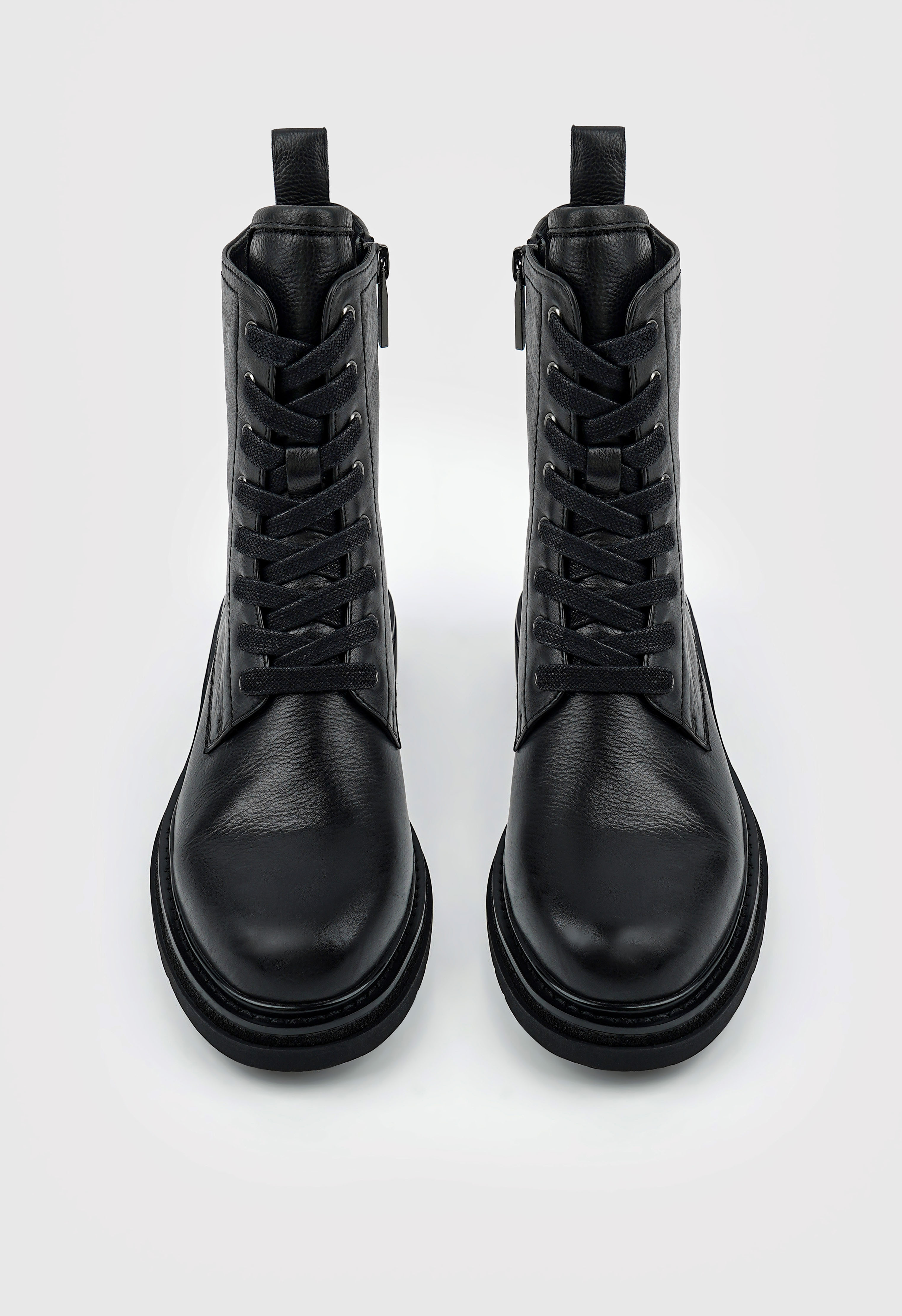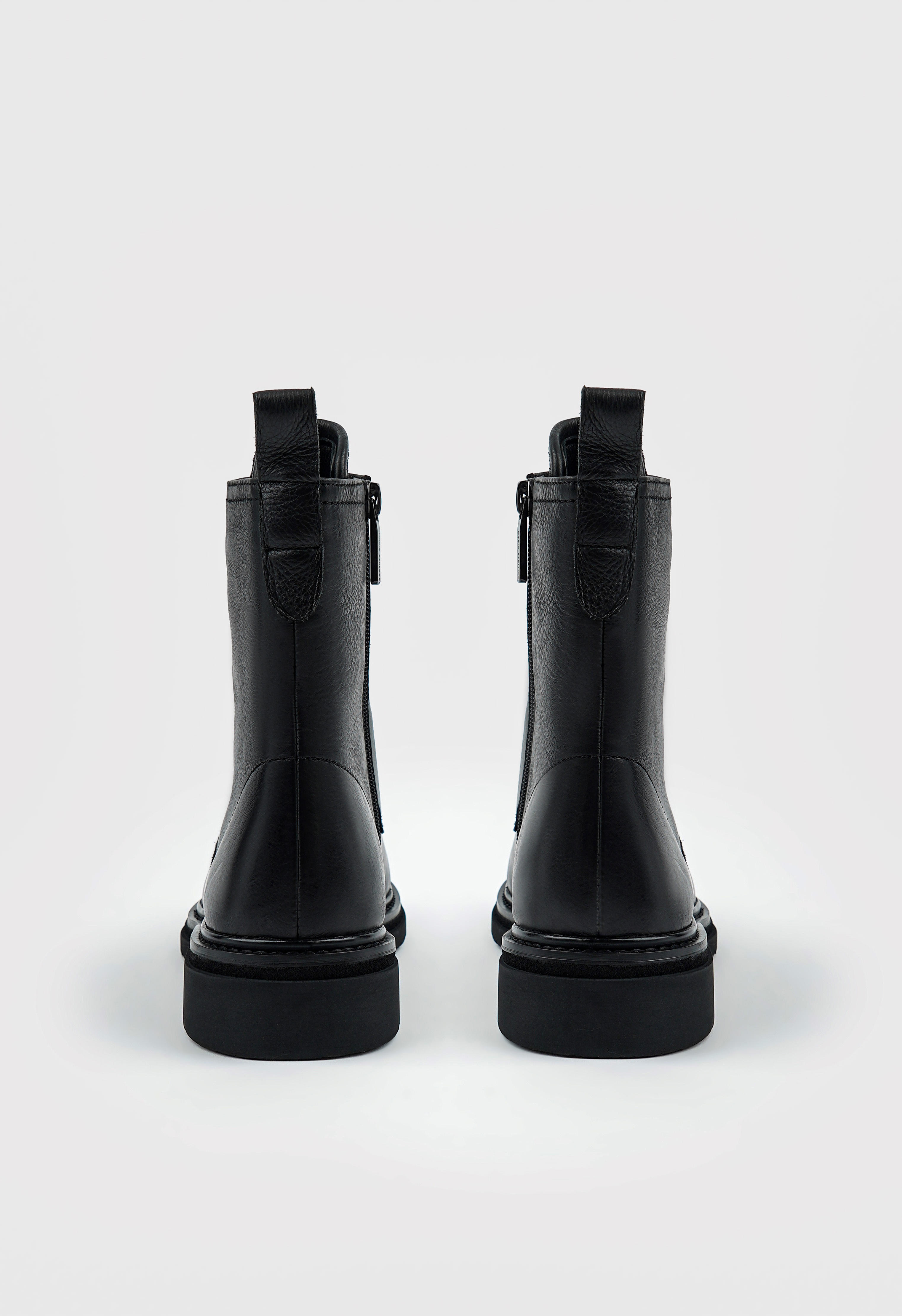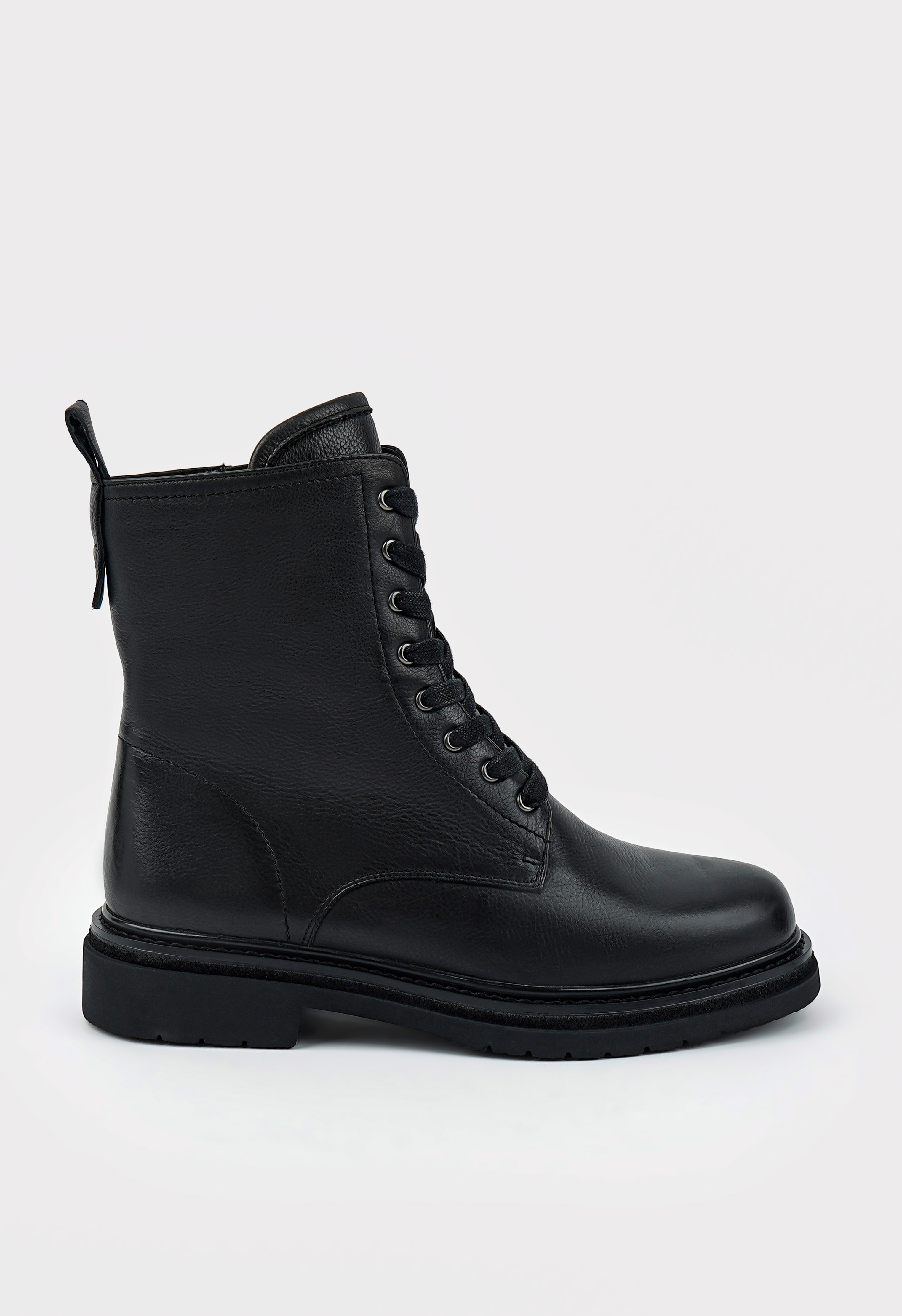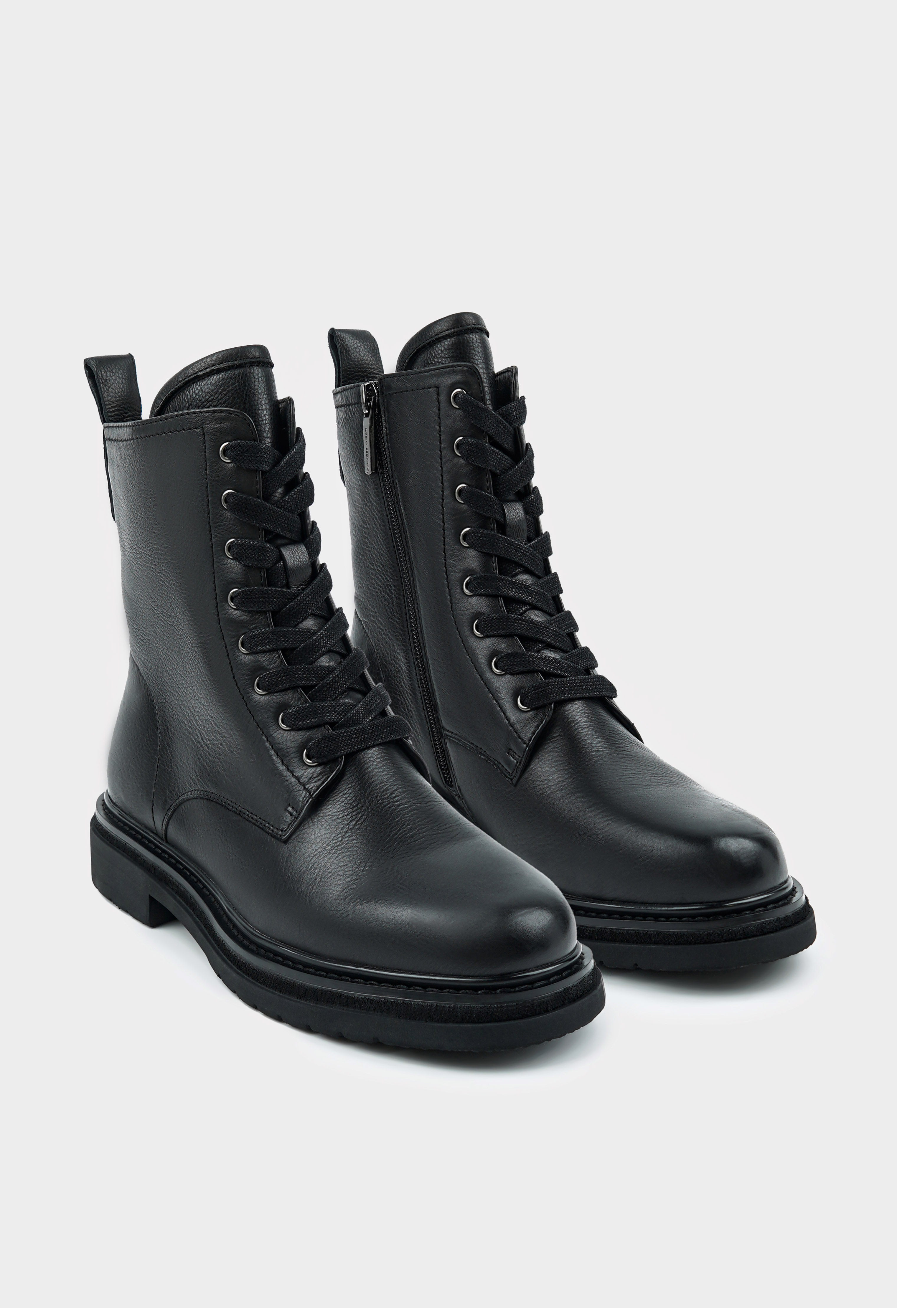Черные ботинки из натуральной кожи с натуральным мехом внутри подарят тепло и уверенность в холодный сезон. Округлый мысок придает модели классический и аккуратный вид, а жесткая подошва с широким каблуком обеспечивает отличную устойчивость и комфорт при ходьбе. Шнуровка в паре с молнией позволяет легко надевать обувь и точно подгонять ее по ноге, а металлическая фурнитура добавляет стильный акцент. Эти ботинки станут универсальной парой на каждый день – идеально подойдут для прогулок по городу и отлично впишутся в современный гардероб.