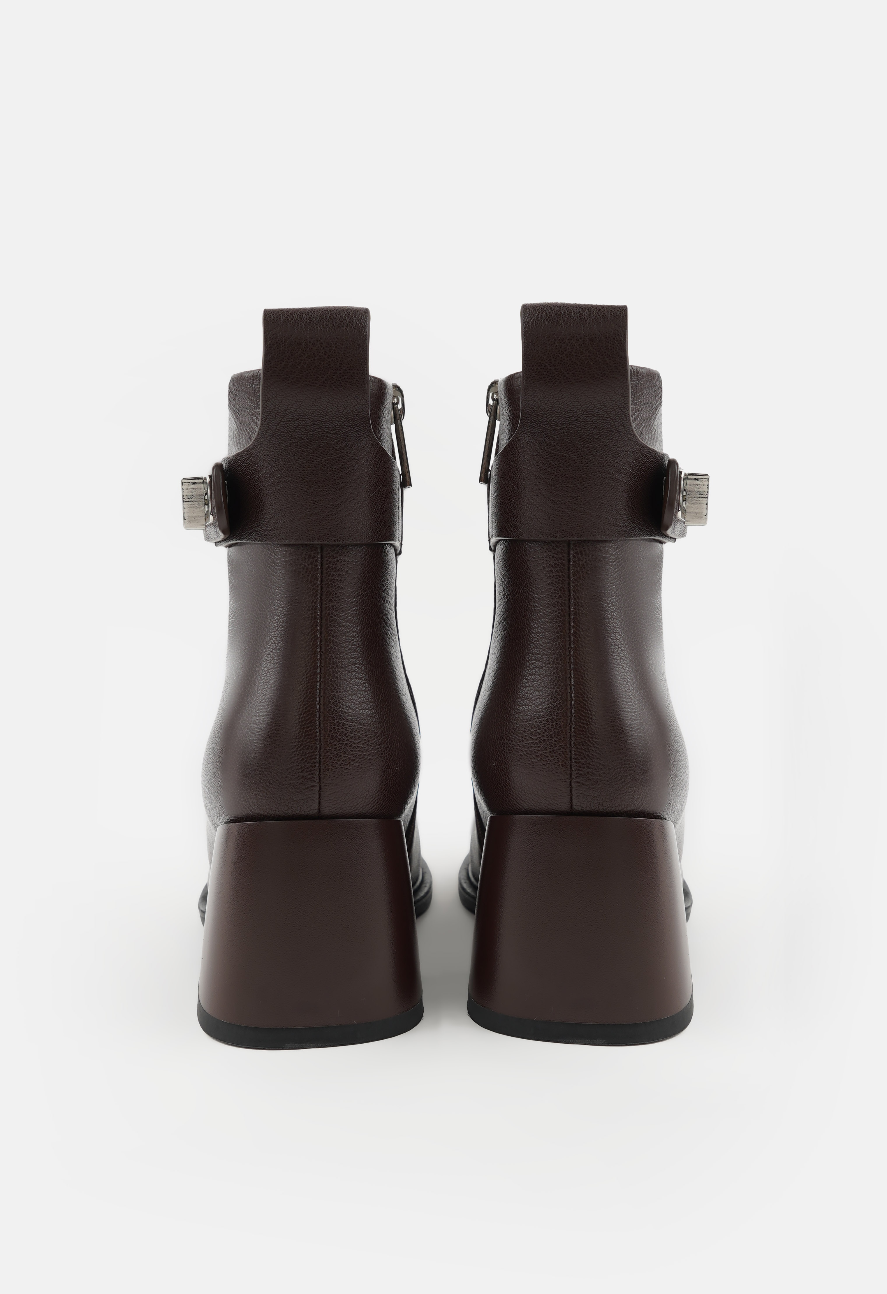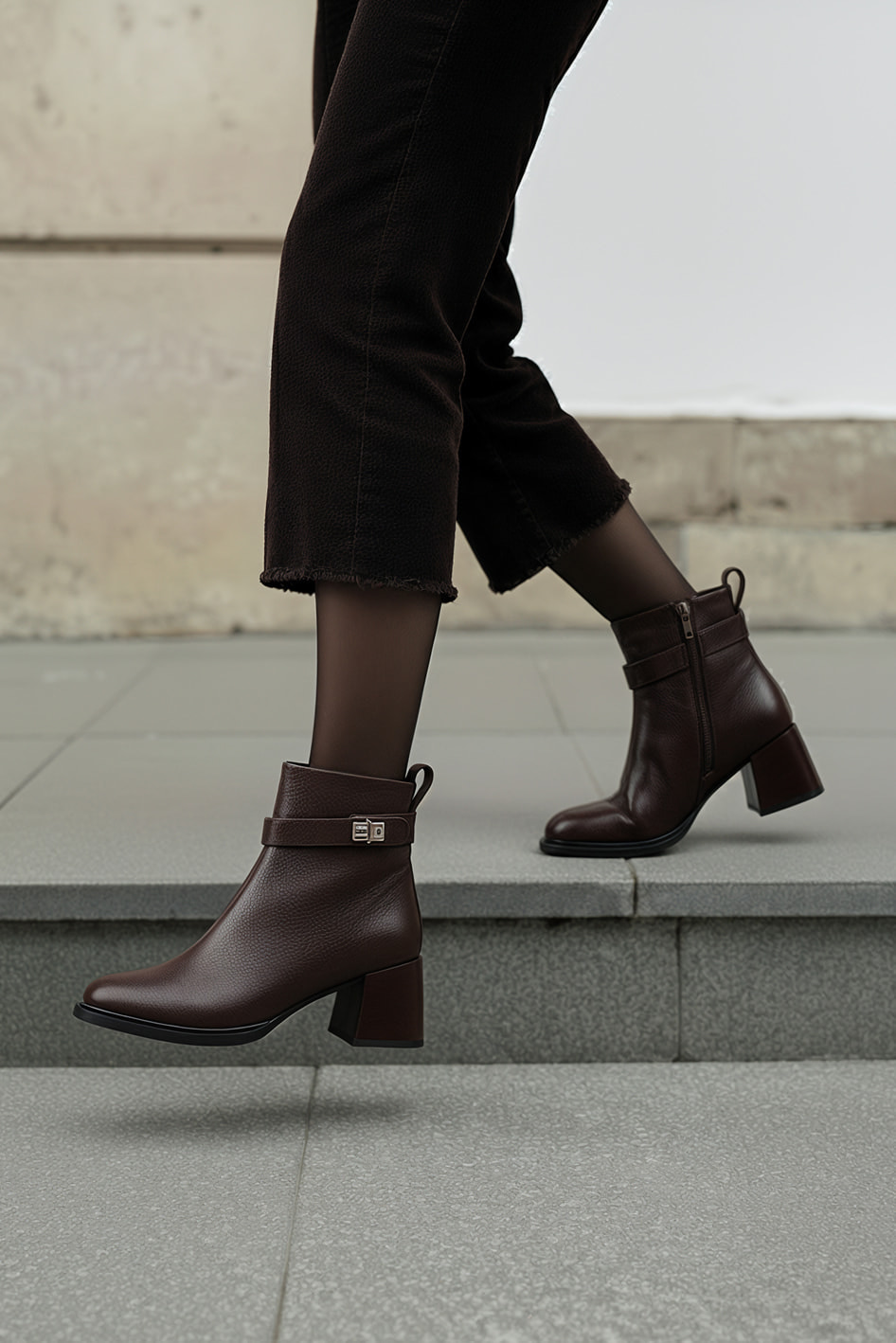 Коричневые ботильоны из натуральной кожи с подкладкой из мягкого натурального меха – элегантная и удобная модель для холодного сезона. Гибкая подошва и трапециевидный каблук обеспечивают легкость и уверенность при каждом шаге, а округлый мысок делает обувь практичной для повседневной носки. Молния облегчает обувание, в то время как серебряная фурнитура добавляет современный акцент, подчеркивая стиль и утонченность модели. Эти ботильоны станут универсальной парой, гармонично сочетая комфорт, практичность и элегантность в любом образе.
